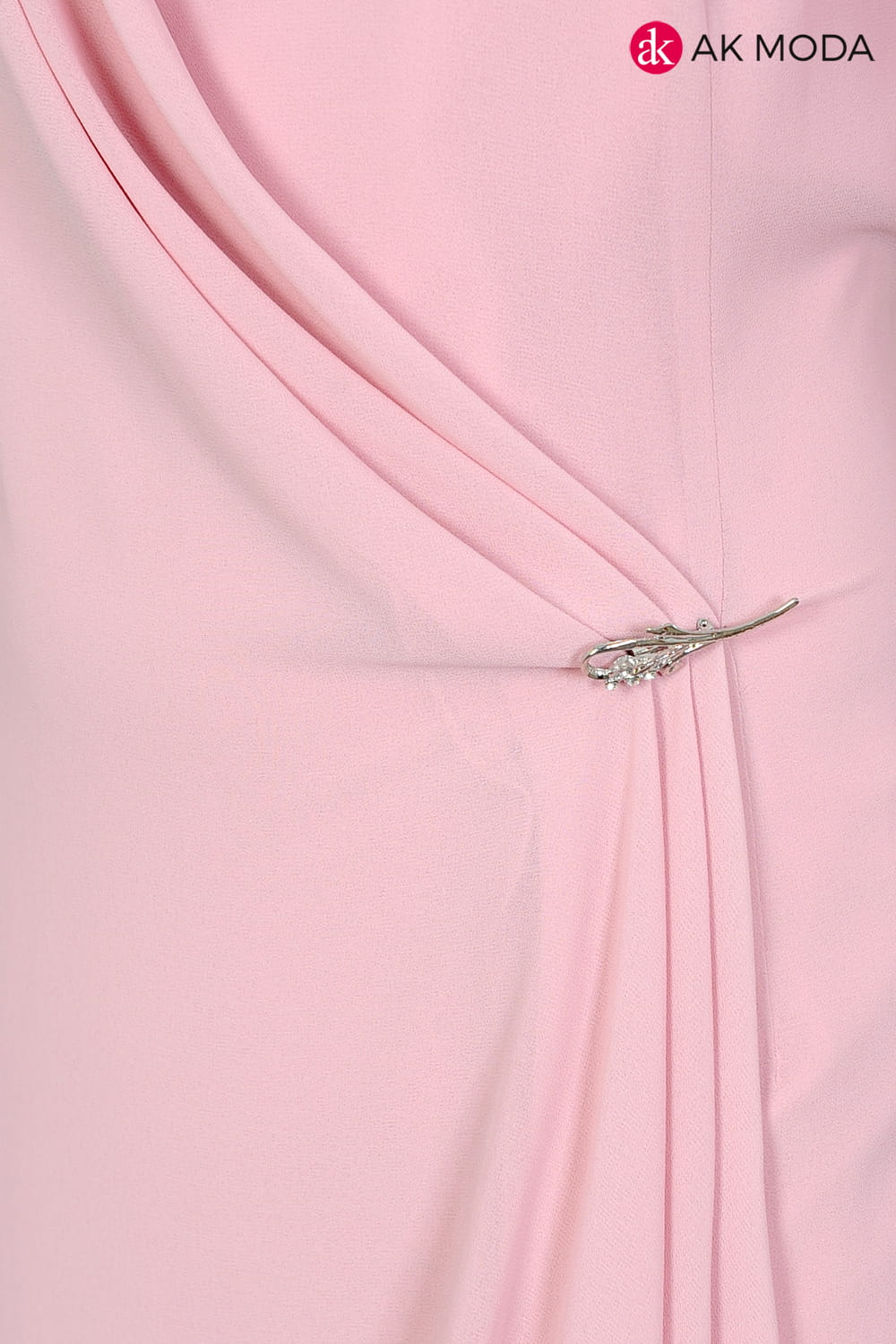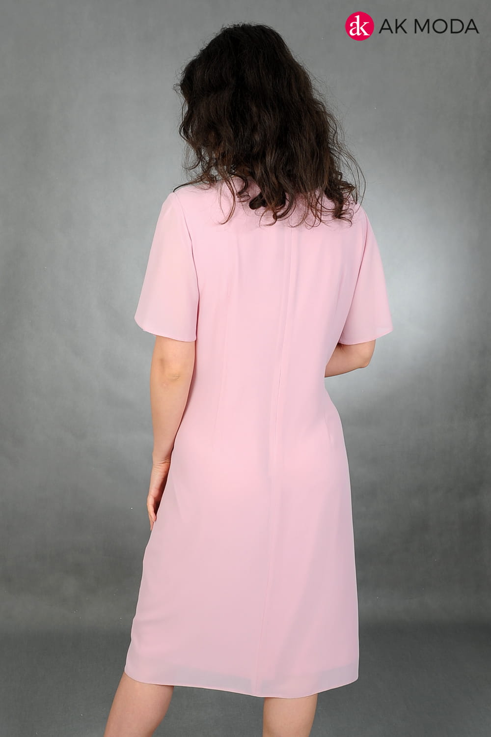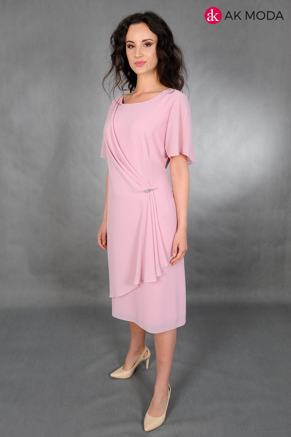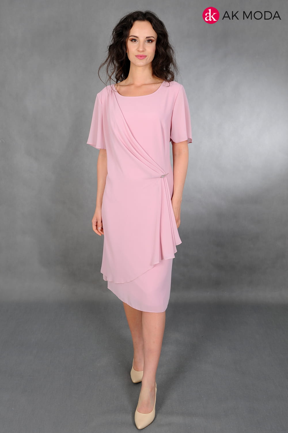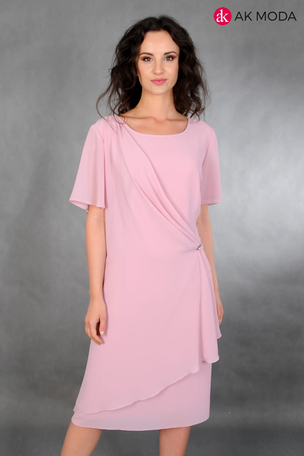 Lekka sukienka w kolorze różowym z ozdobnym drapowaniem. Krótki rękaw, dekolt okrągły.