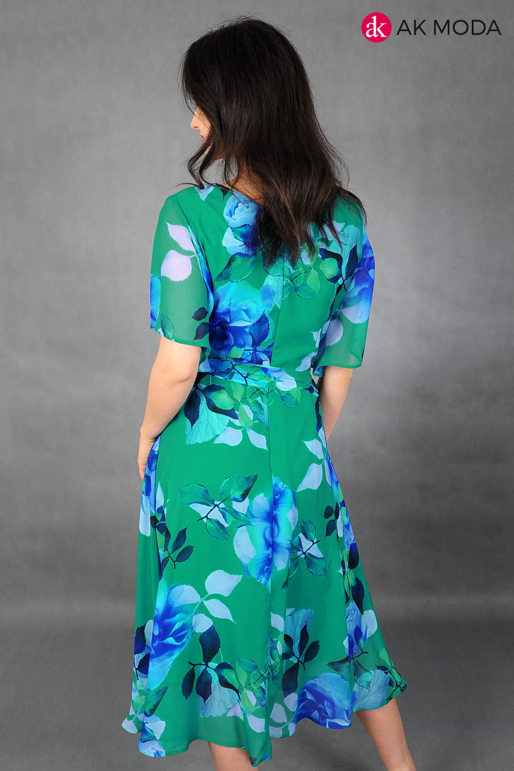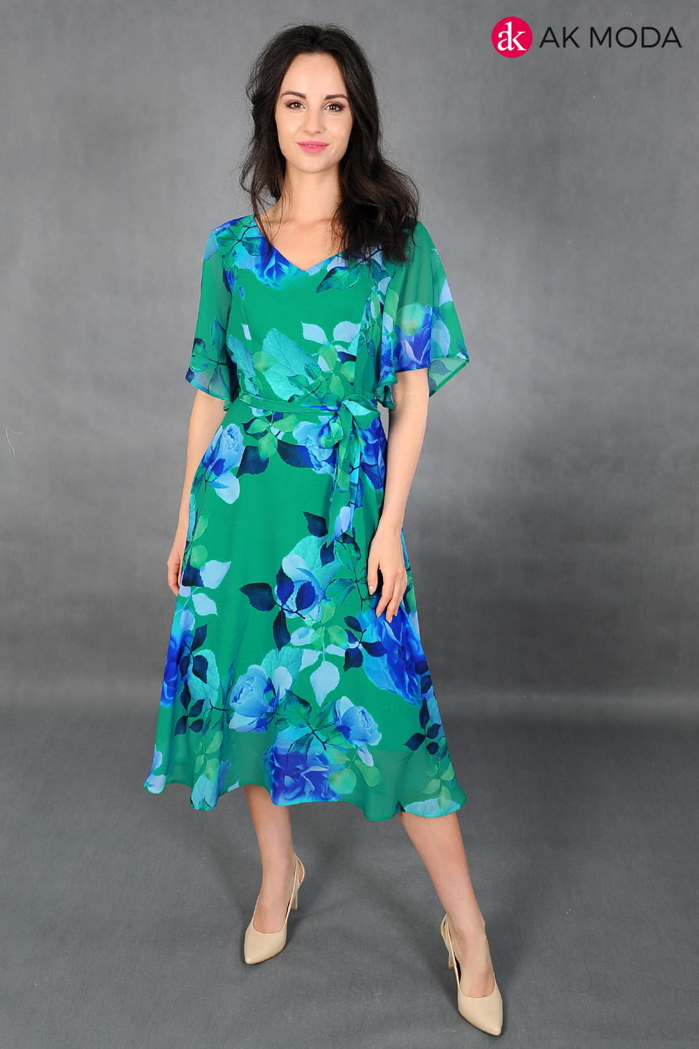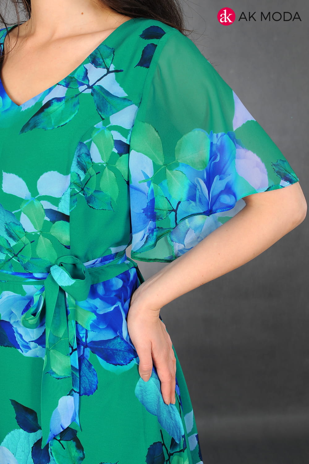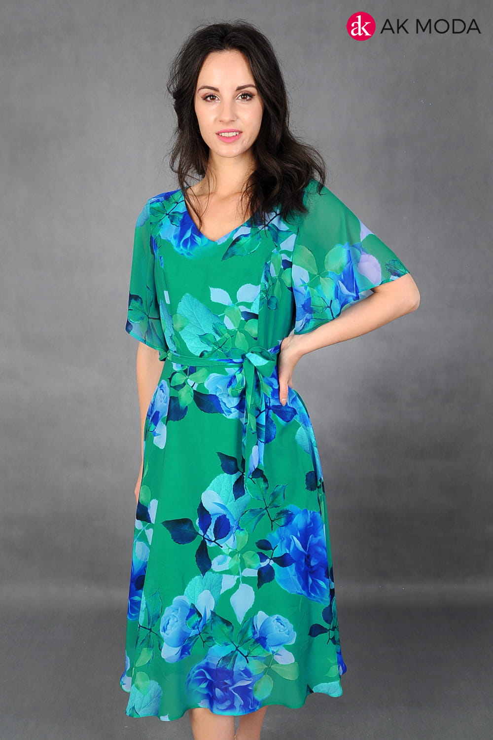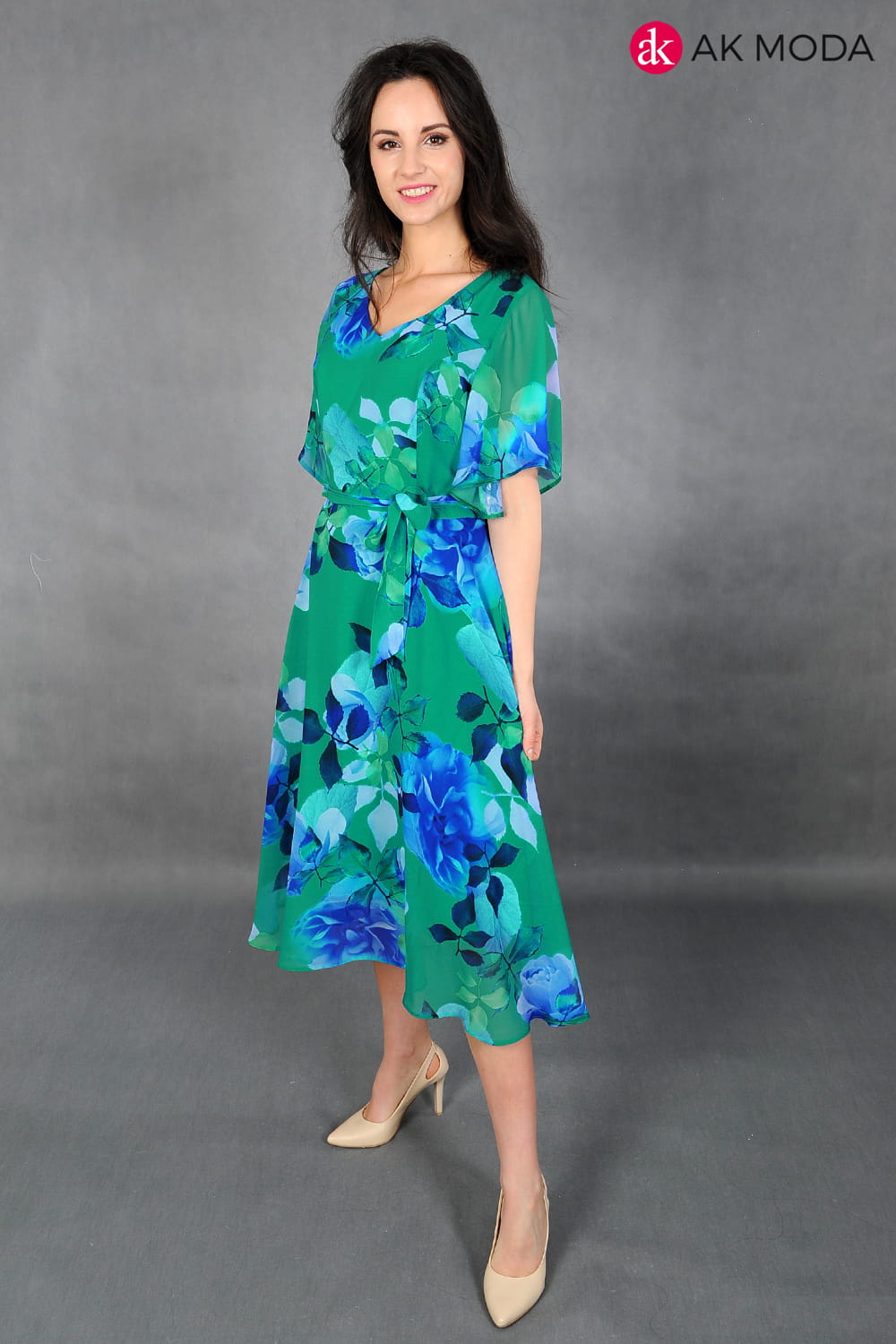 Rozkloszowana, zielono - niebieska sukienka w kwiaty. Dekolt w szpic, krótki rękaw w formie falbanki.