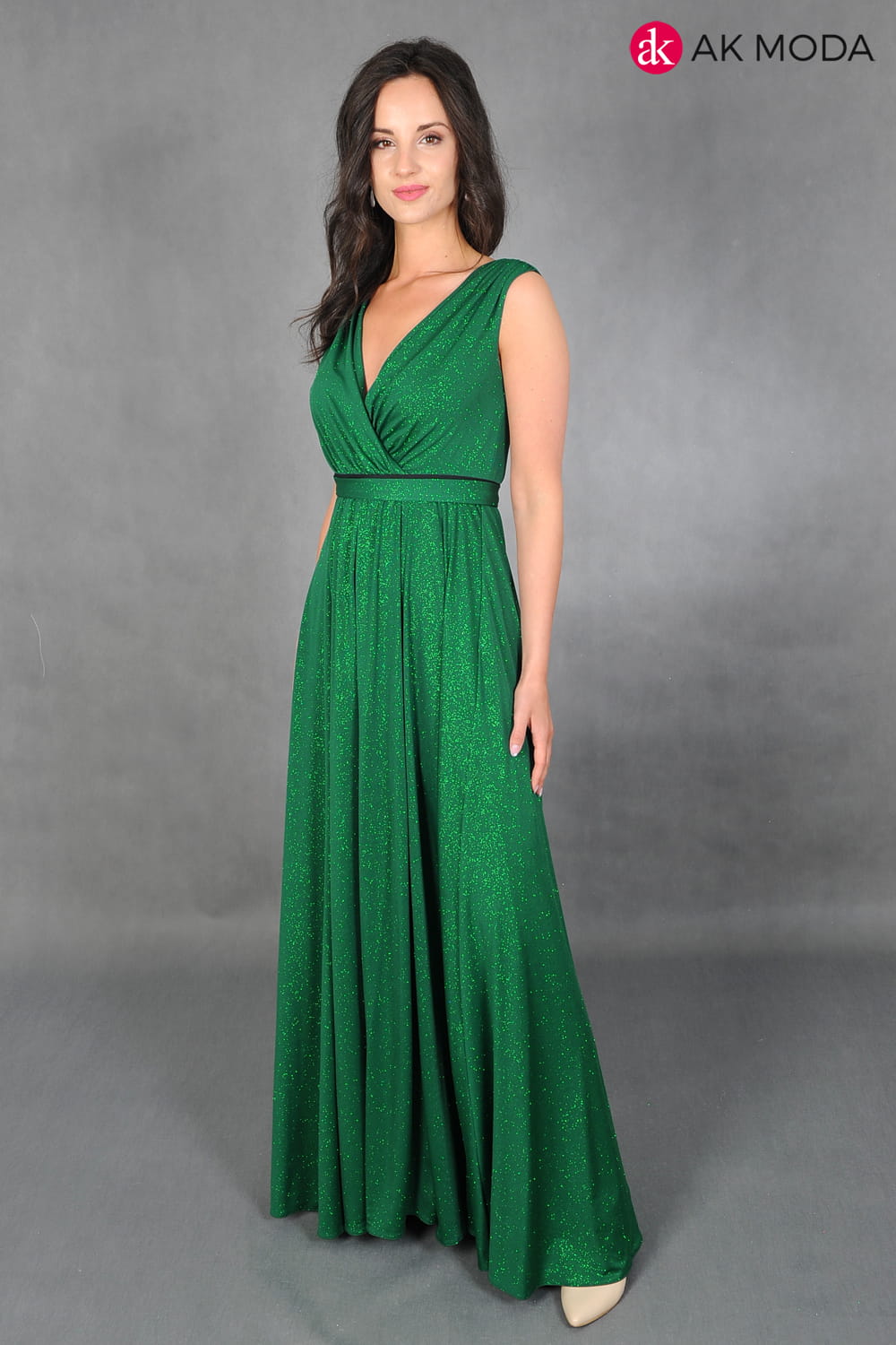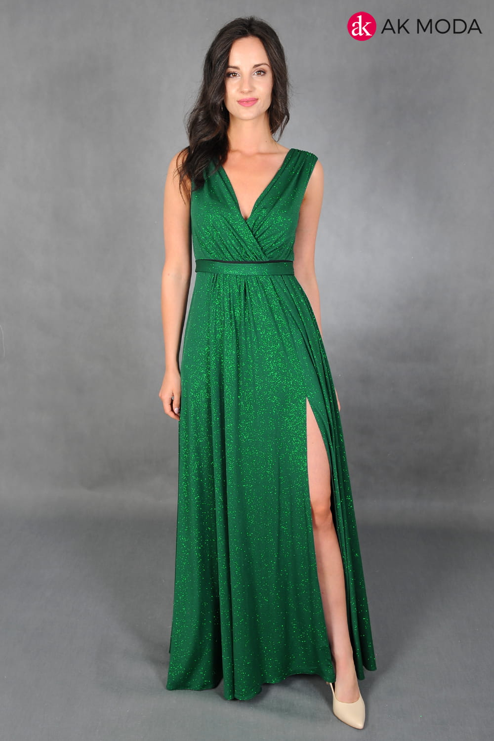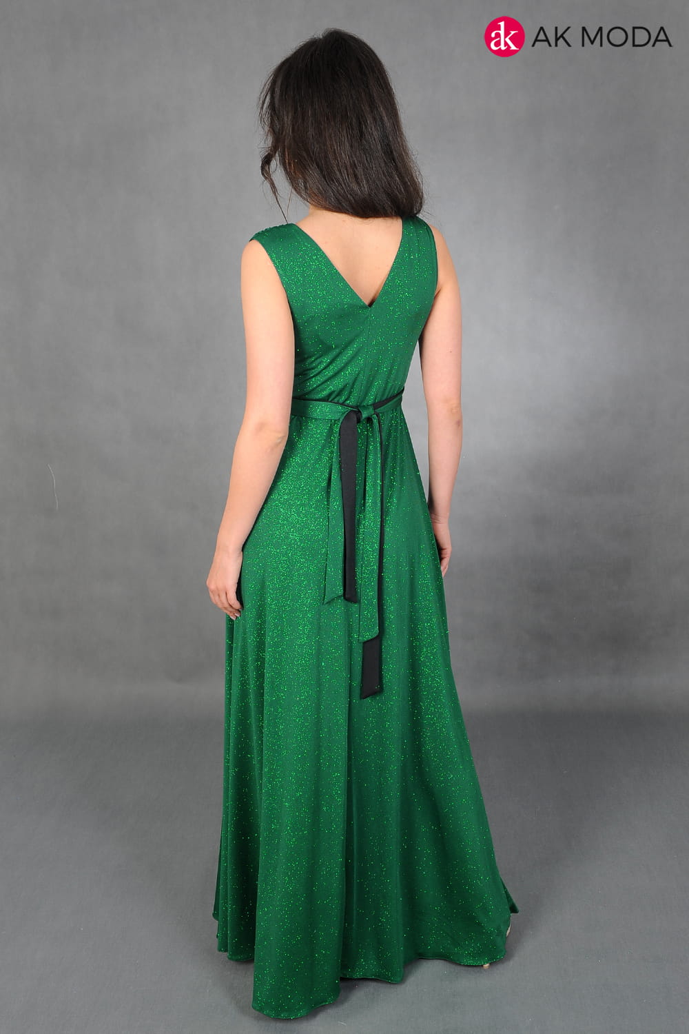 Długa, rozkloszowana sukienka w kolorze zielonym. Dekolt kopertowy, w pasie gumka i pasek.