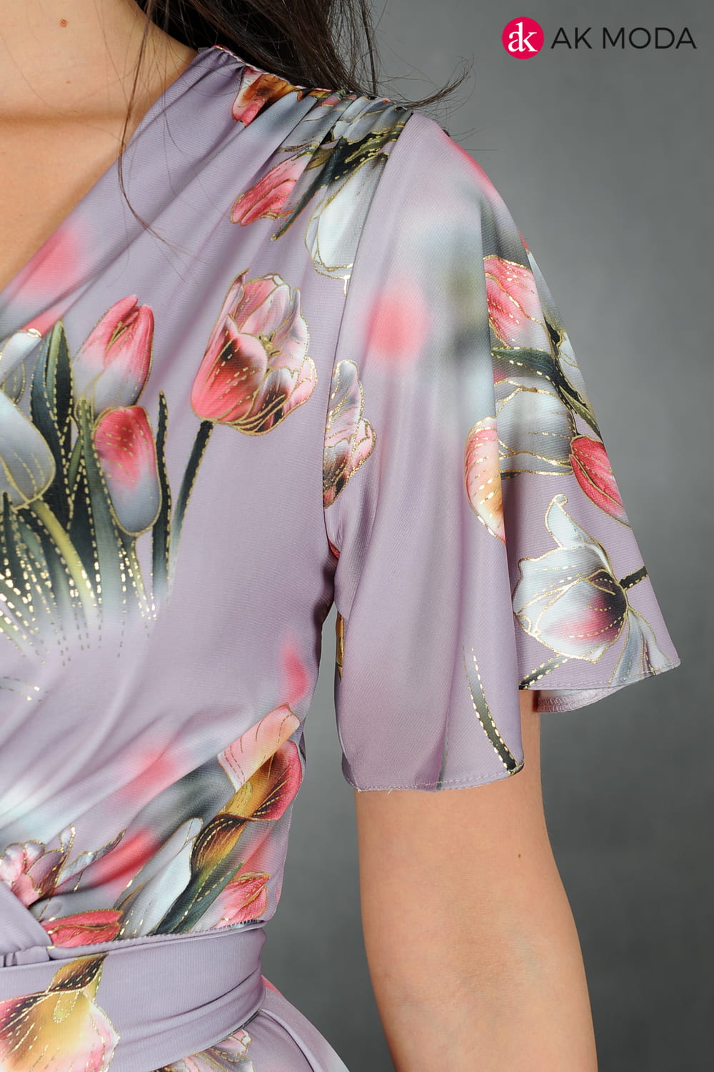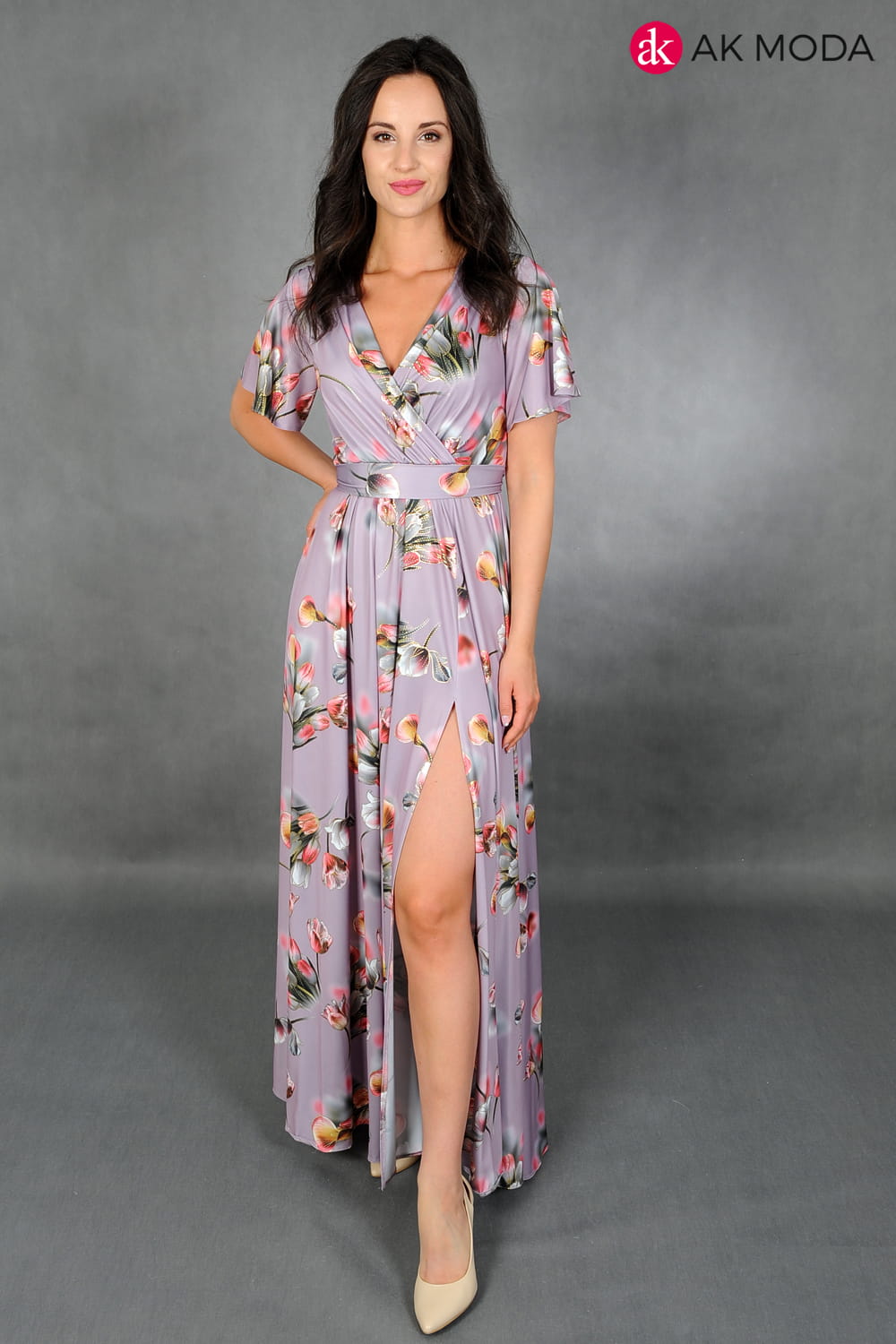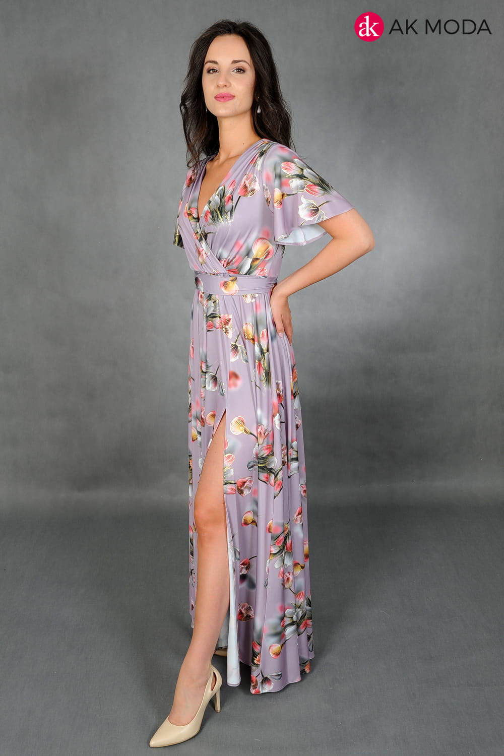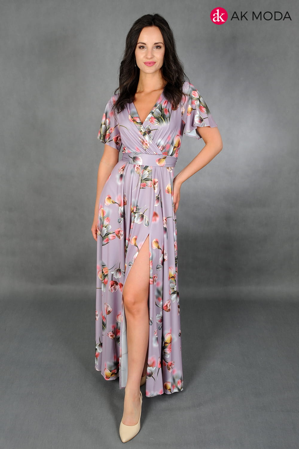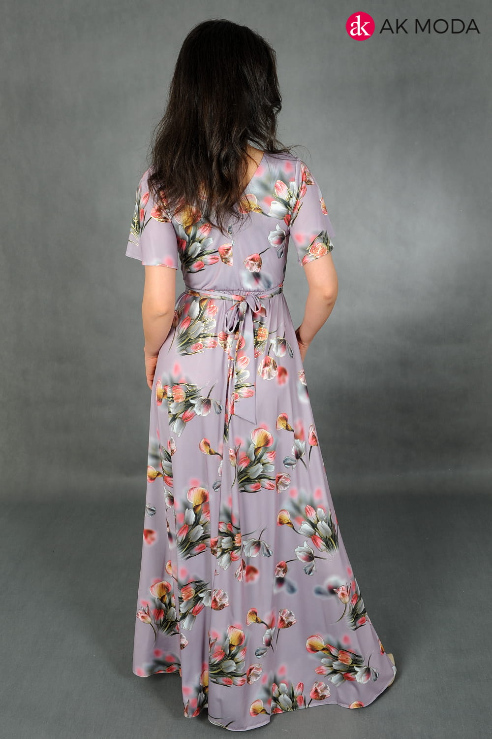 Długa, rozkloszowana sukienka w kwiaty na wrzosowym tle. Krótkie rękawy, dekolt kopertowy, w pasie gumka.