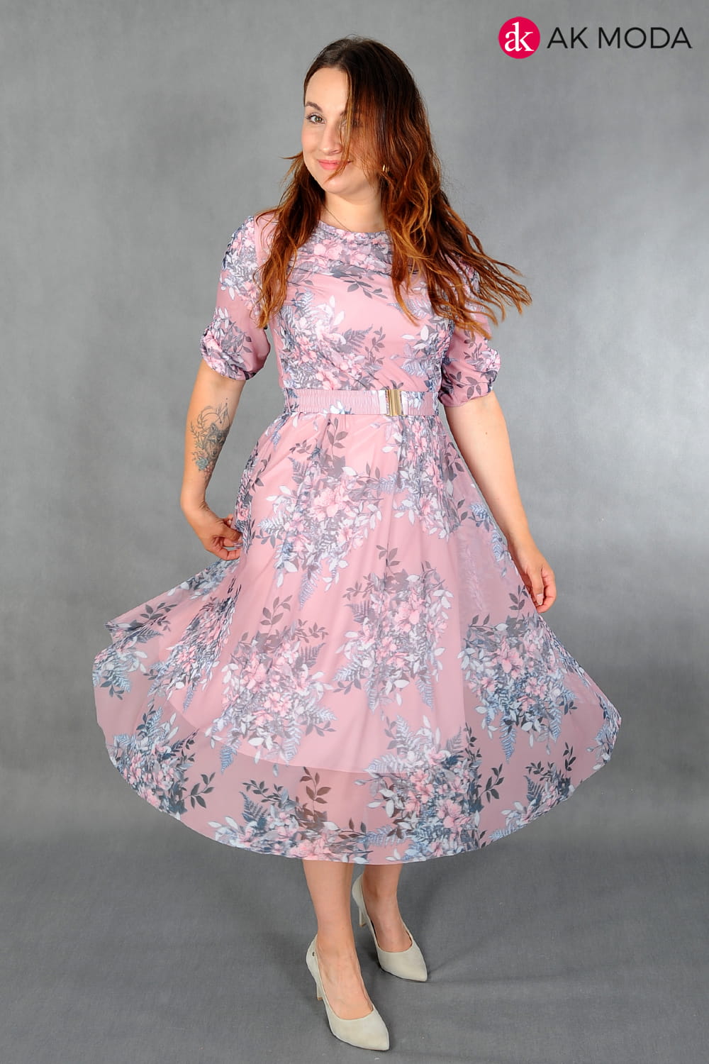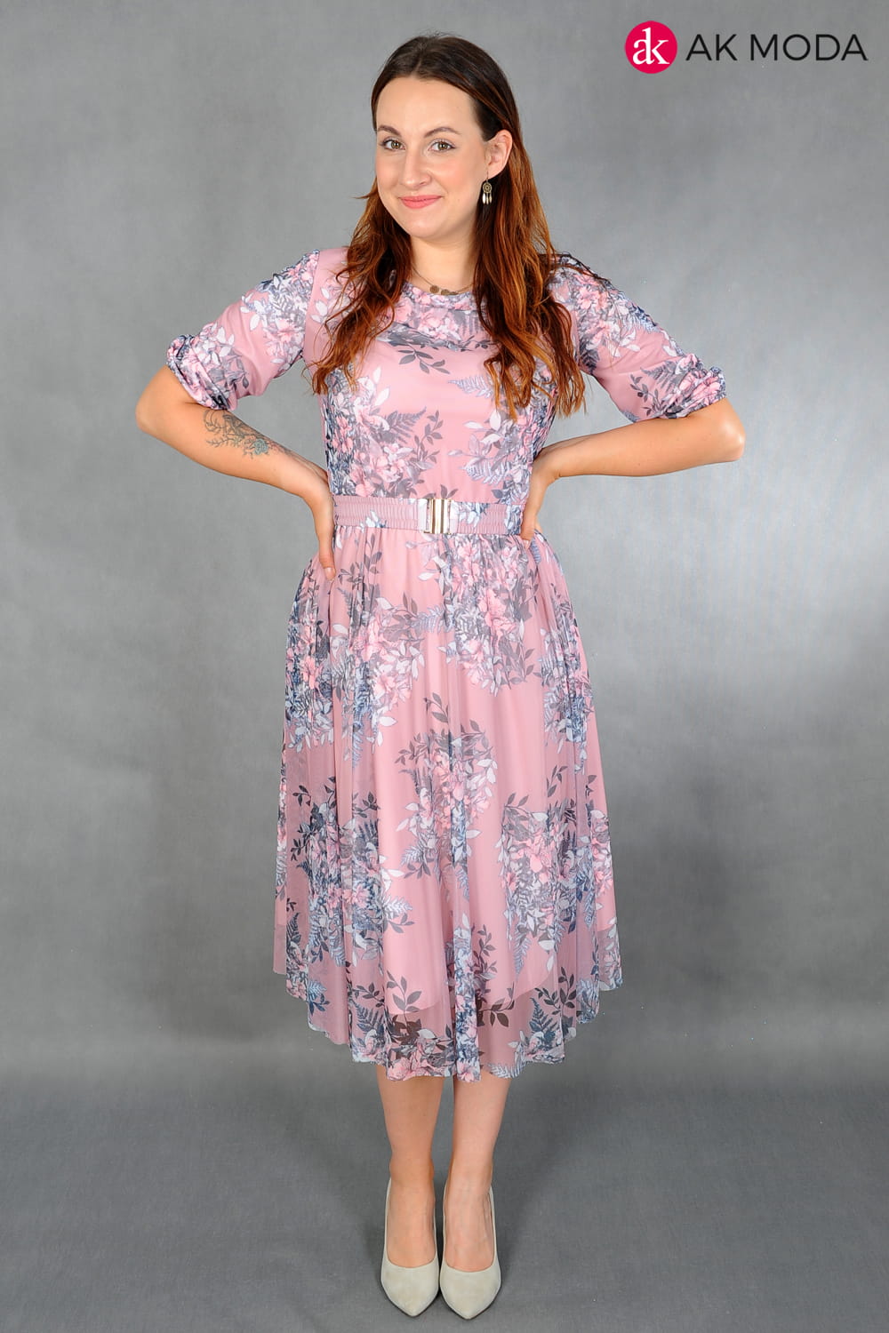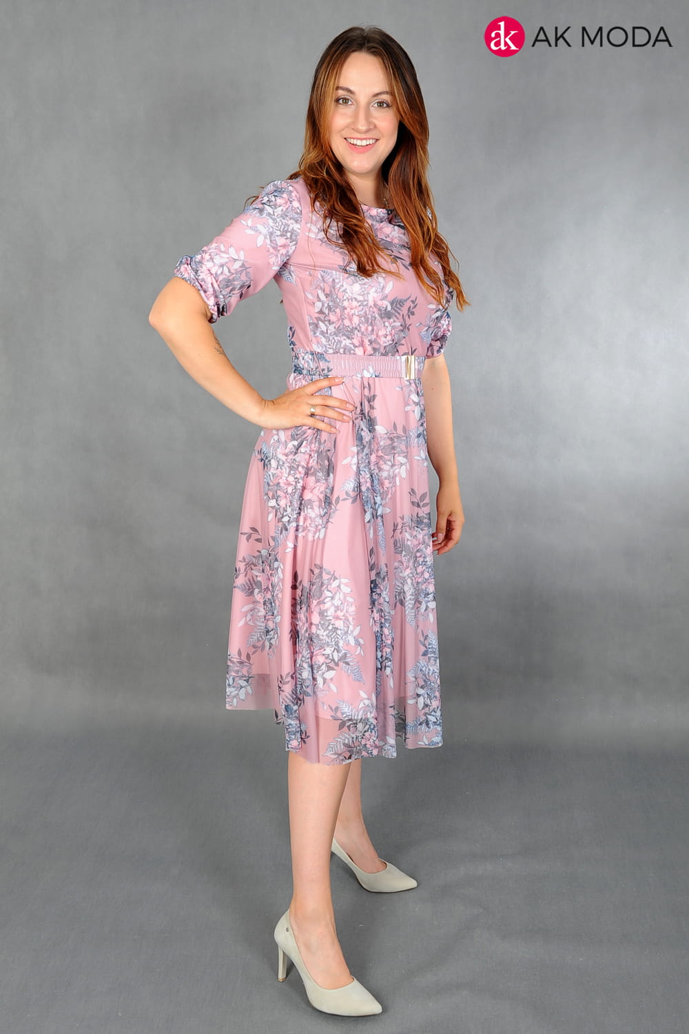 Różowa, rozkloszowana sukienka w kwiaty. Rękaw do łokcia, materiał siateczkowy, w komplecie pasek.