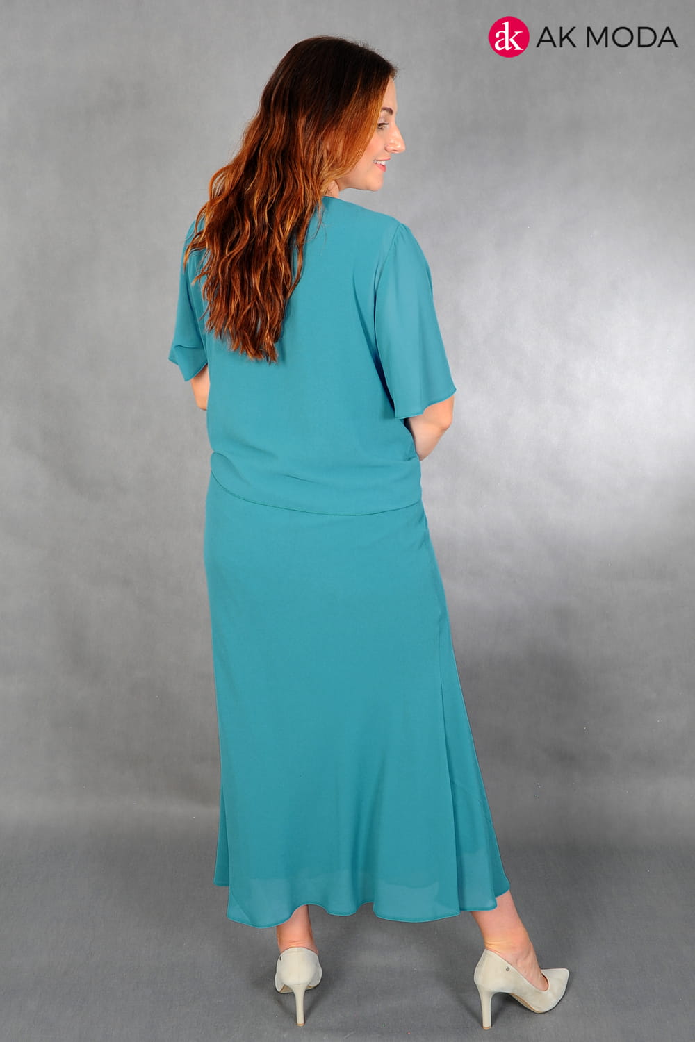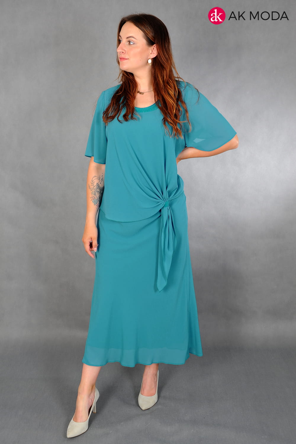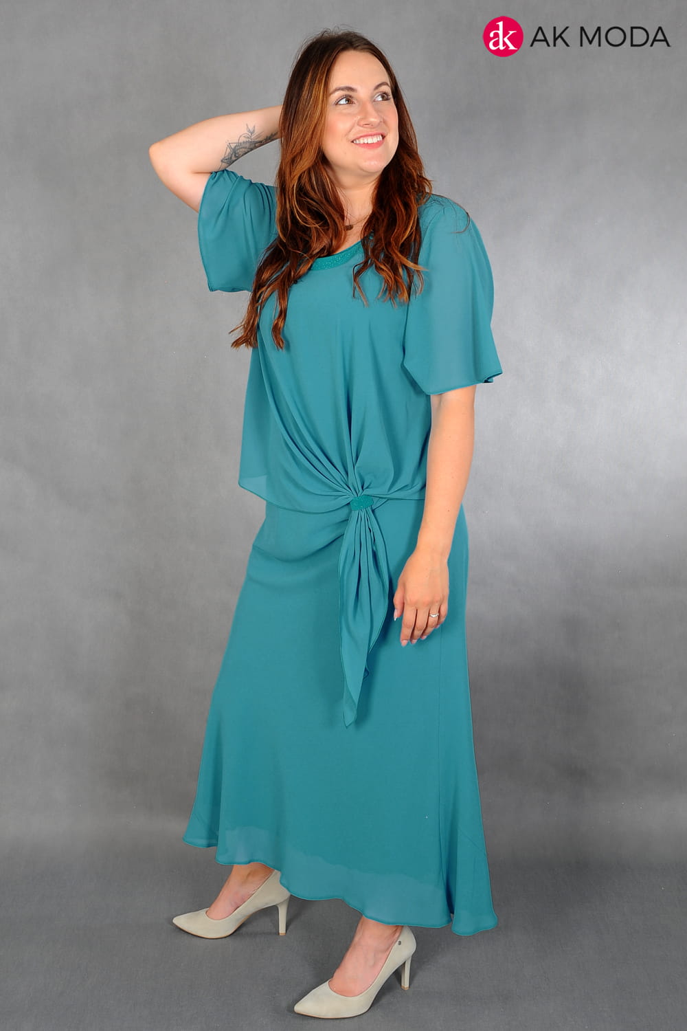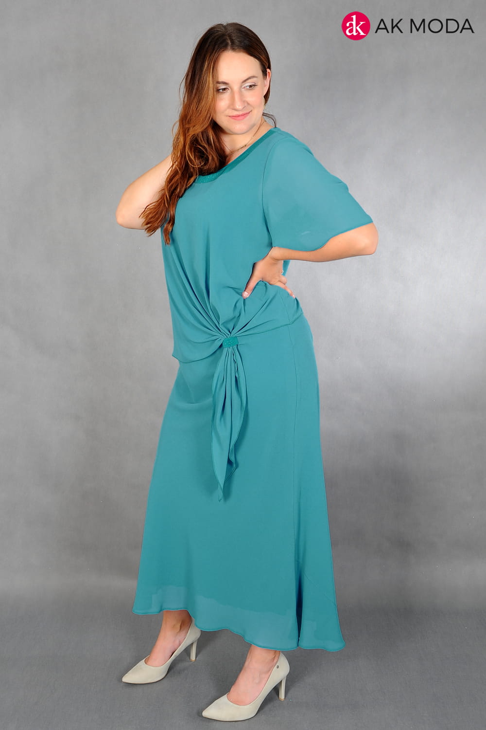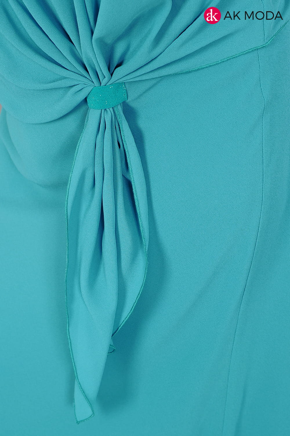 Długa sukienka w kolorze morskim z krótkim rękawem i ozdobnym upięciem.