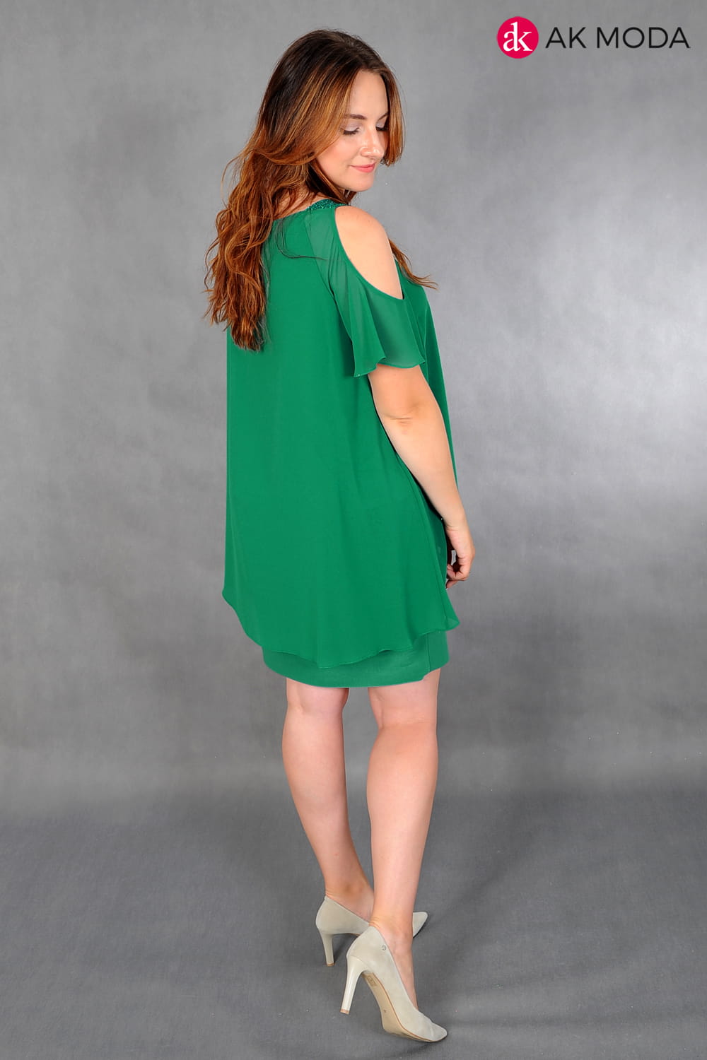Prosta zielona sukienka z narzutką. Materiał elastyczny, ramiona odkryte.