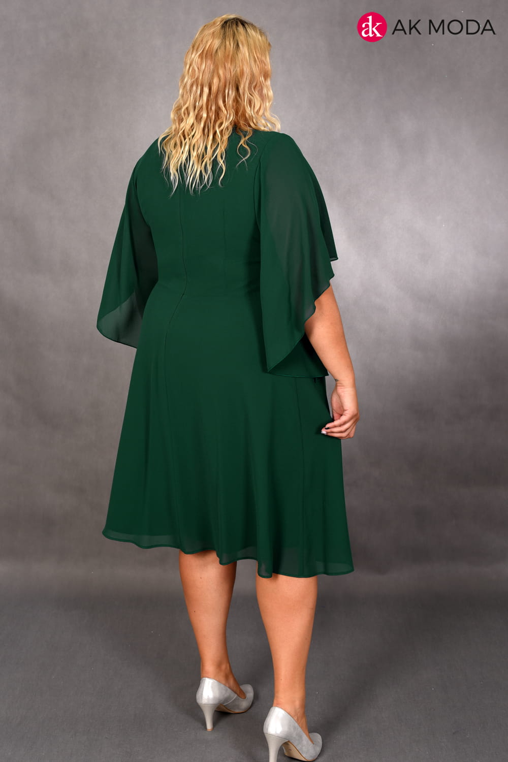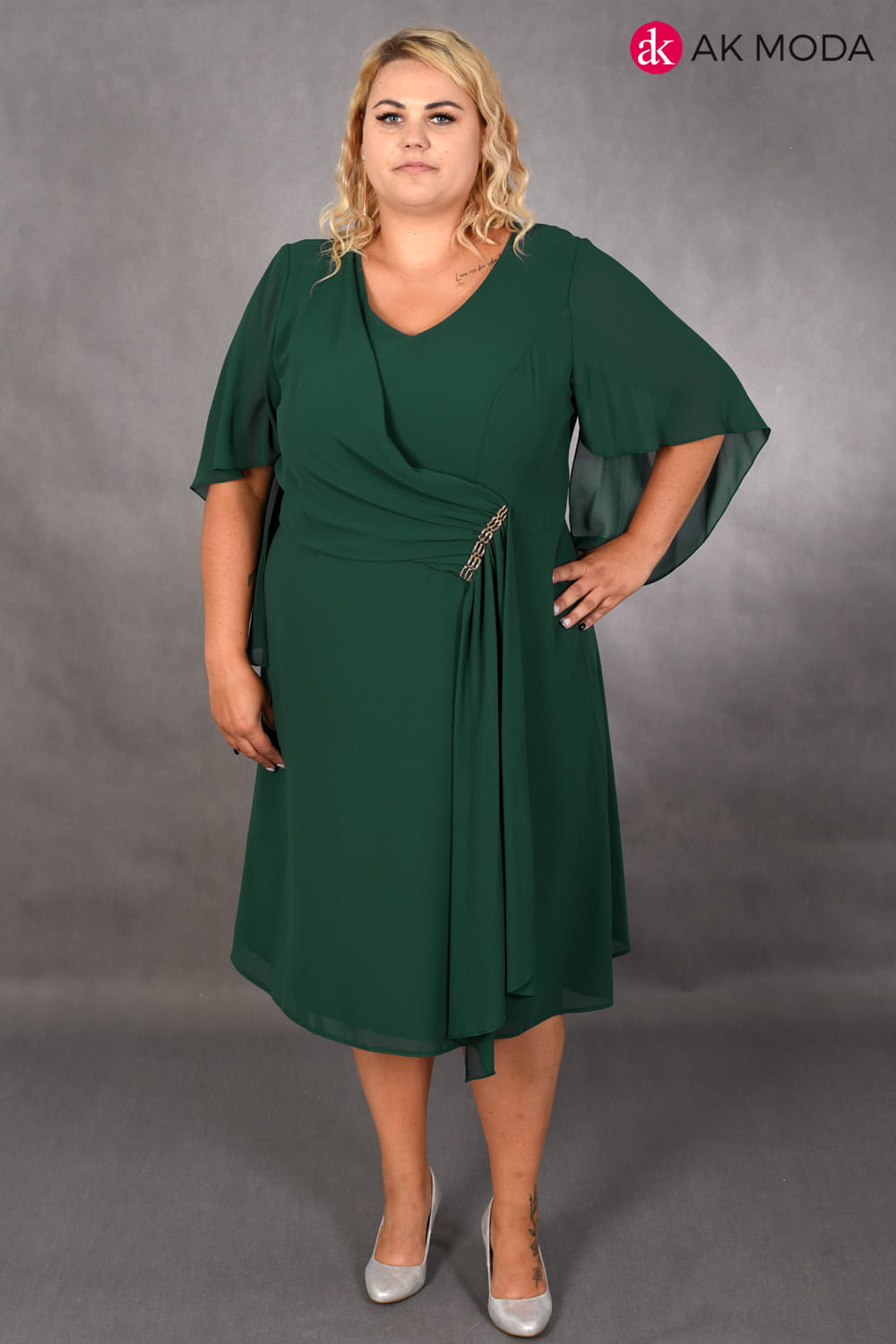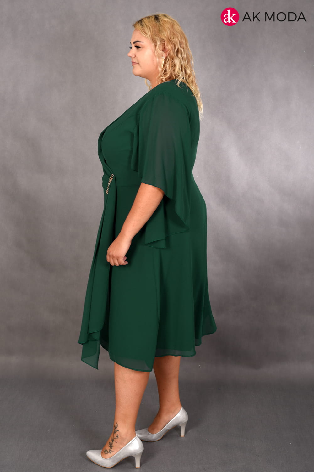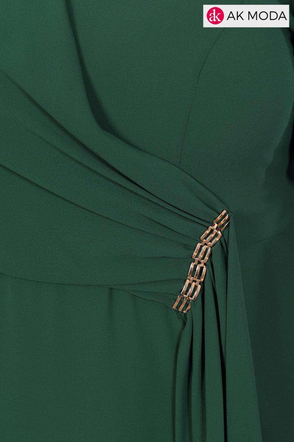 Lekko rozkloszowana sukienka w kolorze butelkowej zieleni z ozdobnym upięciem i szerokimi rękawami.