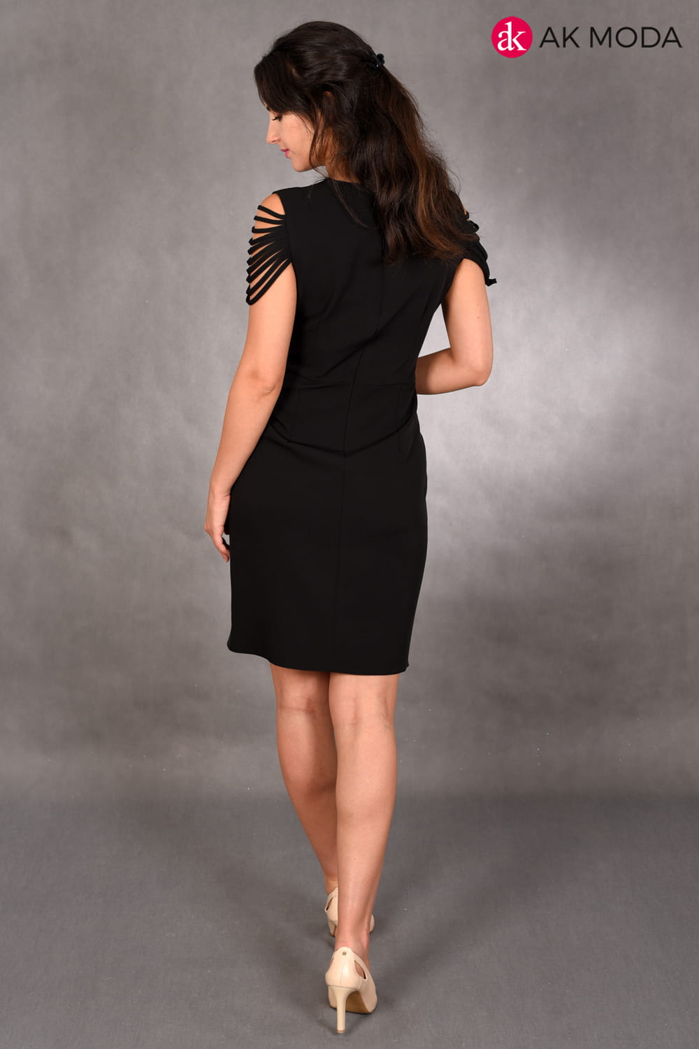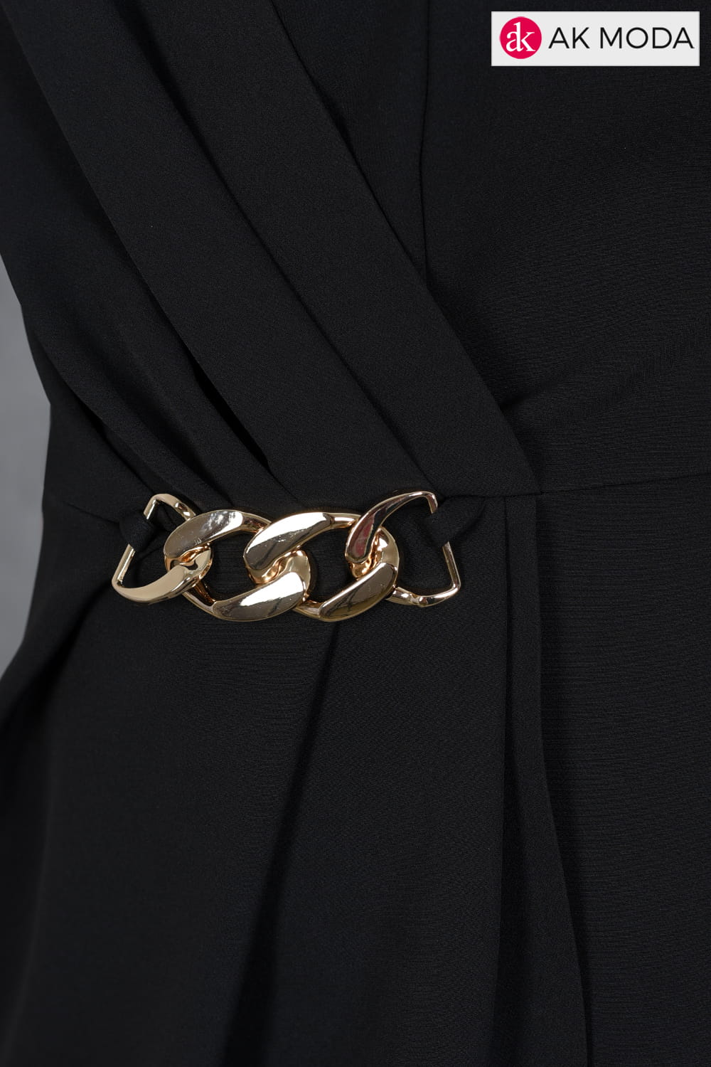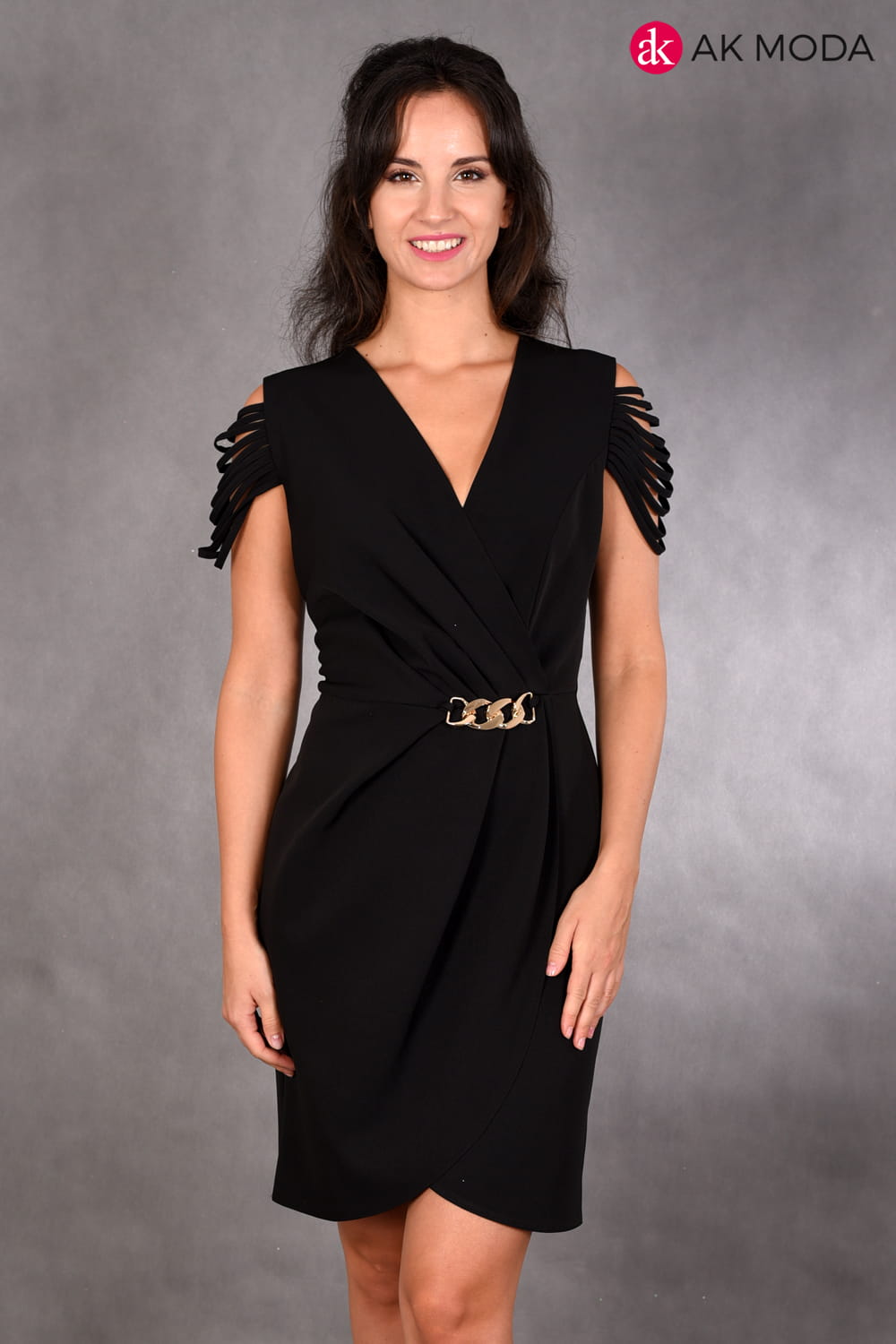 Czarna, dopasowana sukienka z zakładanym, asymetrycznym przodem. Fason odcinany, w talii ozdobna klamra.