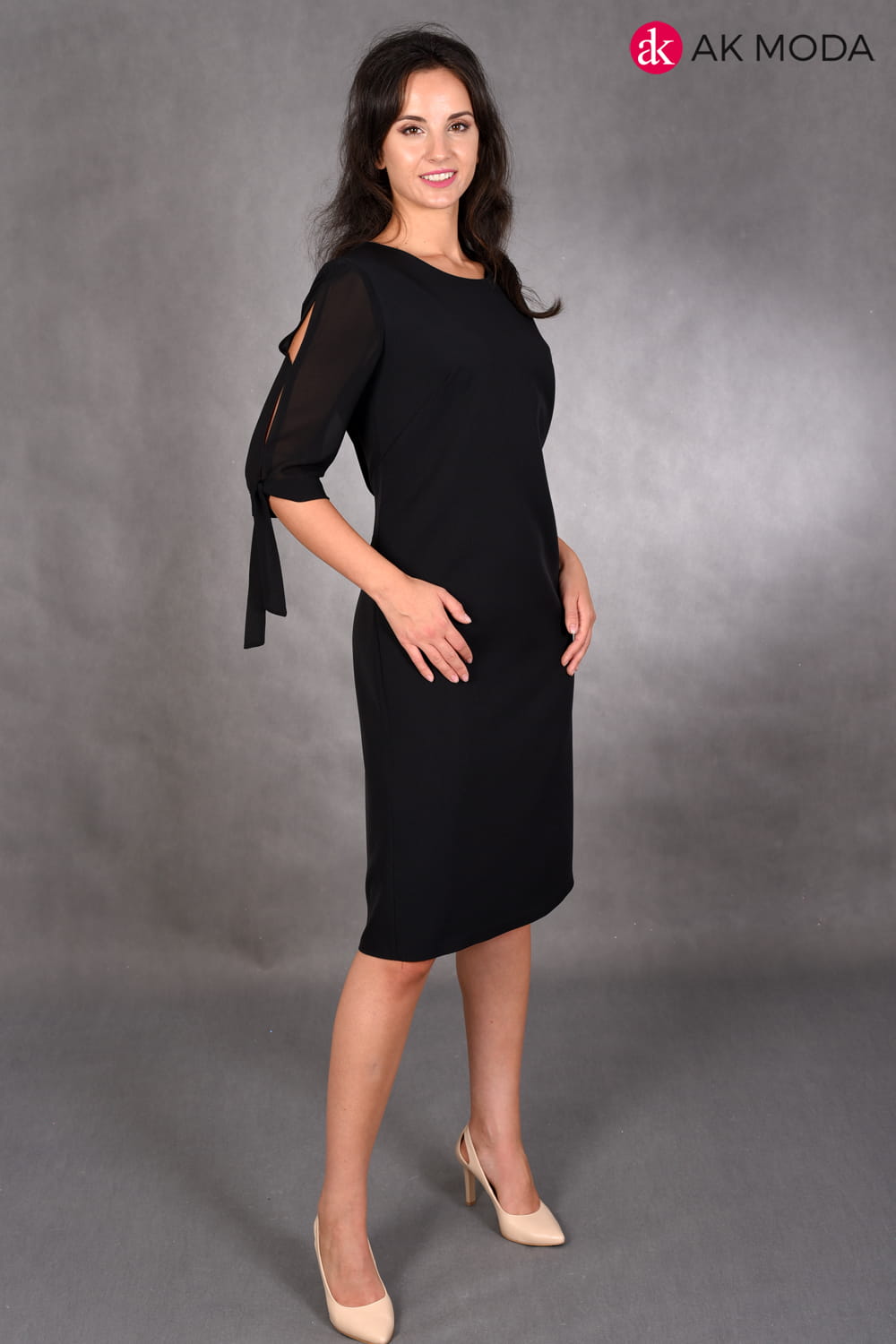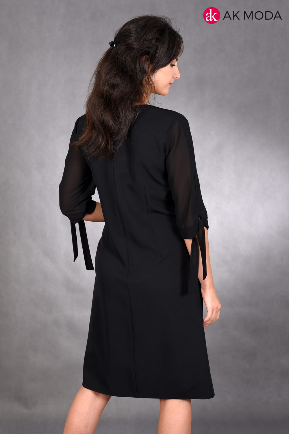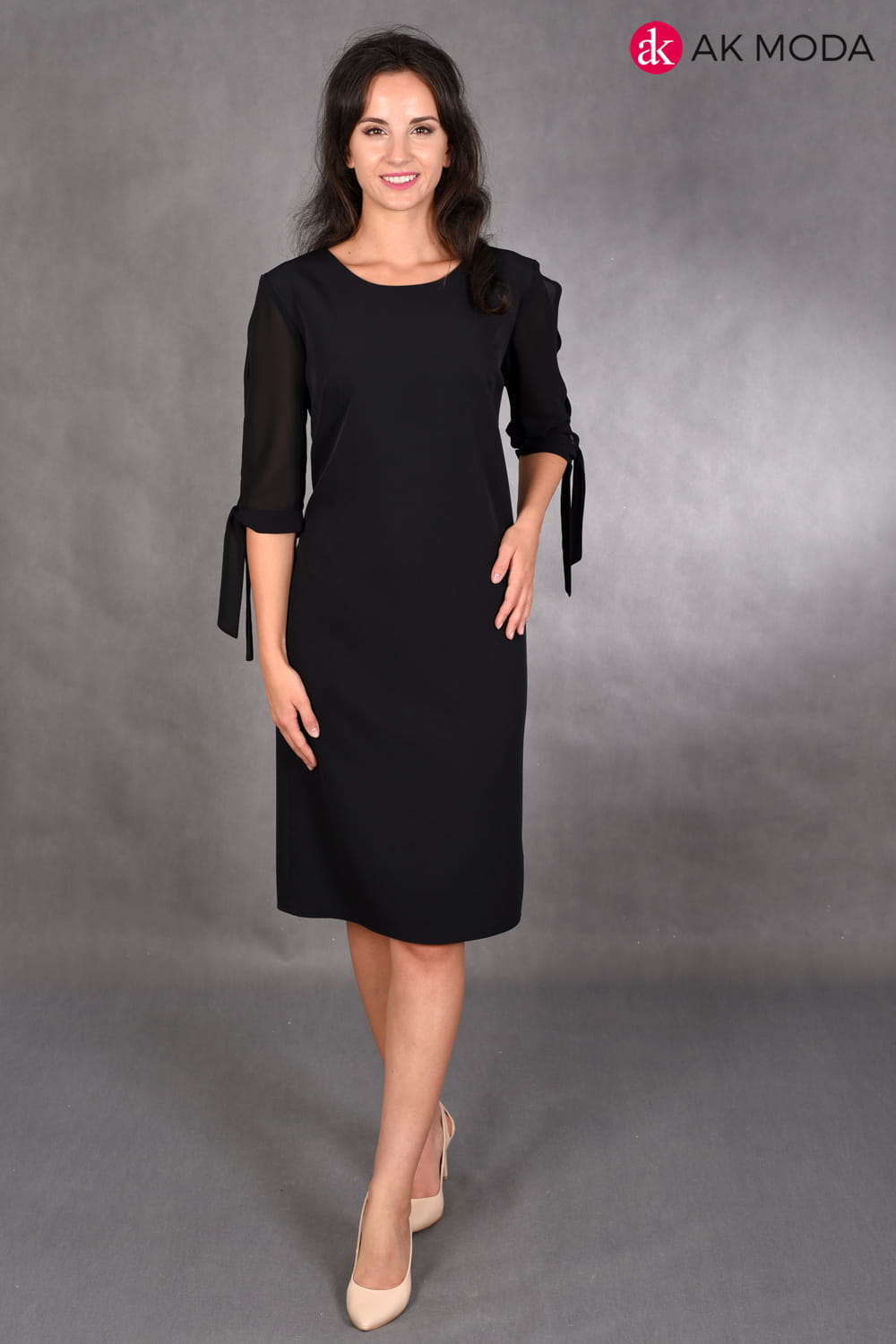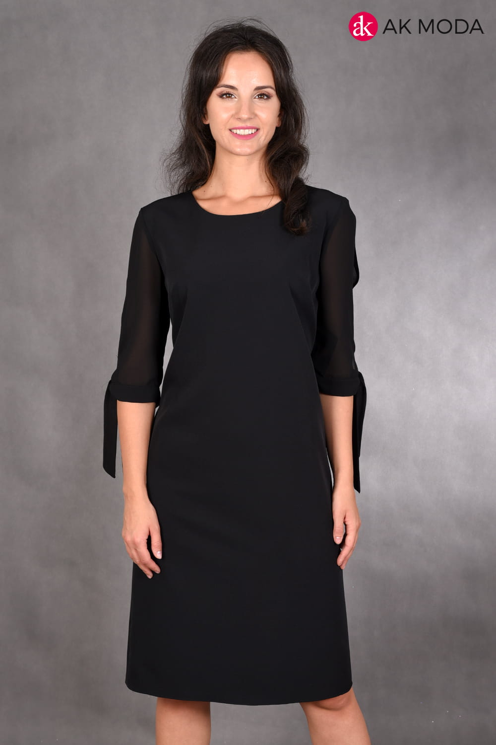Czarna, prosta sukienka z wiązanymi rękawami 3/4.