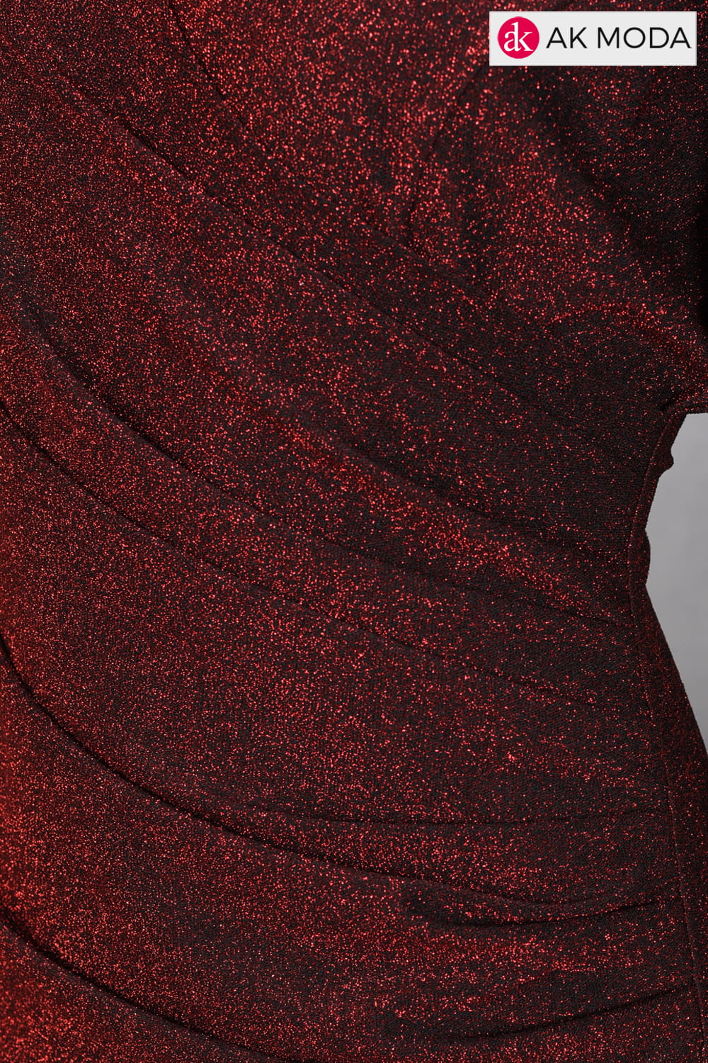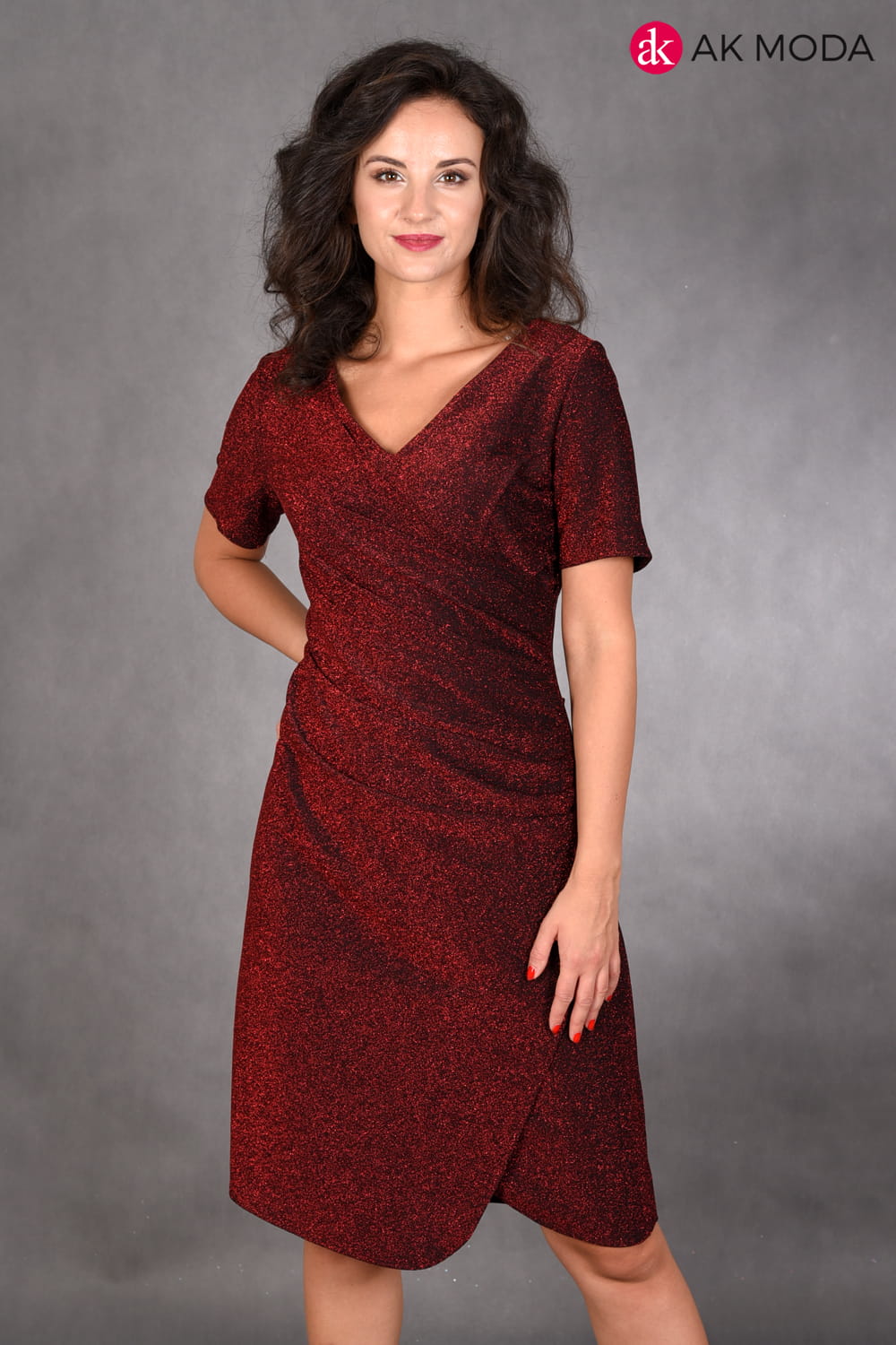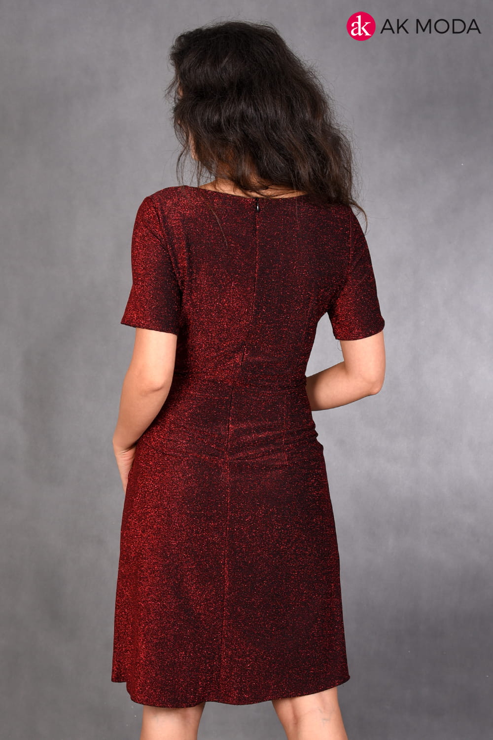Prosta bordowa sukienka uszyta z elastycznego, błyszczącego materiału. Dekolt kopertowy, krótki rękawek, w talii marszczenie.