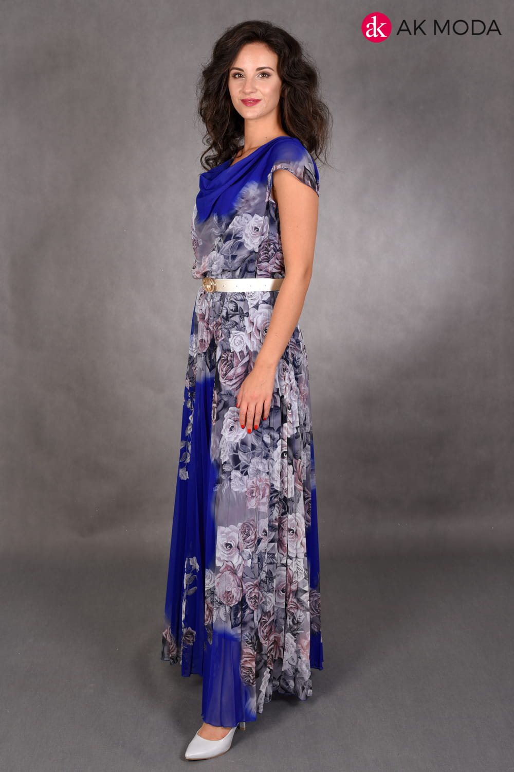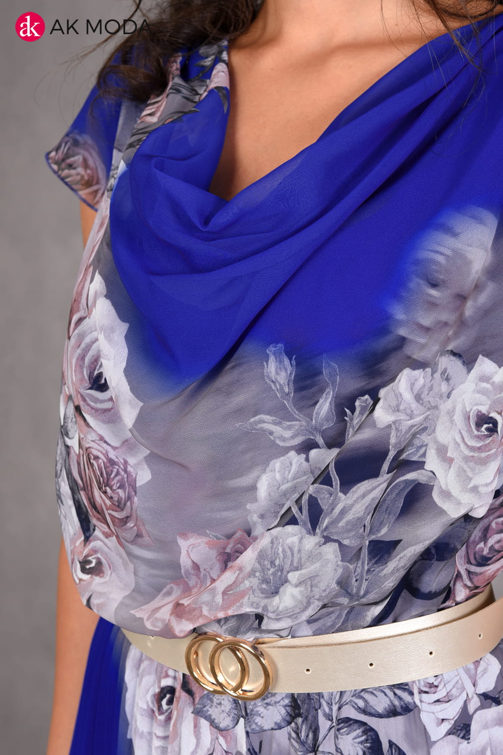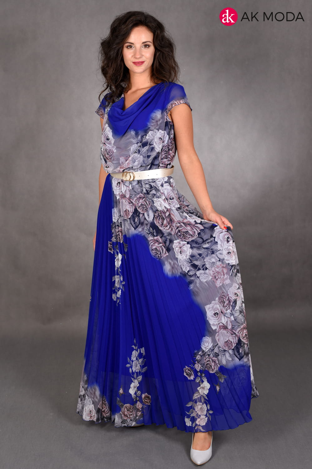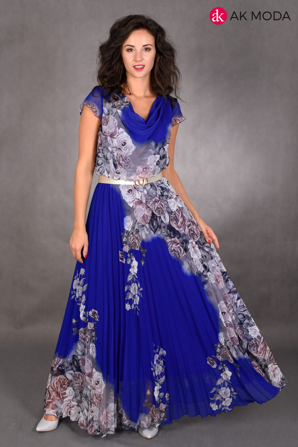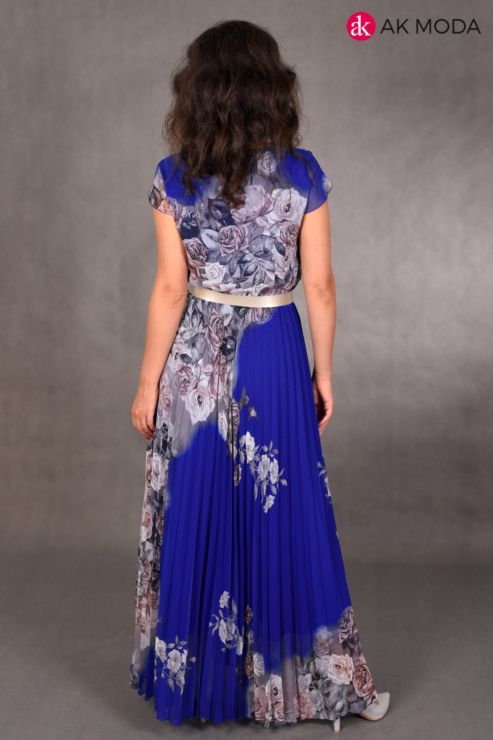 Długa sukienka w kolorze chabrowym z efektownym kwiatowym nadrukiem. Dekolt typu "woda", dół plisowany.