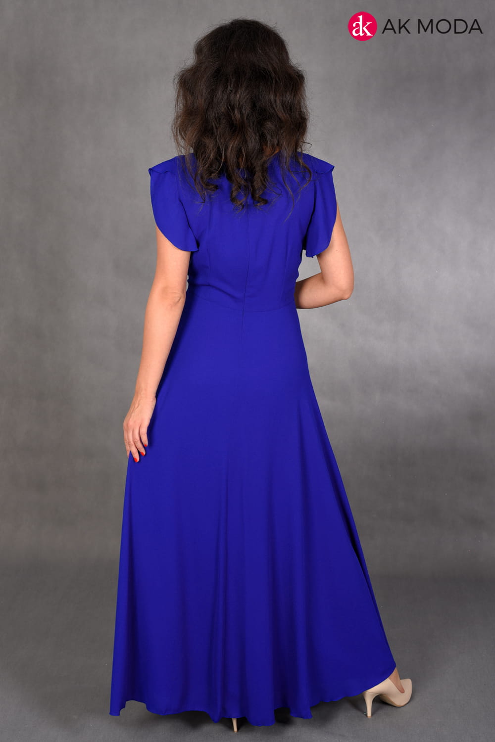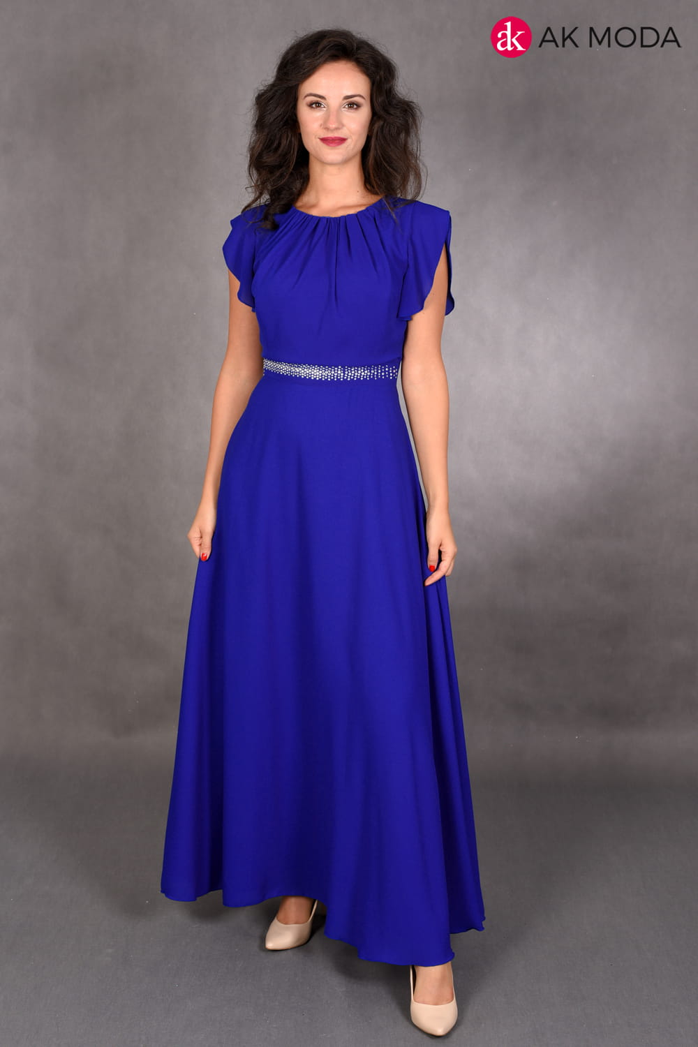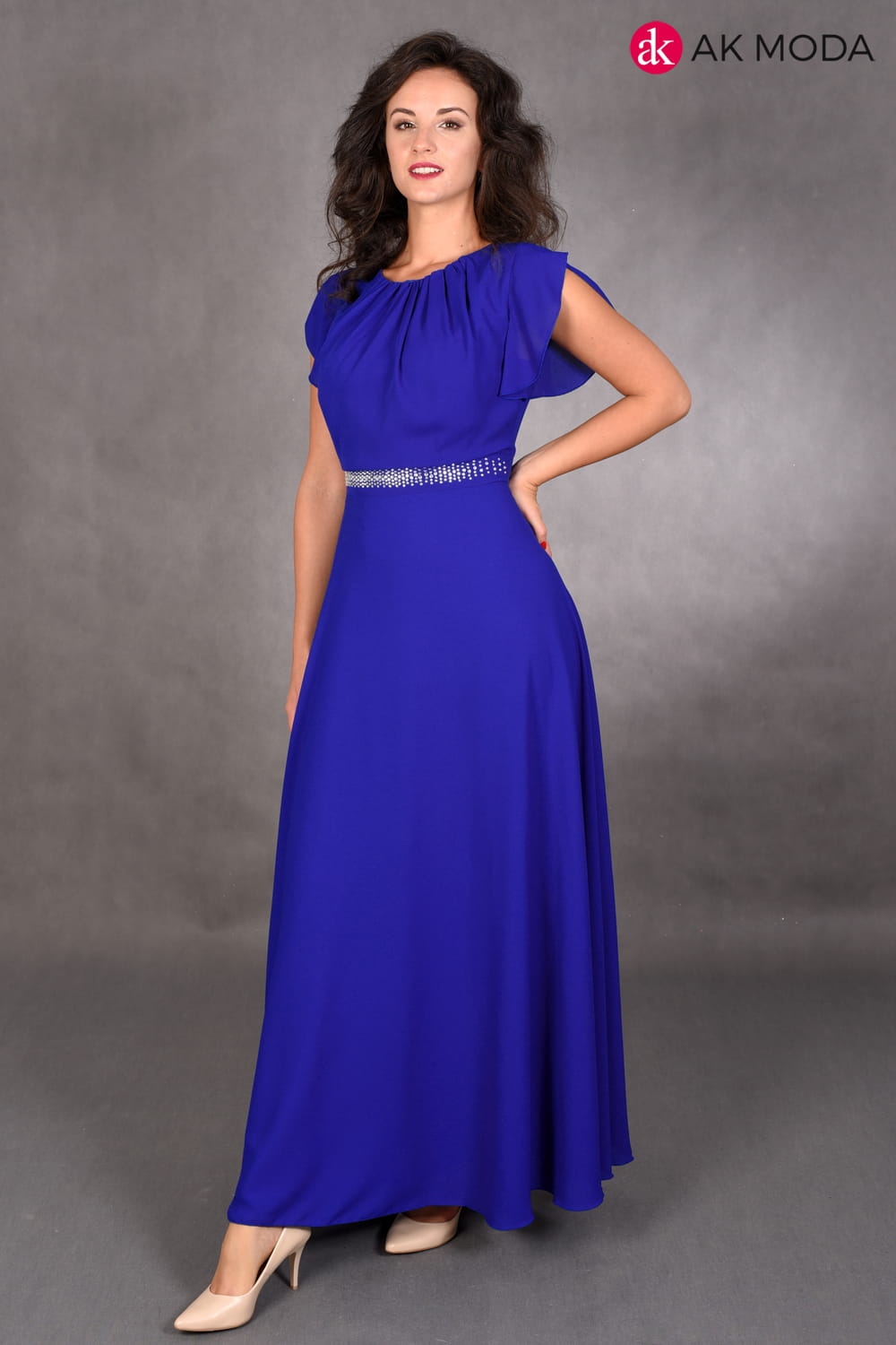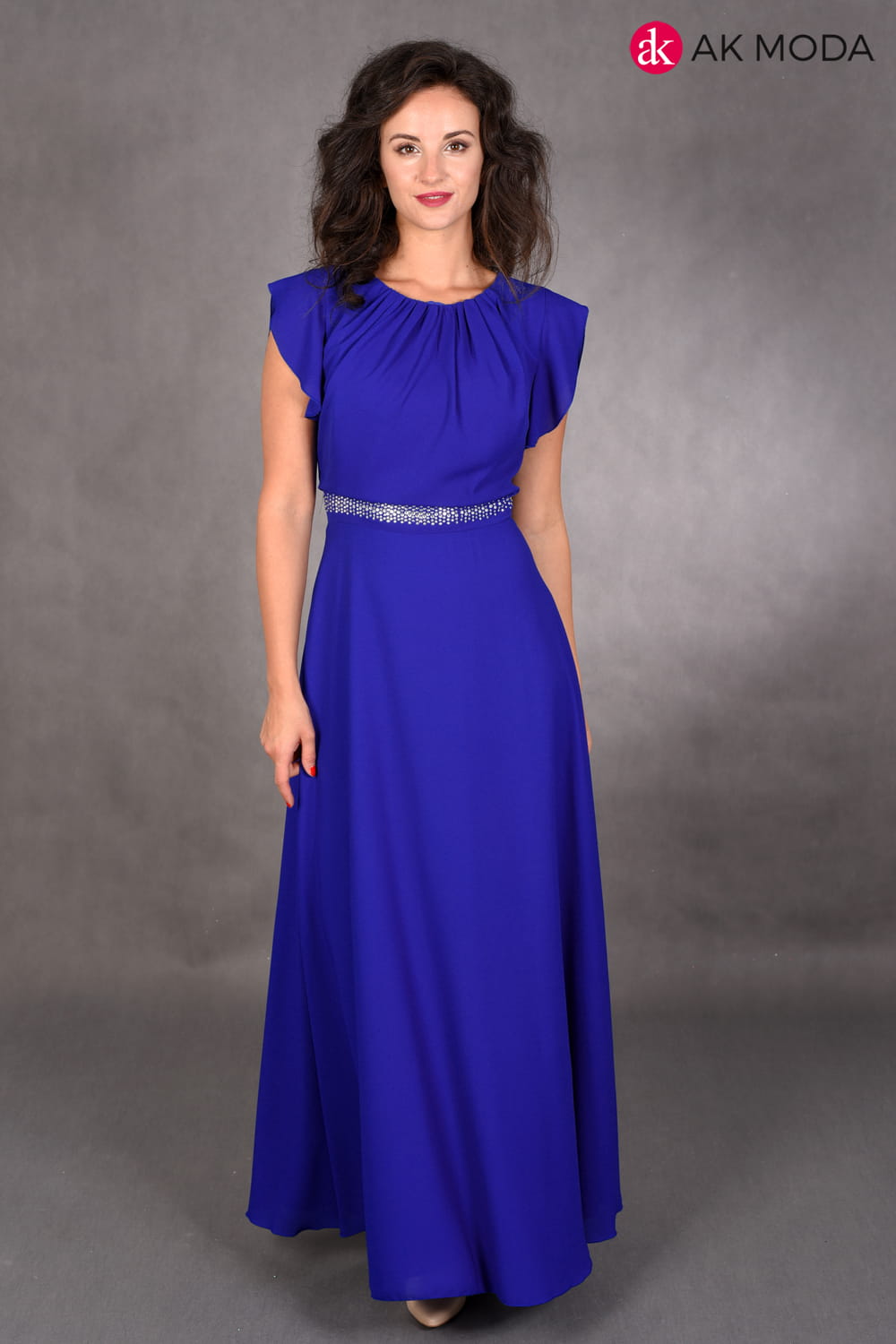 Sukienka długa, rozkloszowana w kolorze chabrowym, w pasie ozdobne cyrkonie. Przy ramionach falbanki.