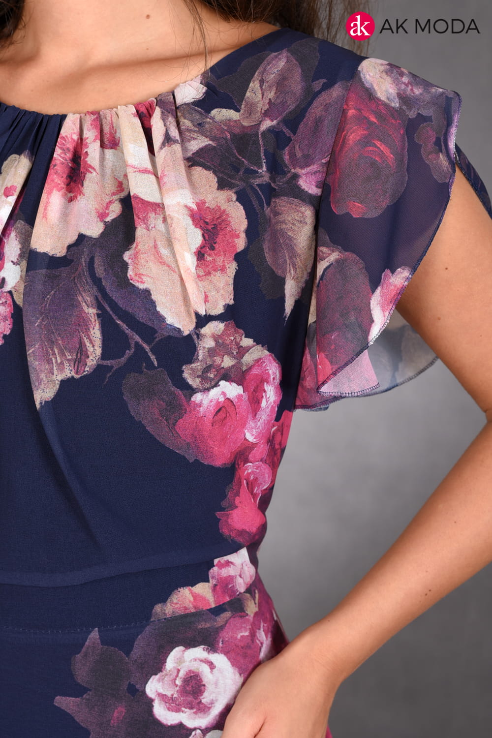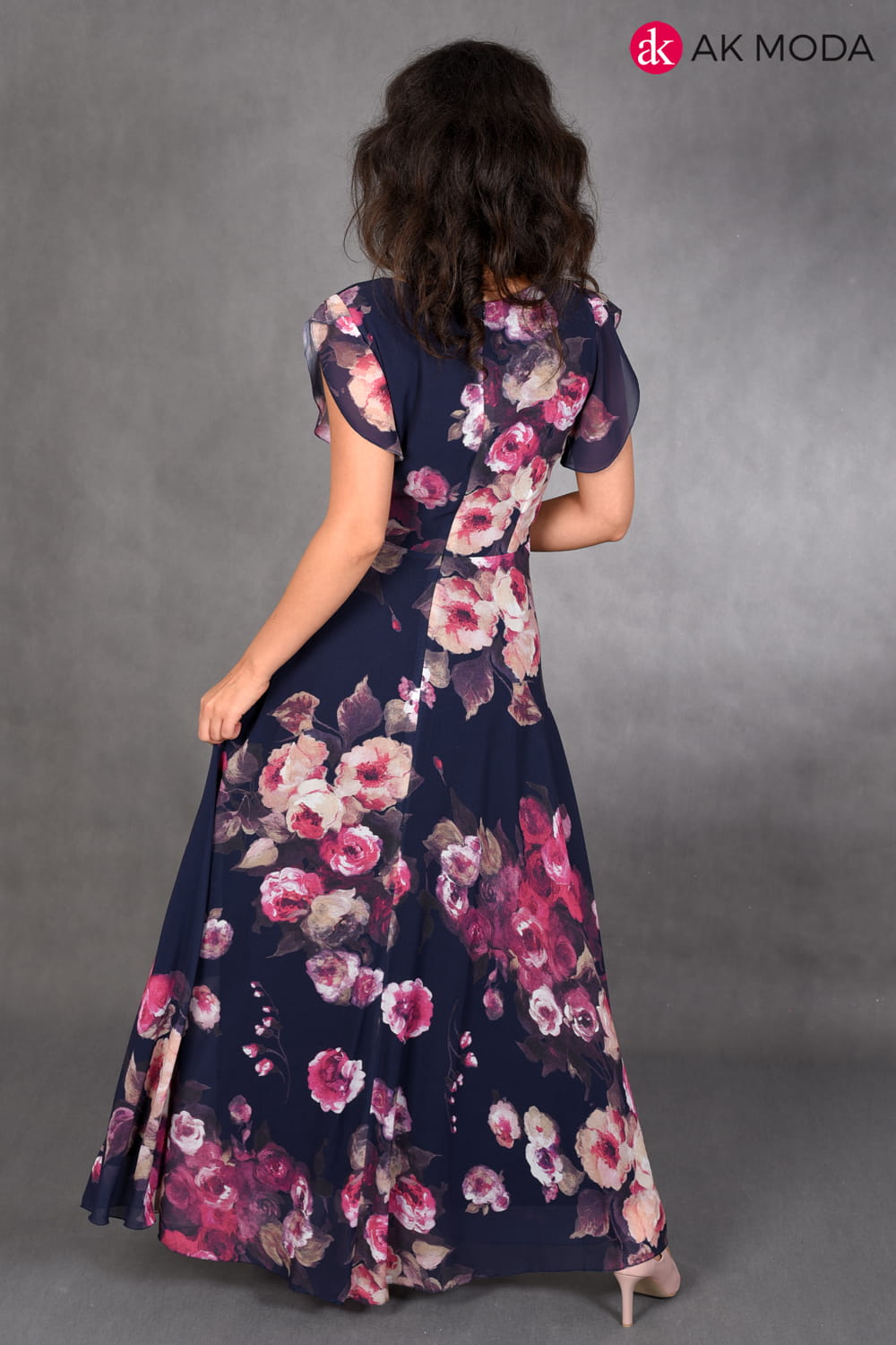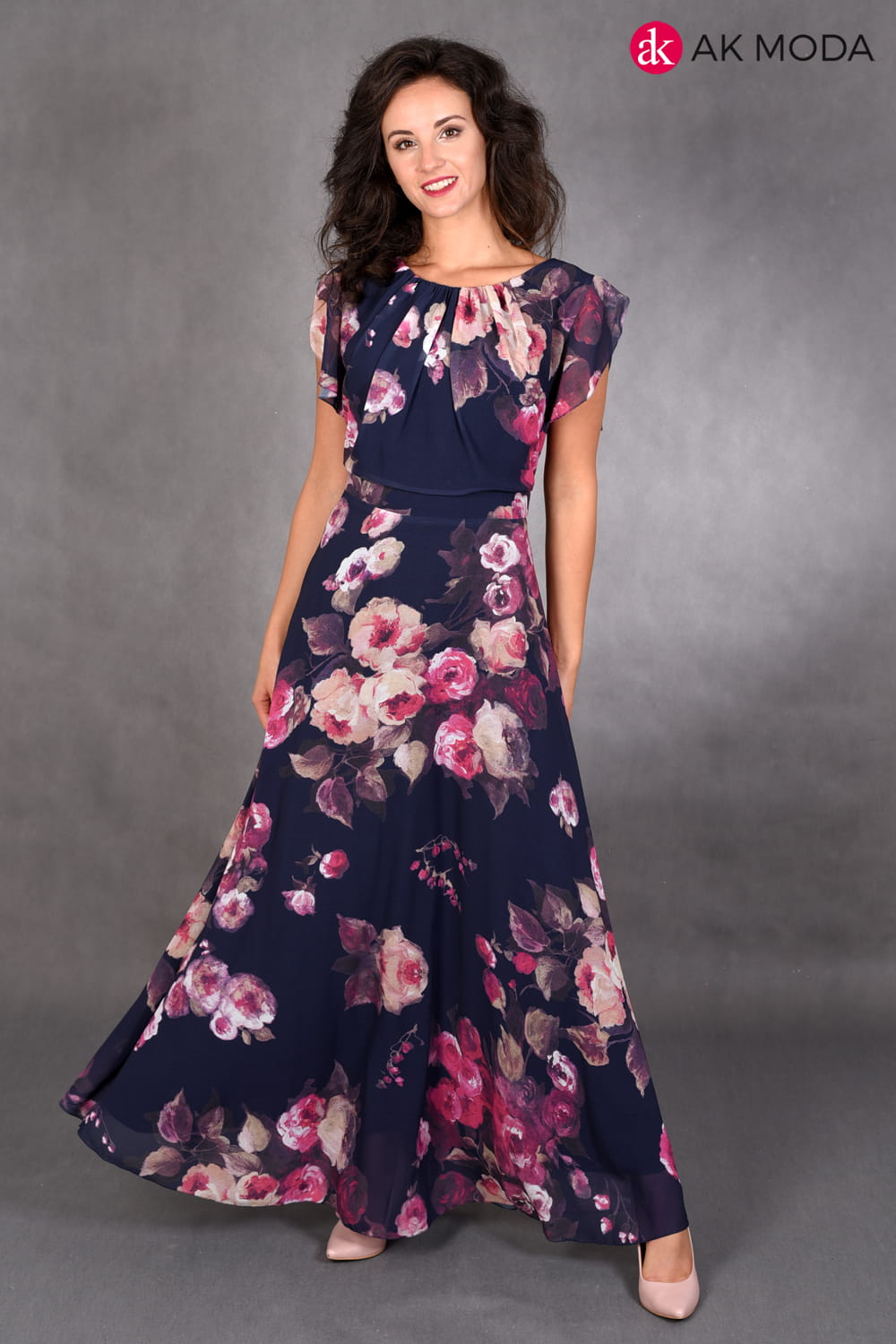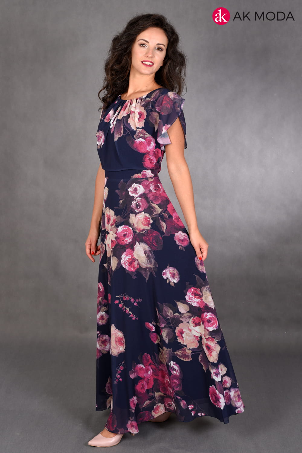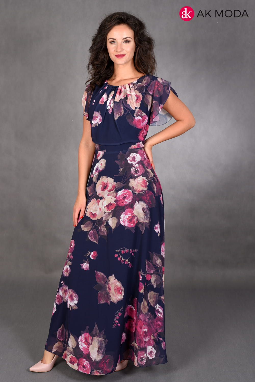 Długa, rozkloszowana sukienka w kolorze granatowym z kwiatowym printem. Przy ramionach falbanki.