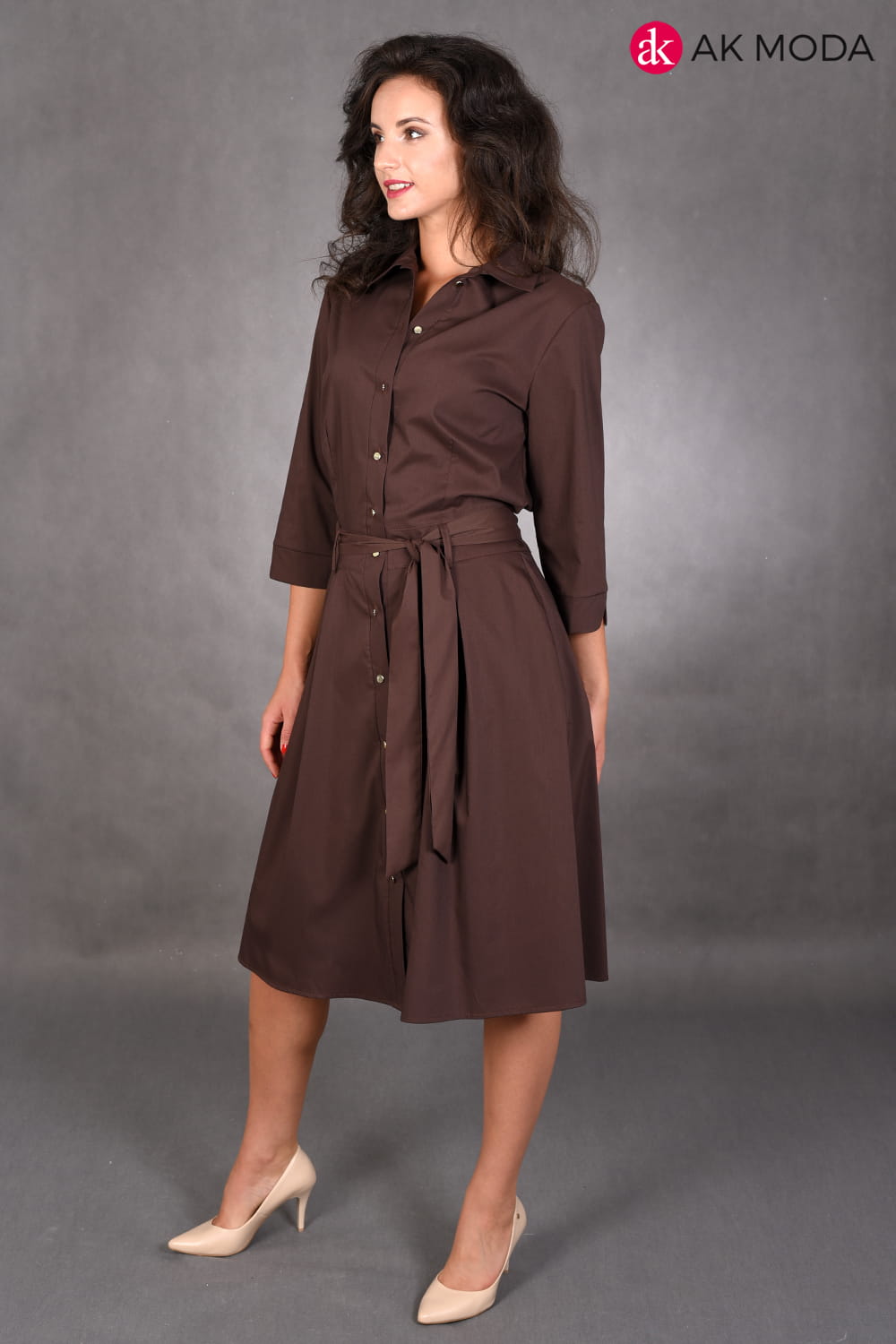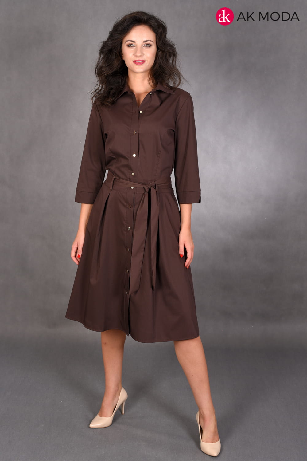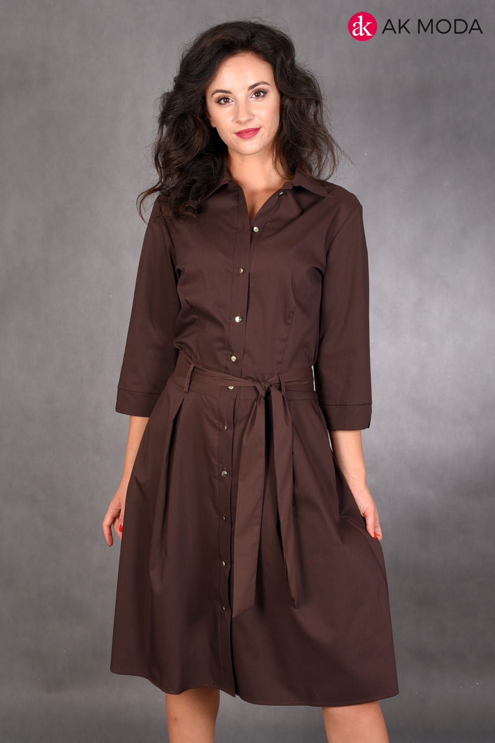 Brązowa szmizjerka z kołnierzykiem i rękawem 3/4 . Z góry do dołu zapinana na guziki, w komplecie wiązany pasek.