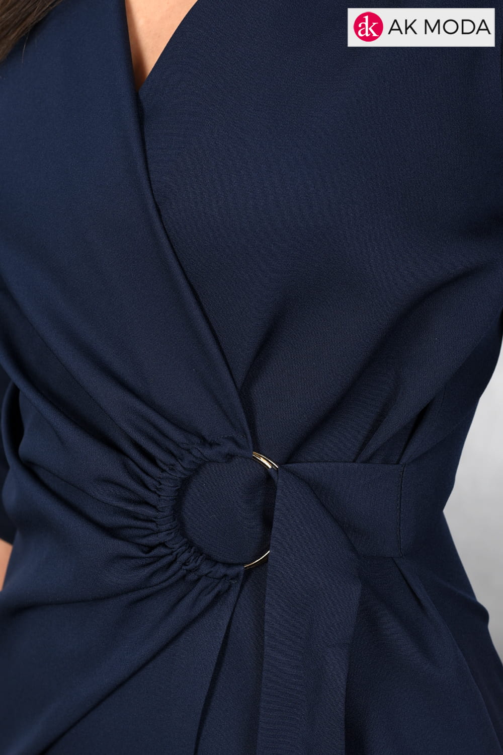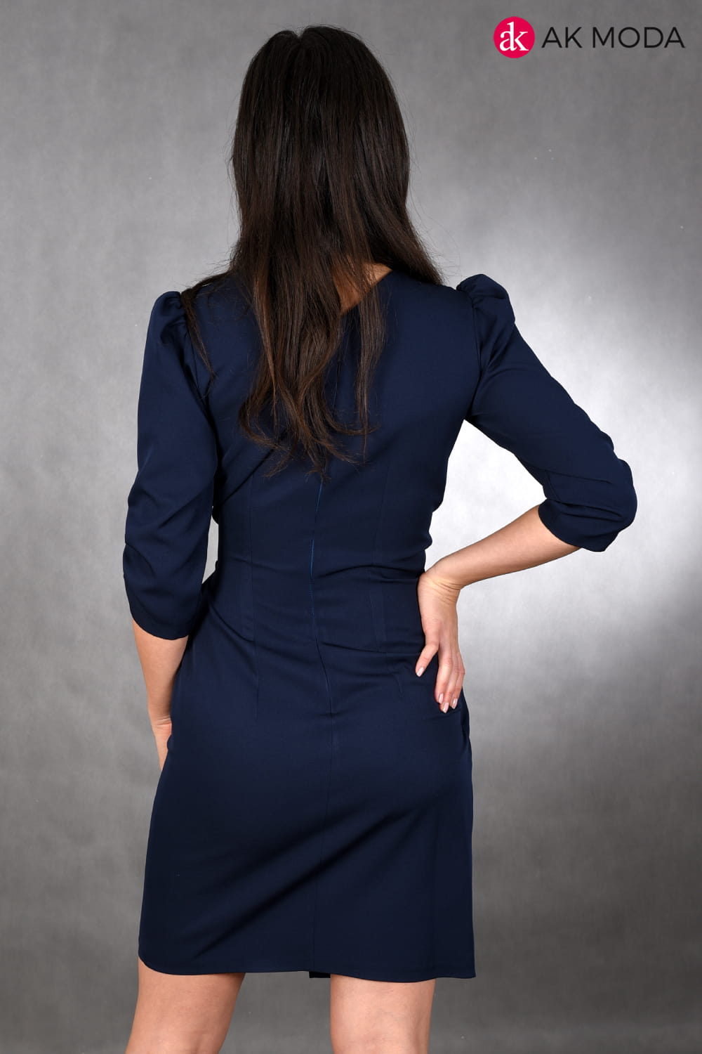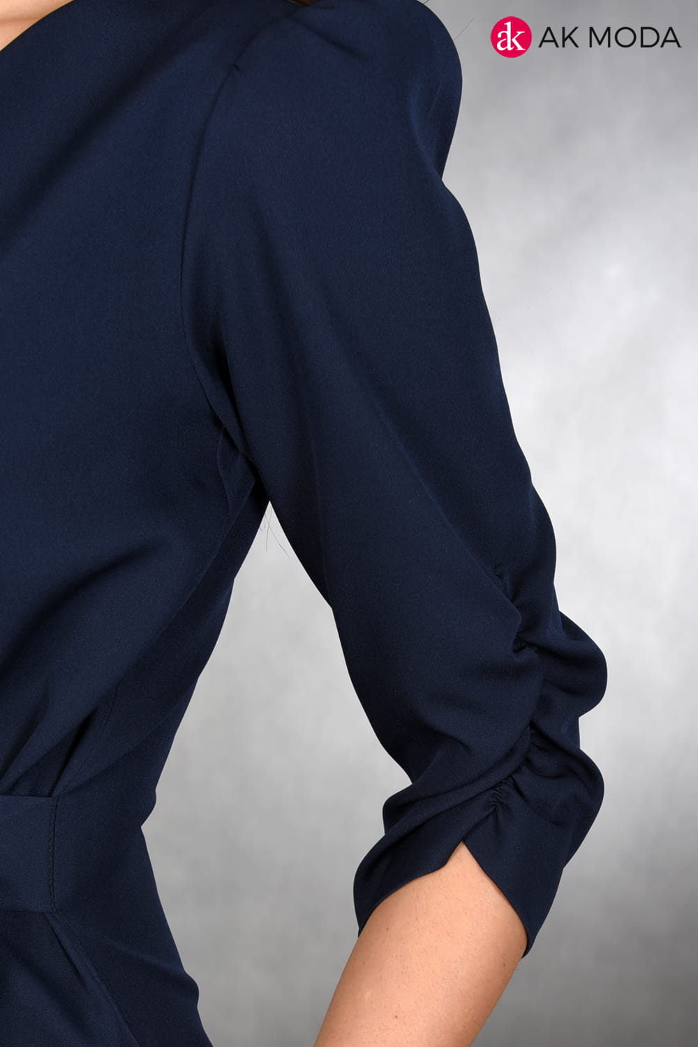 Prosta, zakładana sukienka w kolorze granatowym. Rękaw 3/4 z marszczeniem.