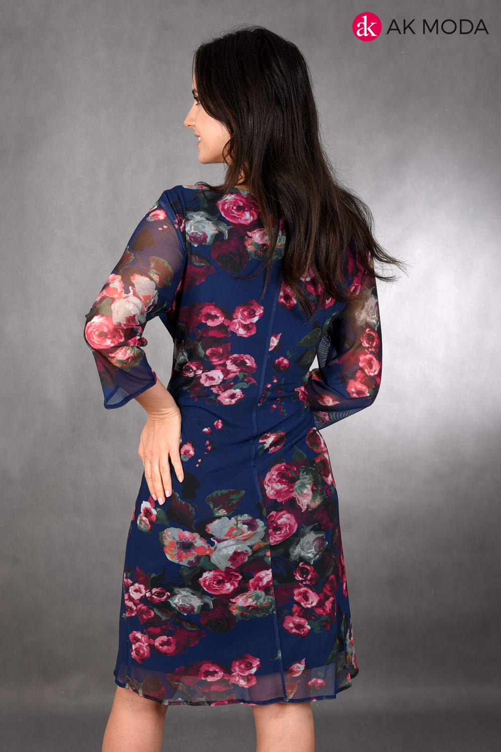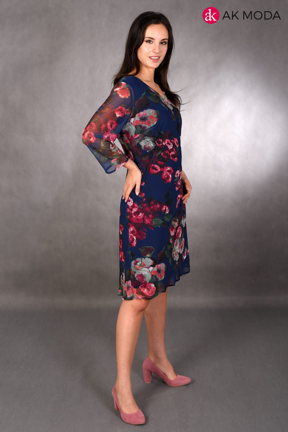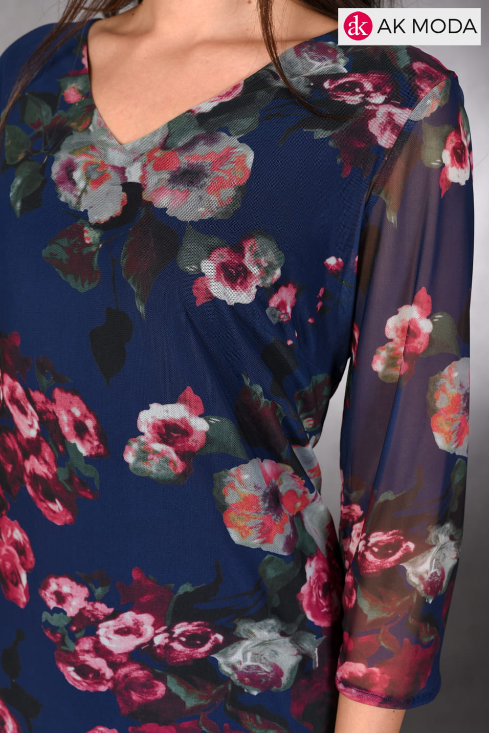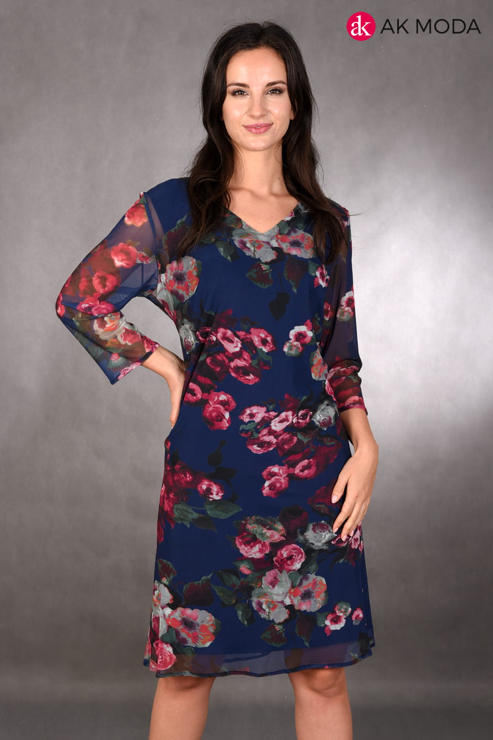 Wzorzysta luźna sukienka z siateczkowej tkaniny z motywem kwiatów na granatowym tle. Dekolt w szpic, rękawy 3/4.