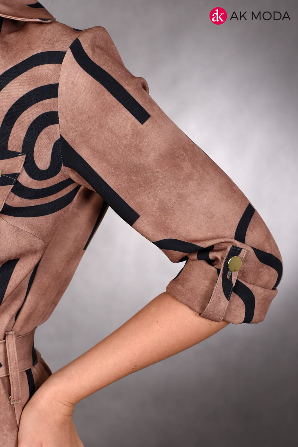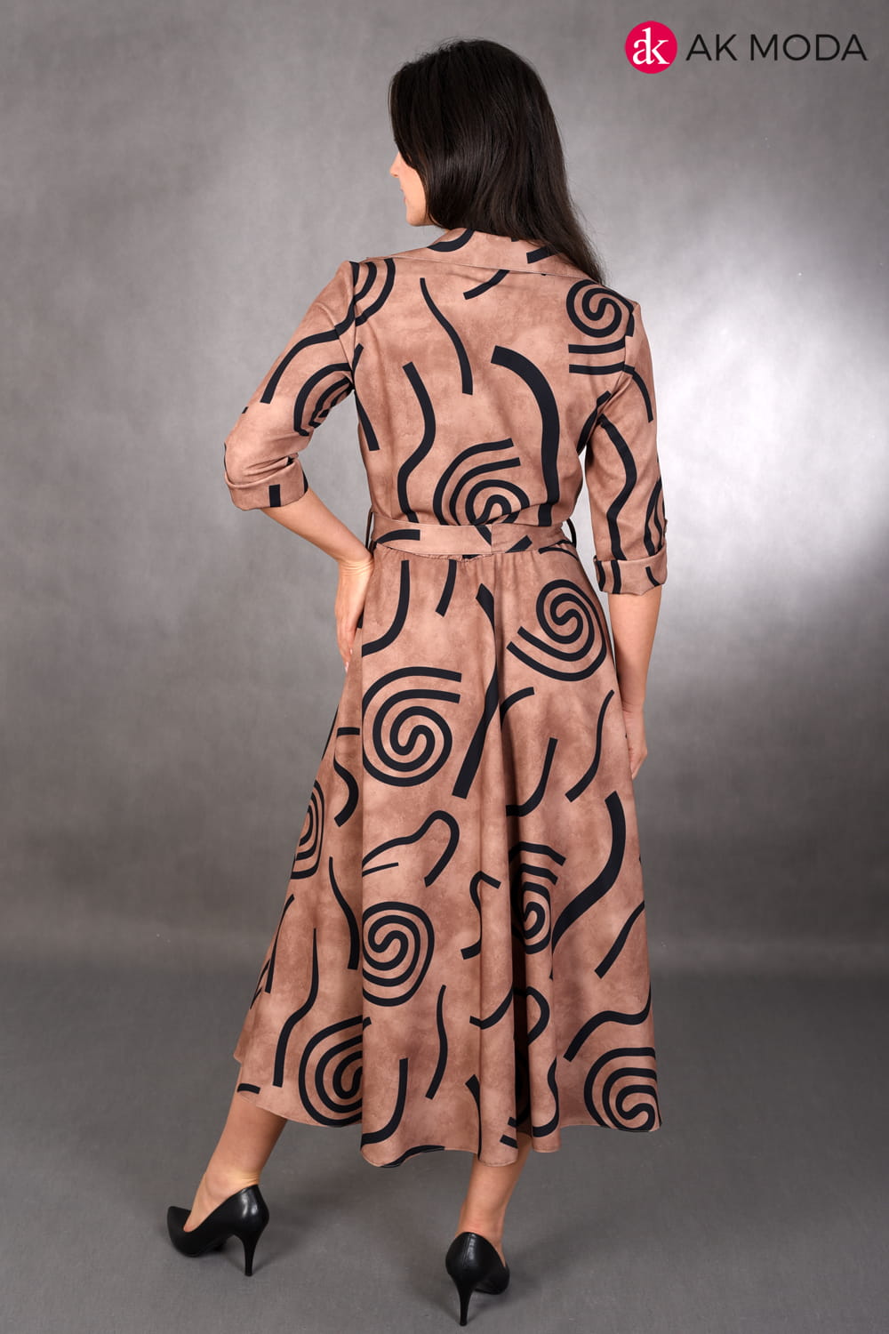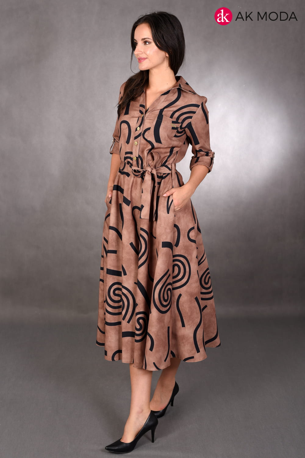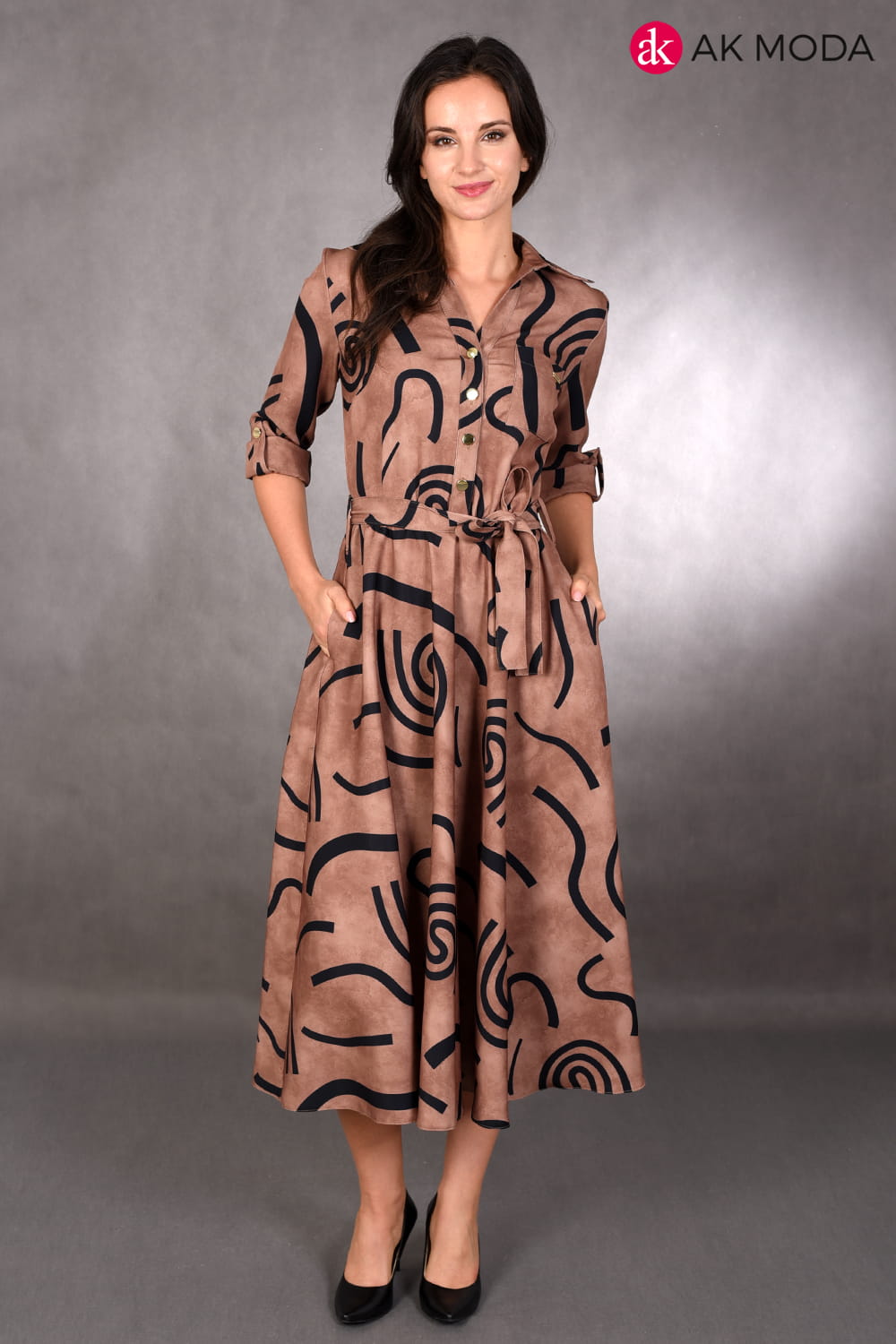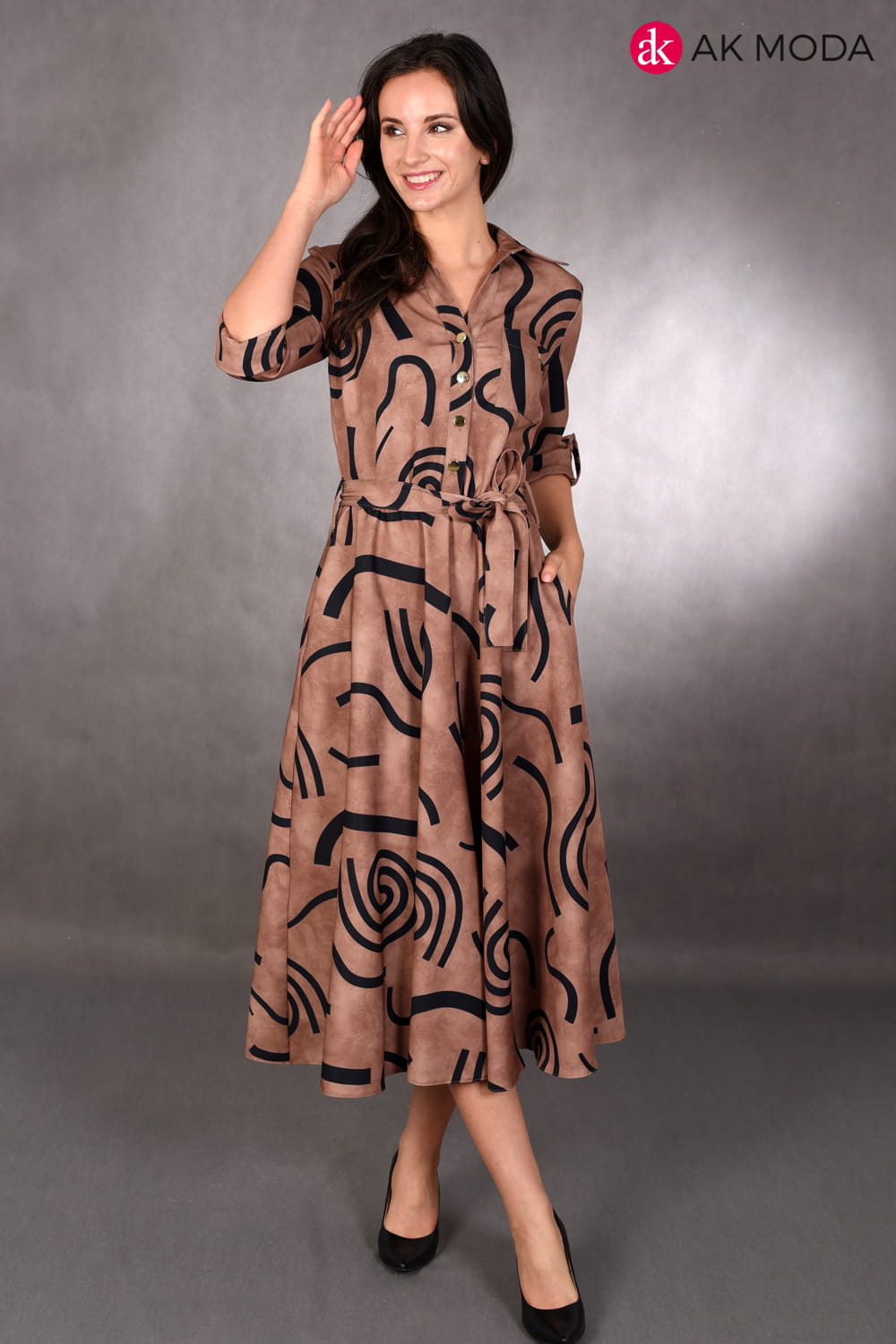 Rozkloszowana sukienka w kolorze brązowym w czarne wzory. Górna część z kołnierzem i zapięciem na guziki, rękaw 3/4, w pasie gumka i pasek, posiada kieszenie.