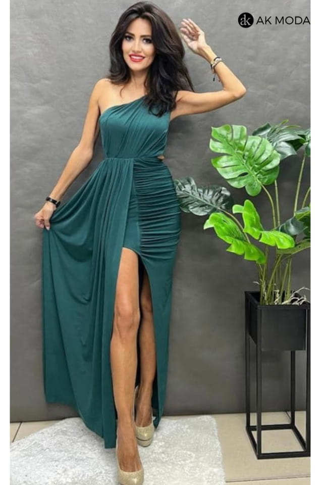 Długa sukienka na jedno ramię uszyta z elastycznego materiału w kolorze zielonym. Z przodu efektowne marszczenia i wycięcie w pasie.