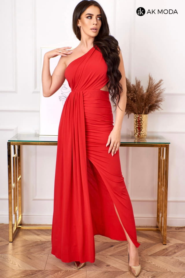 Długa sukienka na jedno ramię uszyta z elastycznego materiału w kolorze czerwonym. Z przodu efektowne marszczenia i wycięcie w pasie.