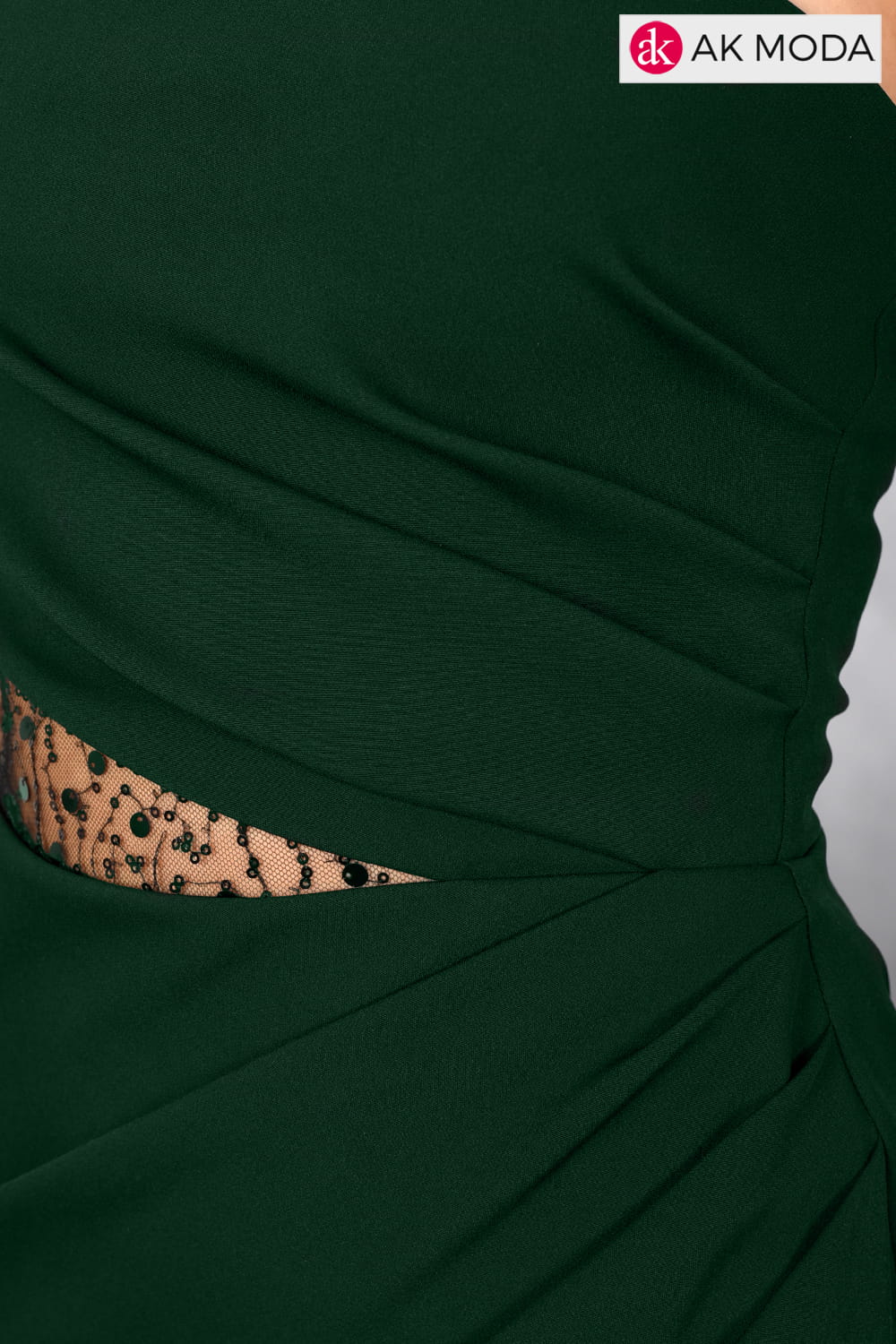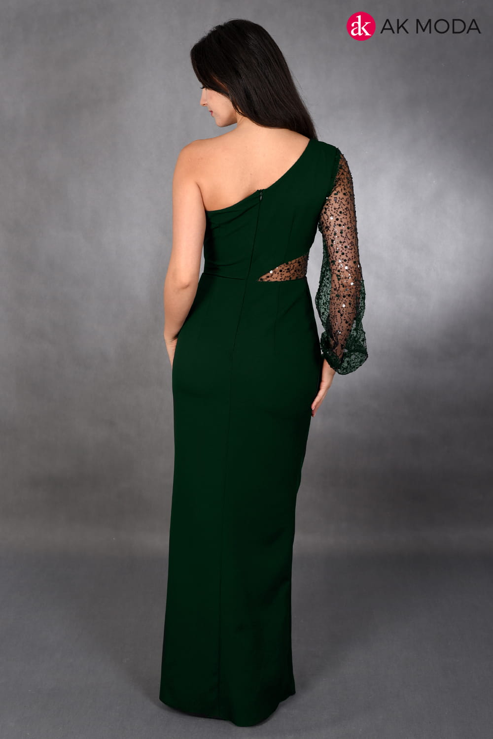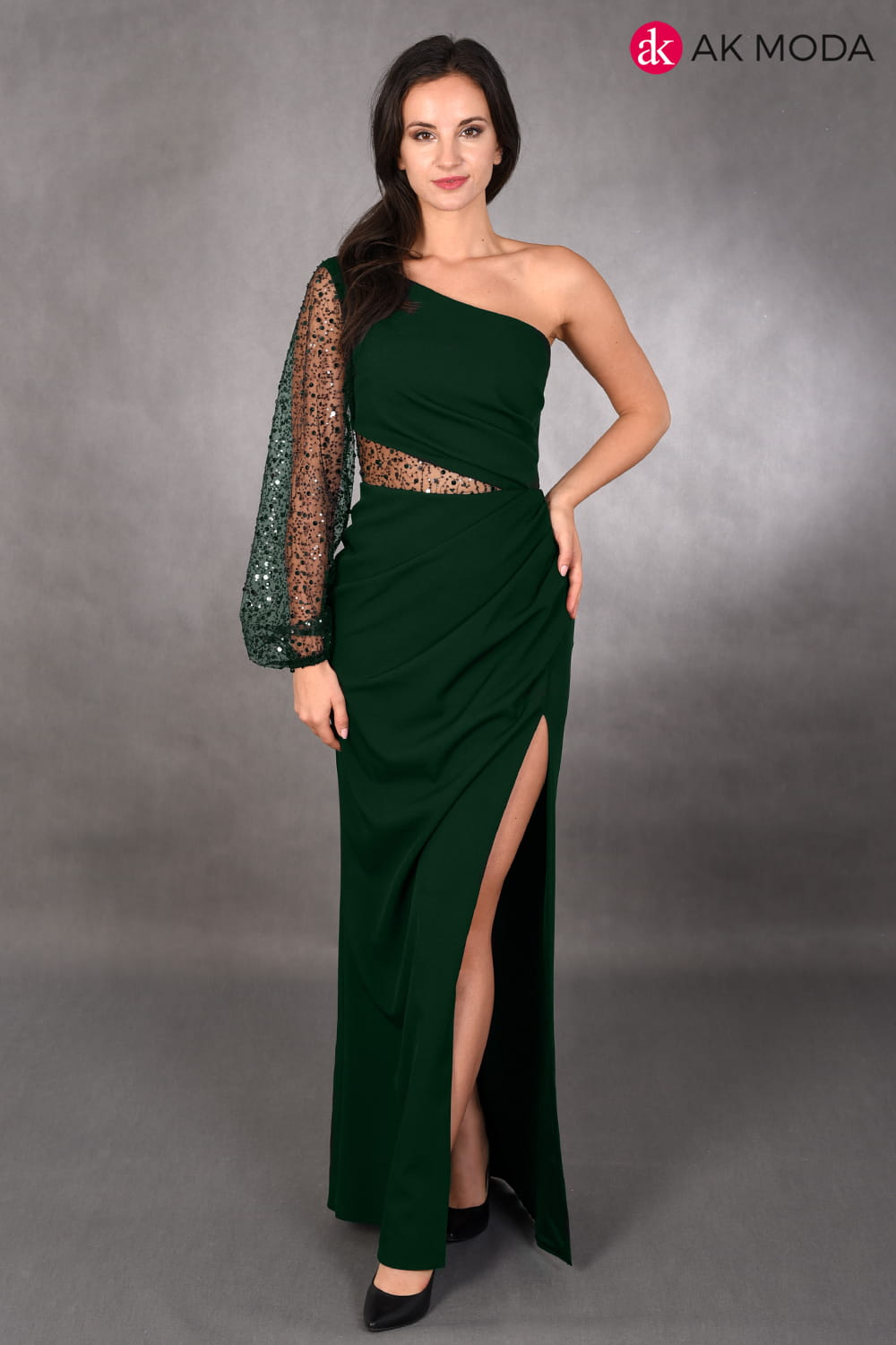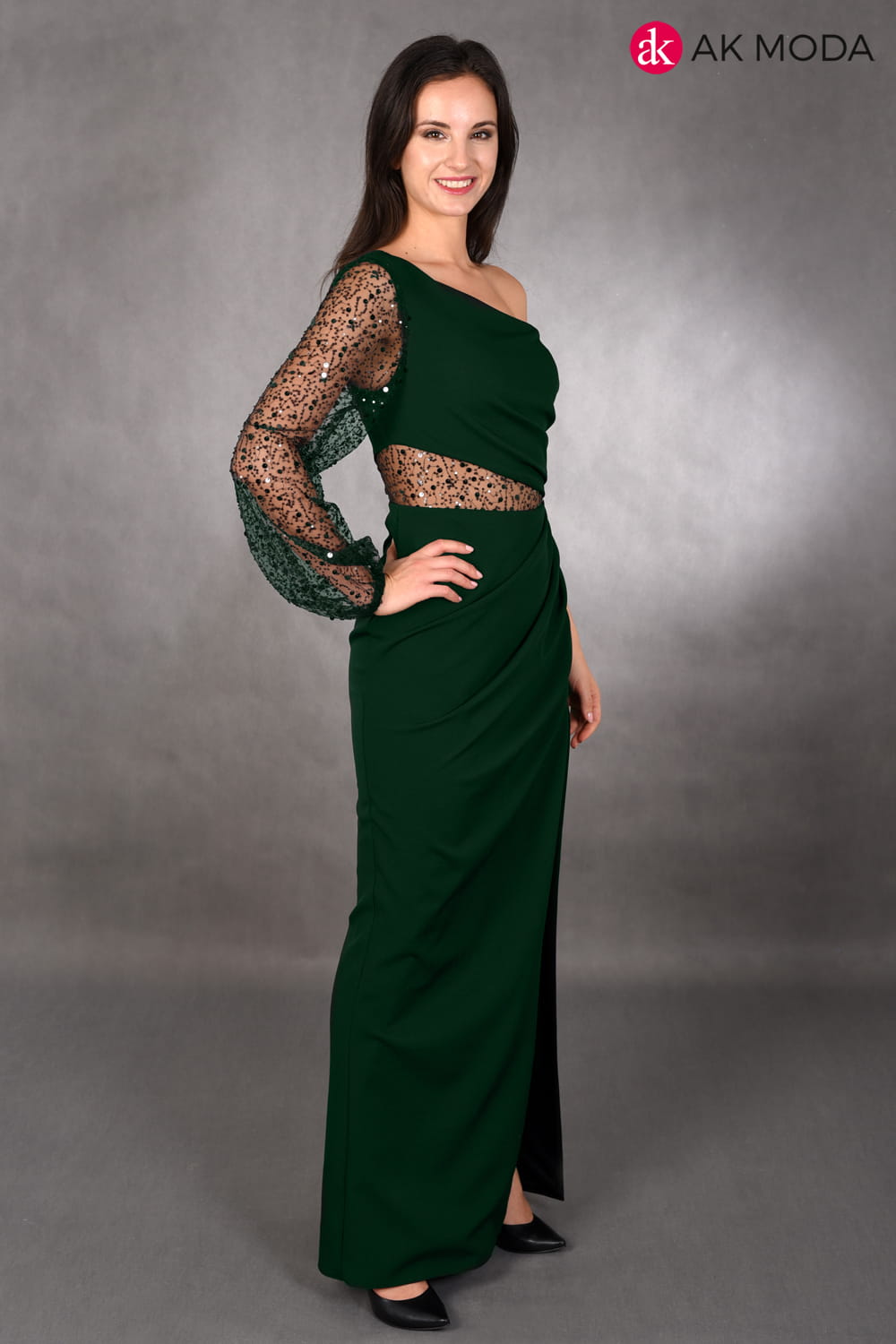 Długa dopasowana sukienka na jedno ramię, w kolorze zielonym. Efektownie marszczona na boku, w pasie cekinowa wstawka, rękaw długi cekinowy.