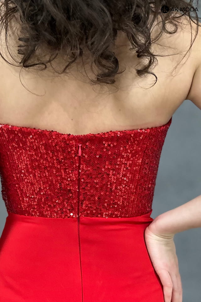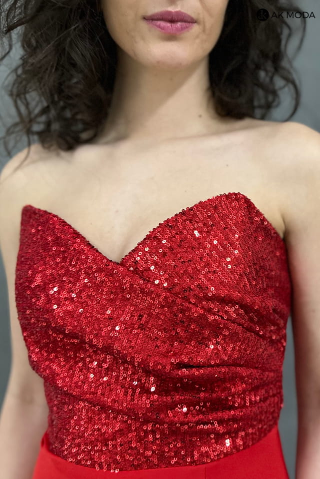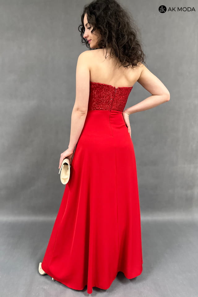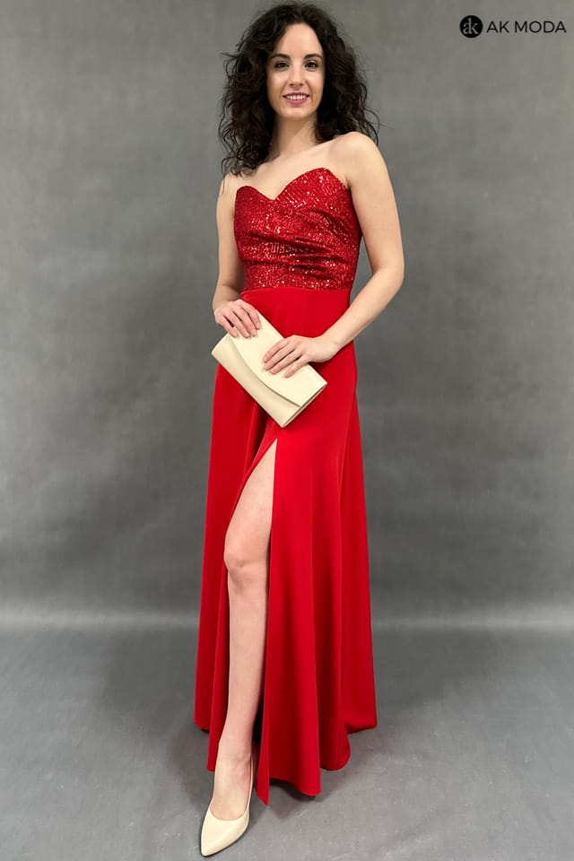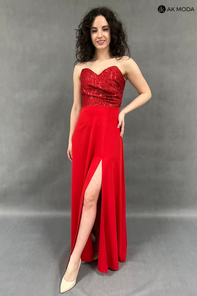 Długa czerwona sukienka z odpinanymi ramiączkami. Góra sukienki z cekinów, dekolt kopertowy.