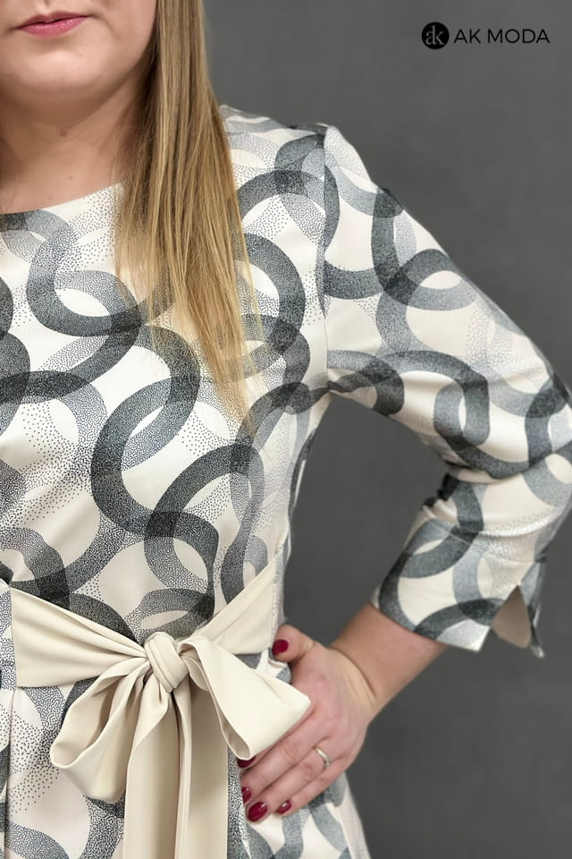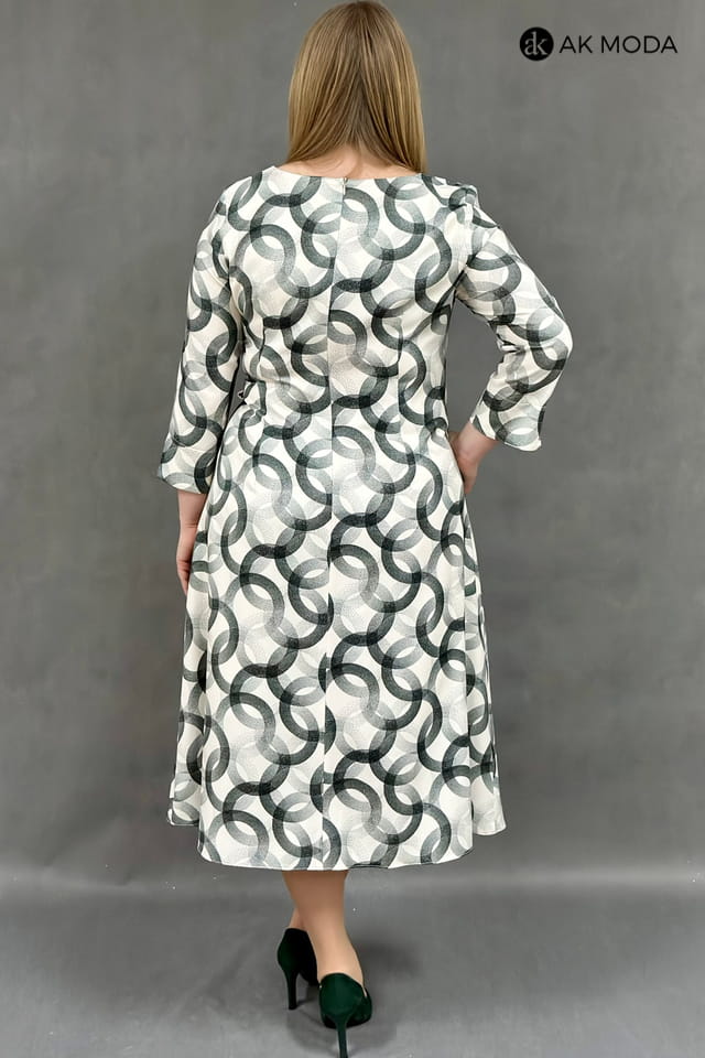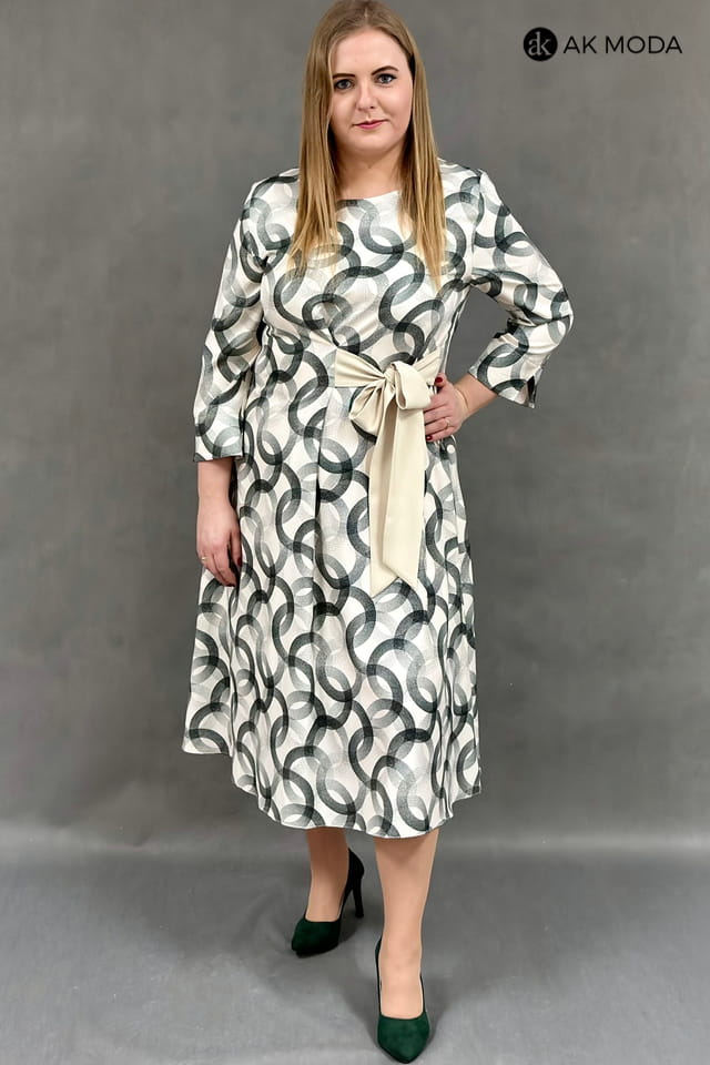 Rozkloszowana sukienka midi z zielonym motywem na beżowym tle. Rękaw 3/4, w talii wiązany pasek.