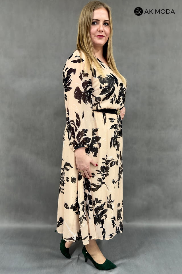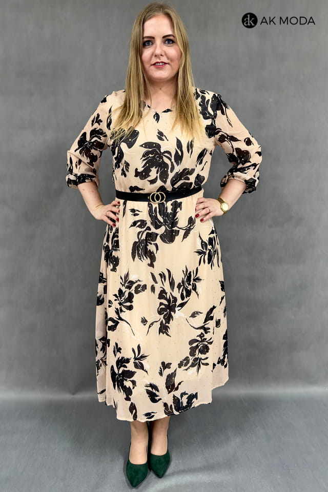 Rozkloszowana sukienka midi w kolorze beżowym w czarny wzór ze złottymi akcentami. Rękaw 3/4, w pasie gumka i pasek.