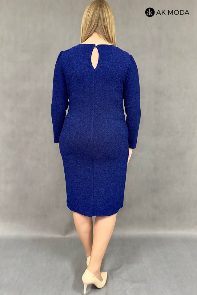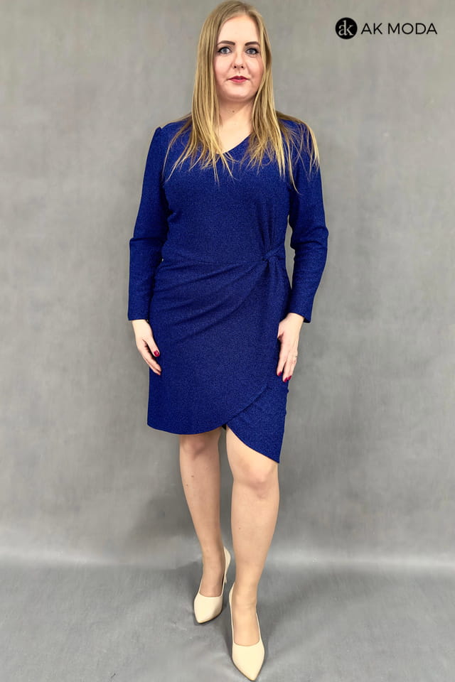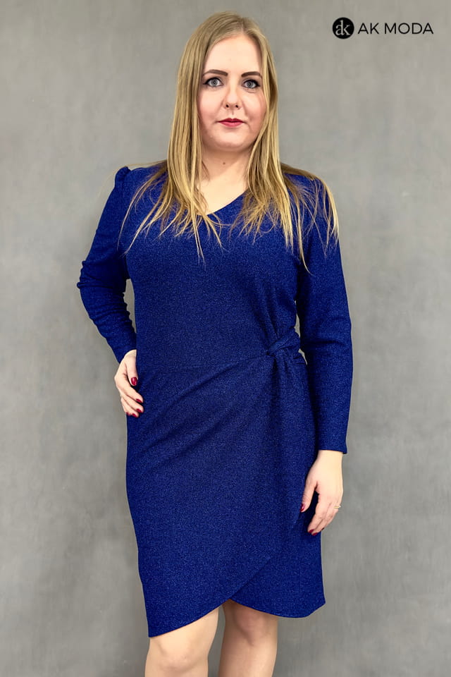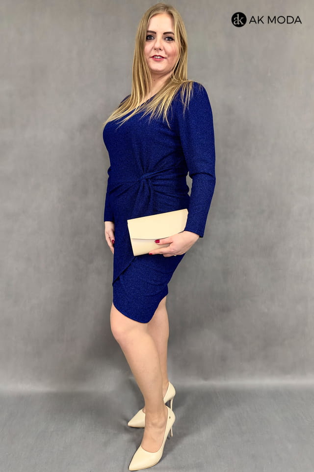 Prosta granatowa sukienka z długim rękawem, uszyta z elastycznego, błyszczącego materiału. Dół zakładany, dekolt w szpic.