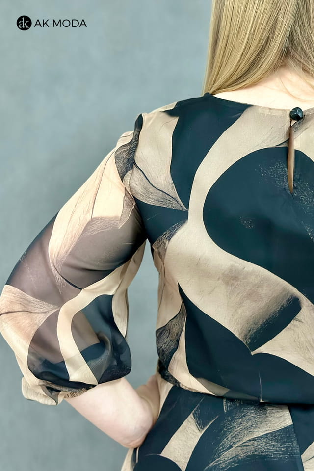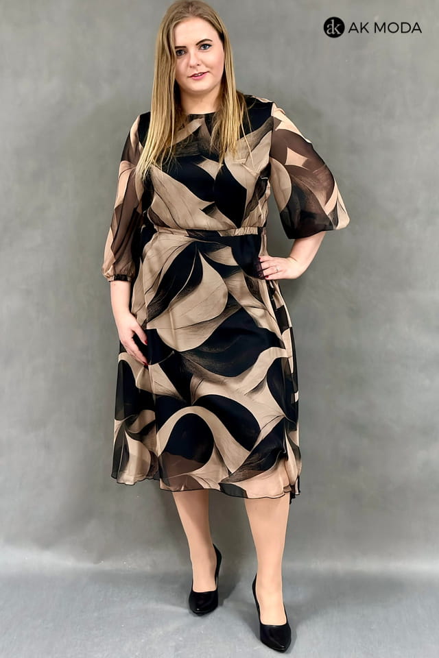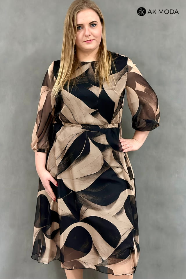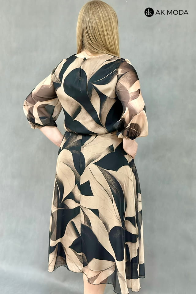 Sukienka midi w beżowe wzory na czarnym tle. Transparentne rękawy 3/4, w talii gumka i pasek.