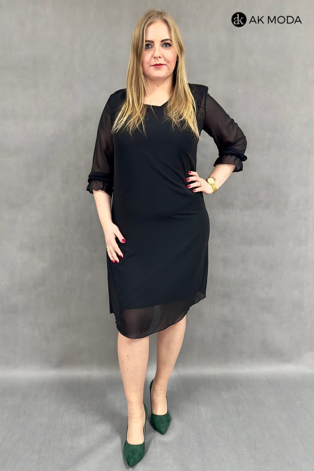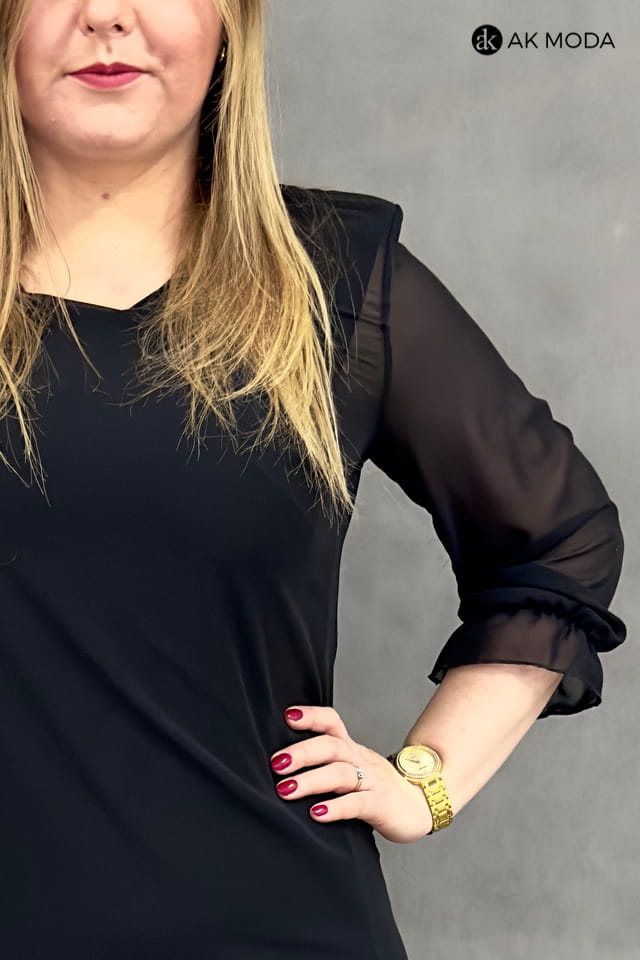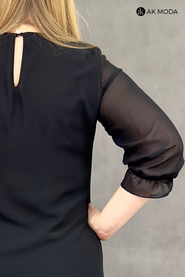 Czarna sukienka w kształcie literki A z transparentnym rękawem 3/4.