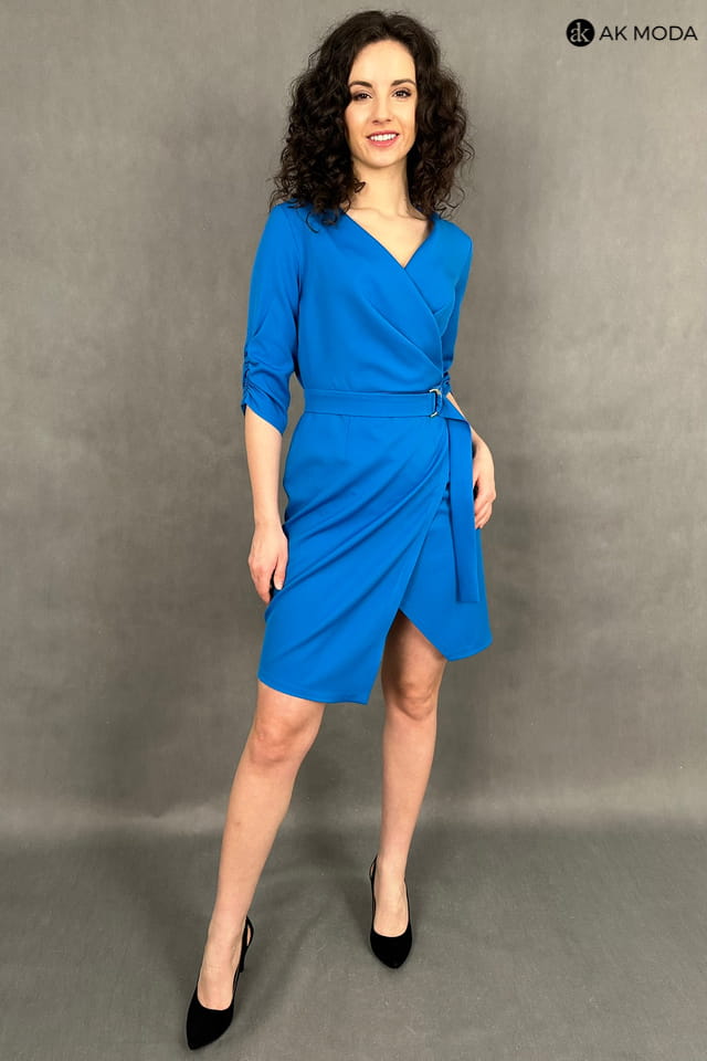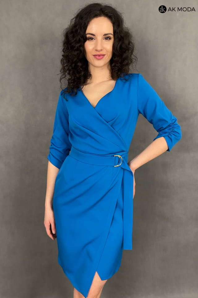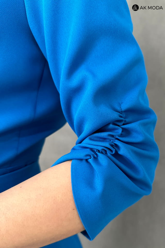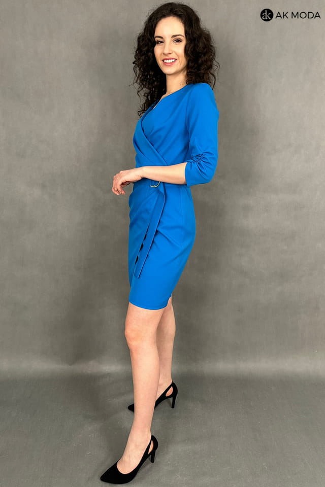 Dopasowana sukienka w kolorze niebieskim z zakładanym, asymetrycznym dołem. Fason odcinany w talii, rękaw 3/4 z marszczeniem.