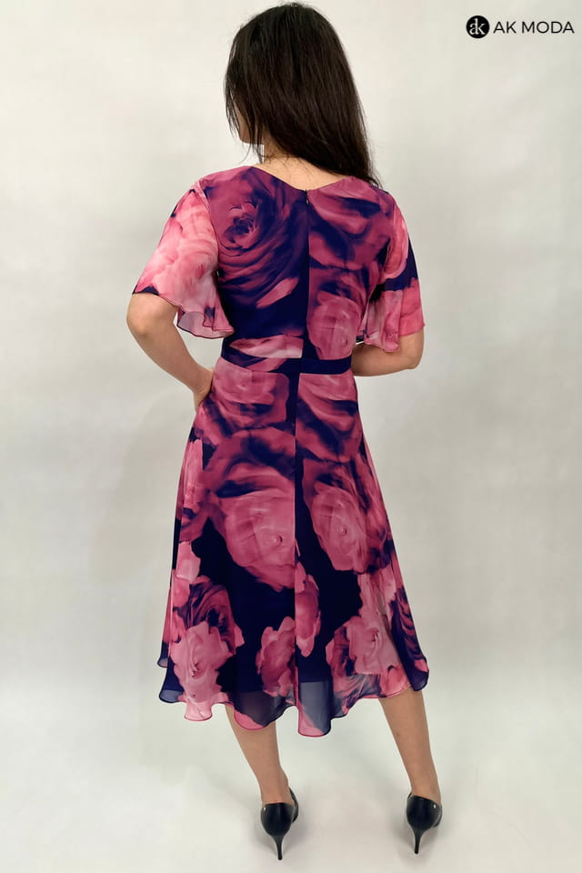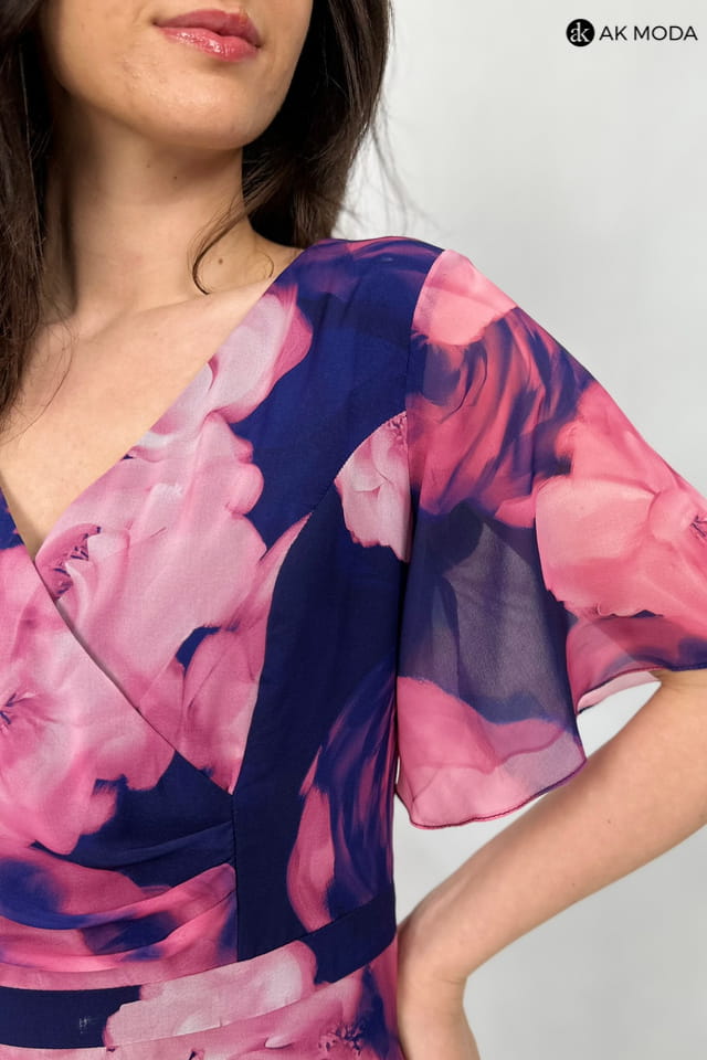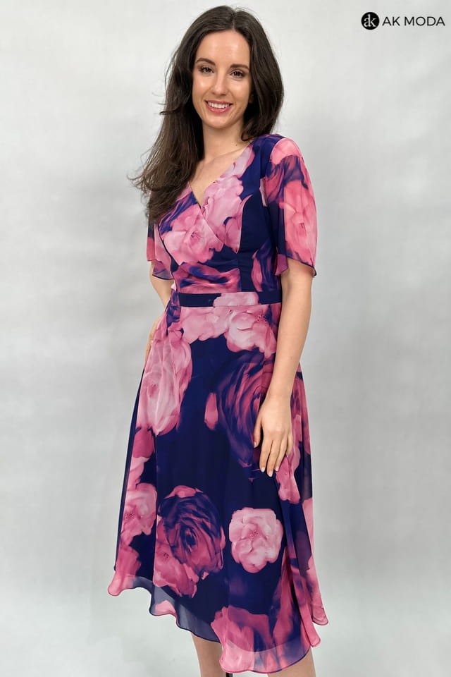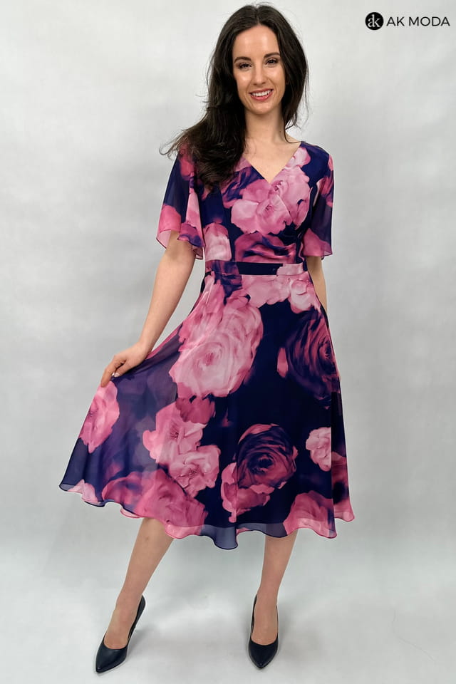 Rozkloszowana sukienka midi w różowe kwiaty na granatowym tle. Dekolt zakładany, krótki luźny rękaw.