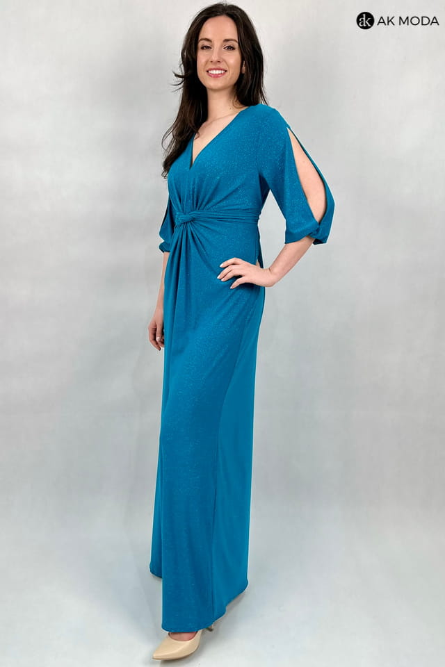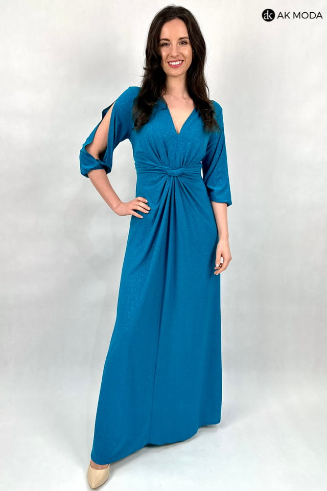 Długa sukienka w kolorze turkusowym z drobinkami brokatu, z efektownym upięciem w talii. Dekolt w szpic, rękaw 3/4 z pęknięciami, z tyłu wiązany pasek.