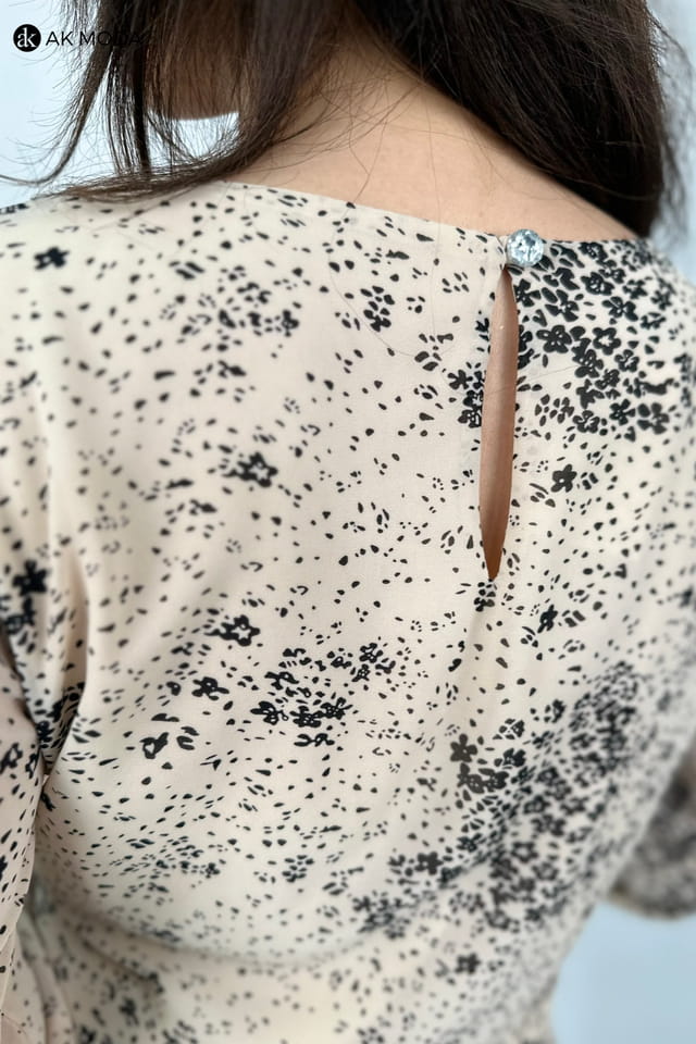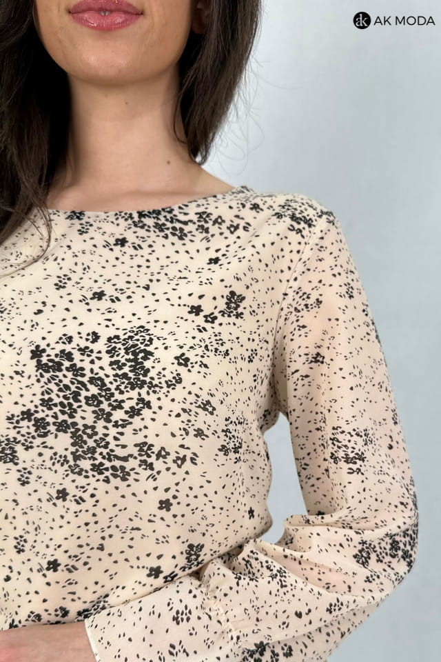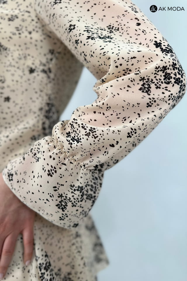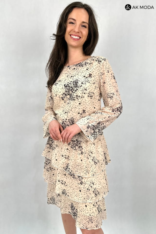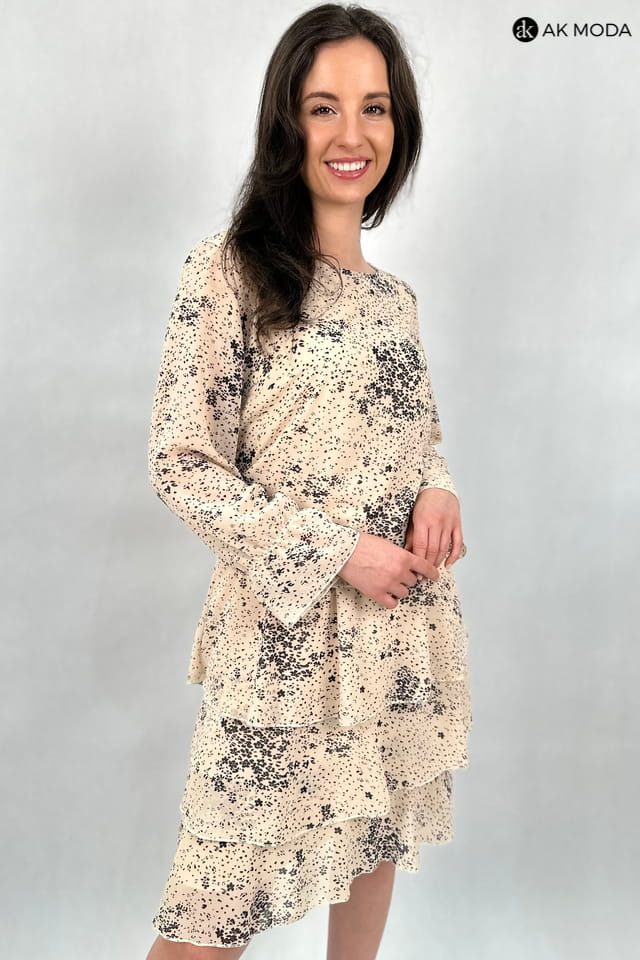 Krótka beżowa sukienka z falbankami w czarny wzorek. Góra lużniejsza, w pasie gumka, długi transparentny rękaw.
