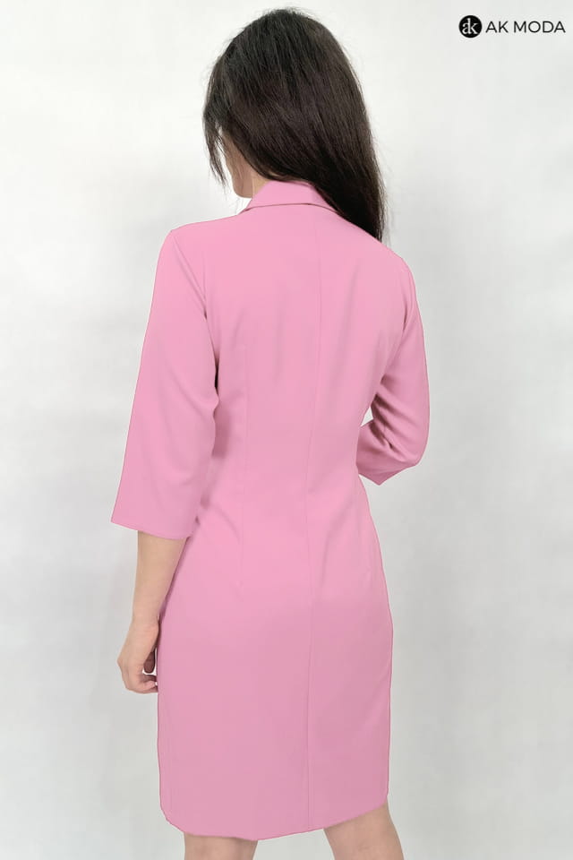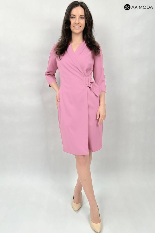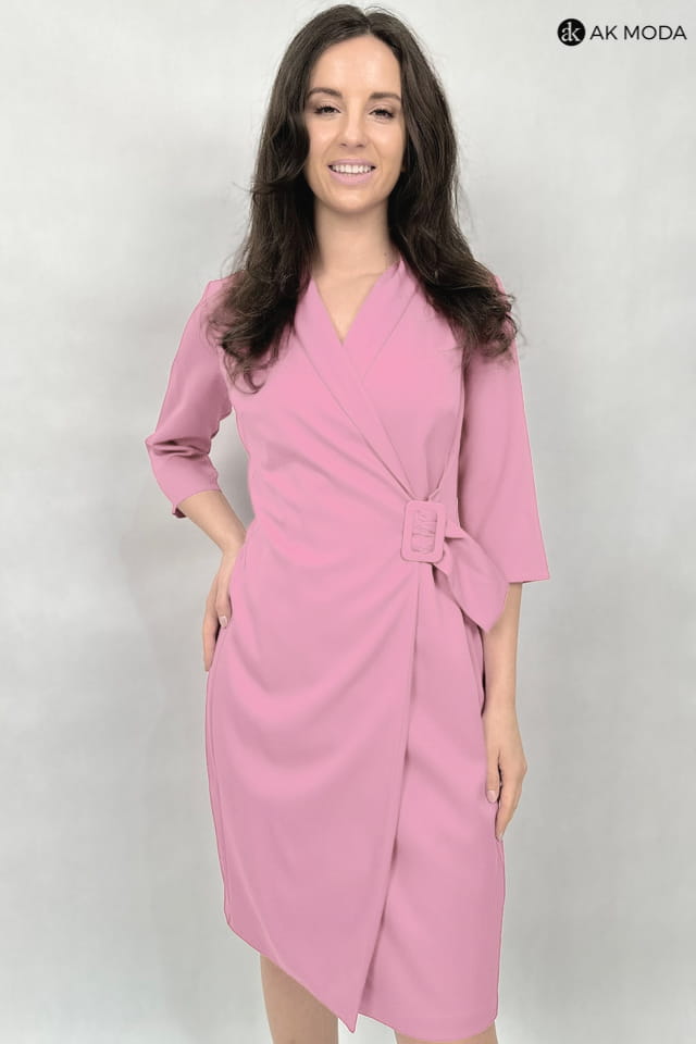 Prosta, zakładana sukienka w kolorze brudnego pudrowego różu z rękawem 3/4 .
