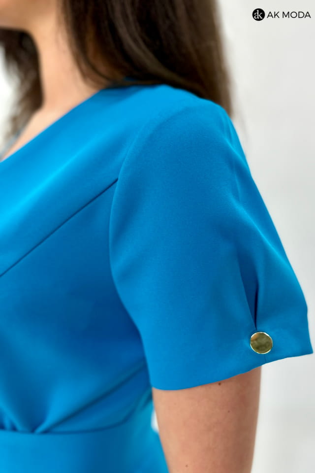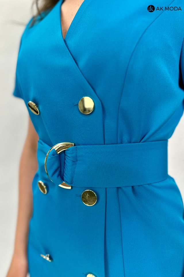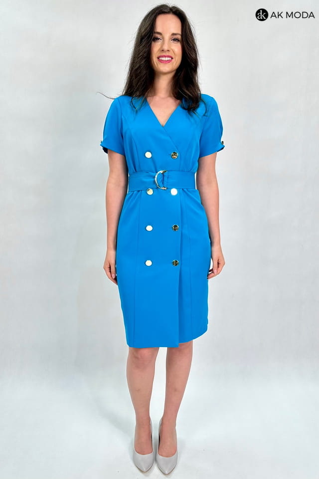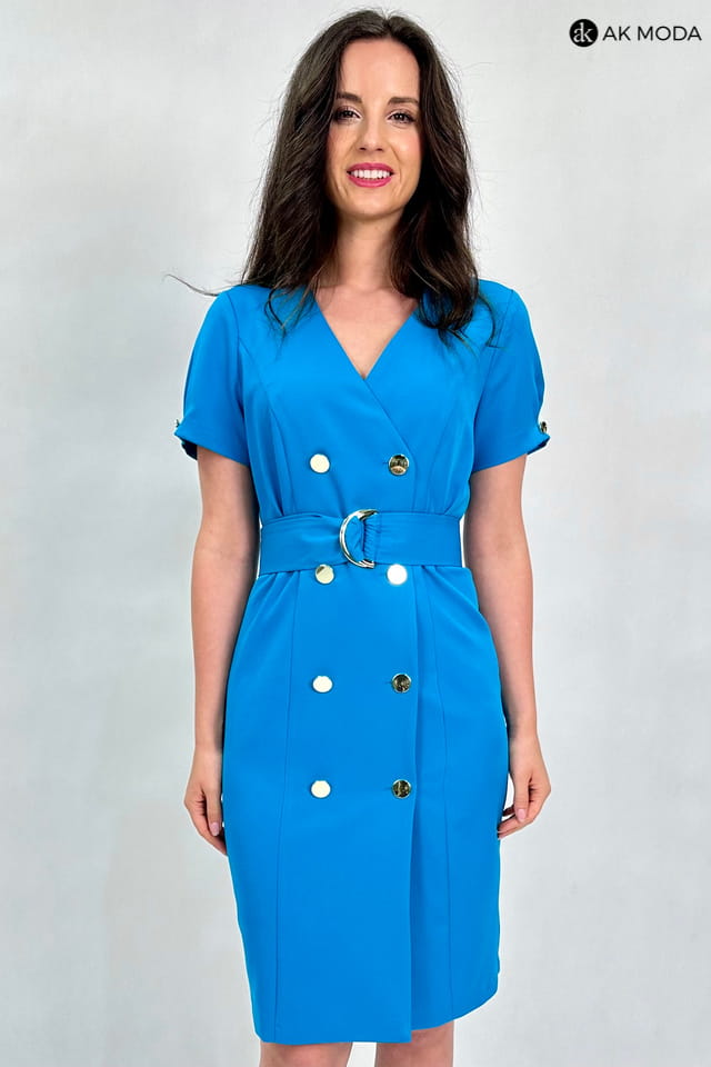 Sukienka szmizjerka w kolorze morskim, zapinana na guziki. W talii pasek z ozdobną klamrą, krótkie, bufiaste rękawy.