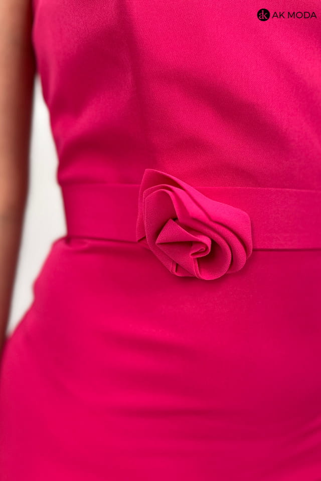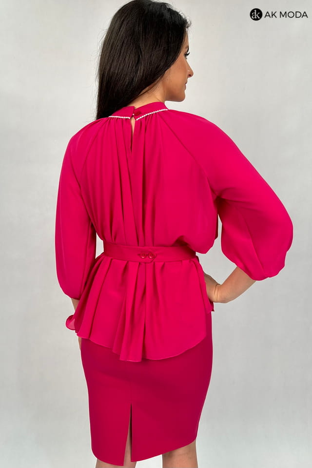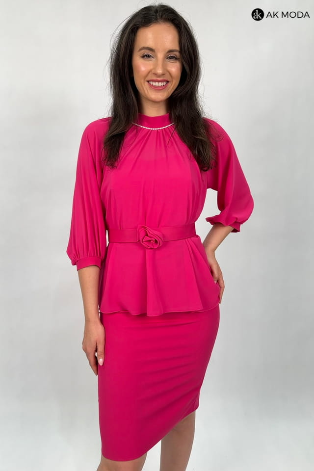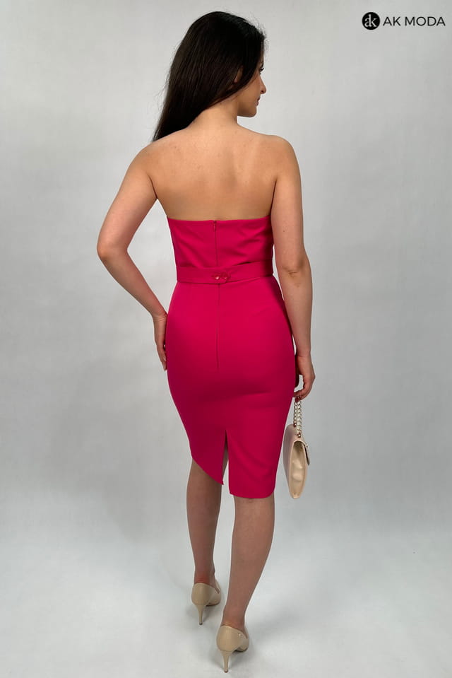 Krótka, gorsetowa sukienka w kolorze fuksjowym z paskiem. W zestawie luźna tiulowa narzutka z rękawem 3/4 i stójką.
