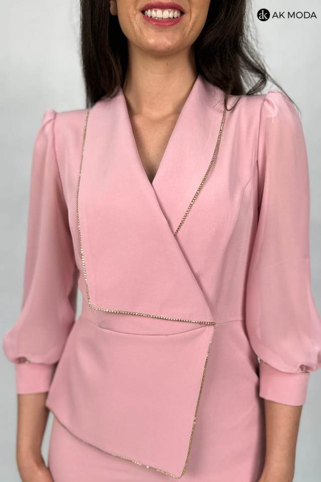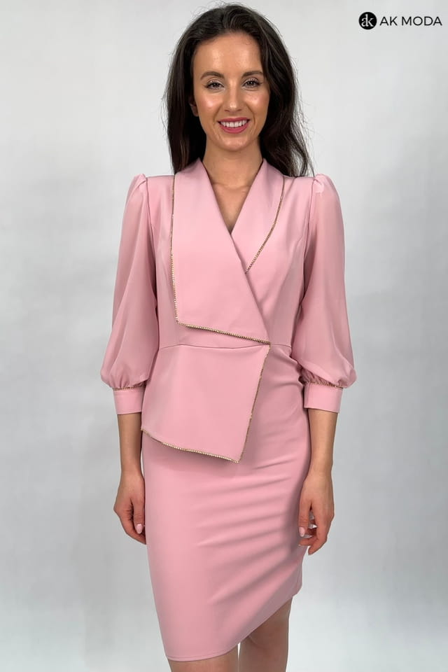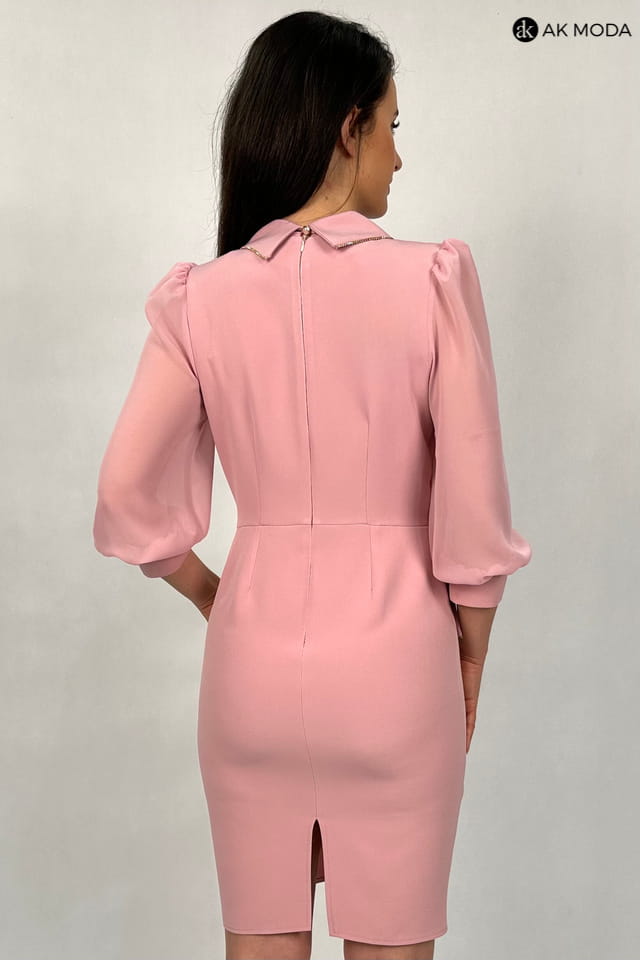 Krótka, dopasowana sukienka w kolorze różowym. Dekolt kopertowy z szalowym, ozdobnym kołnierzem, transparentne rękawy 3/4 zakończone mankietem.