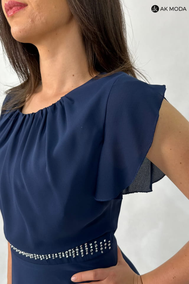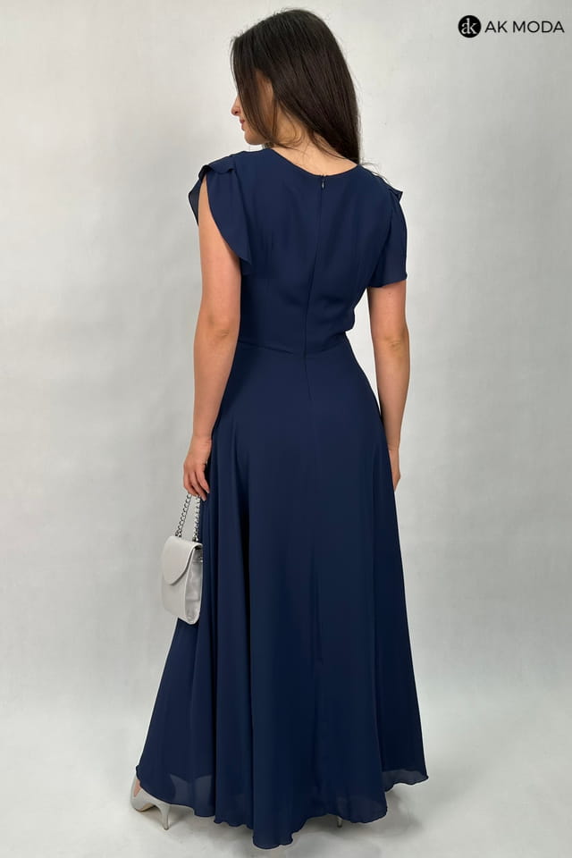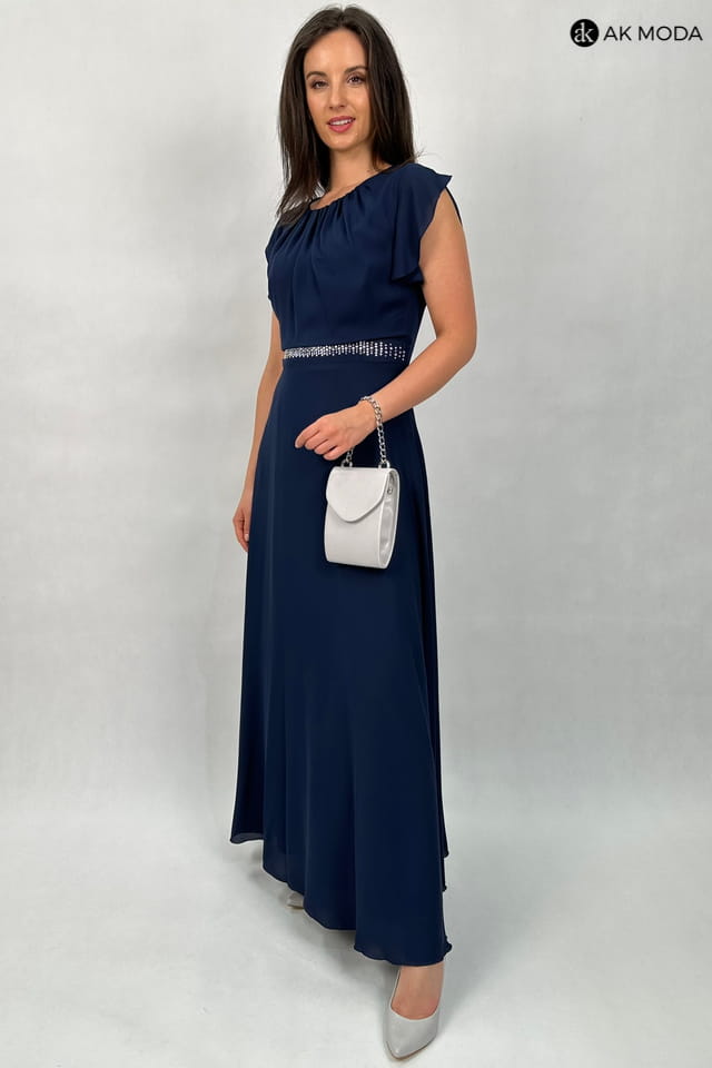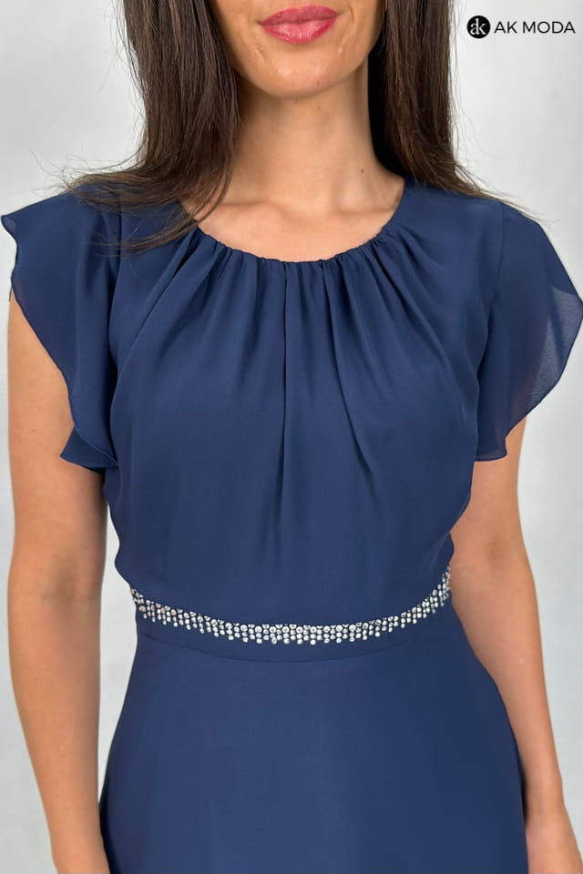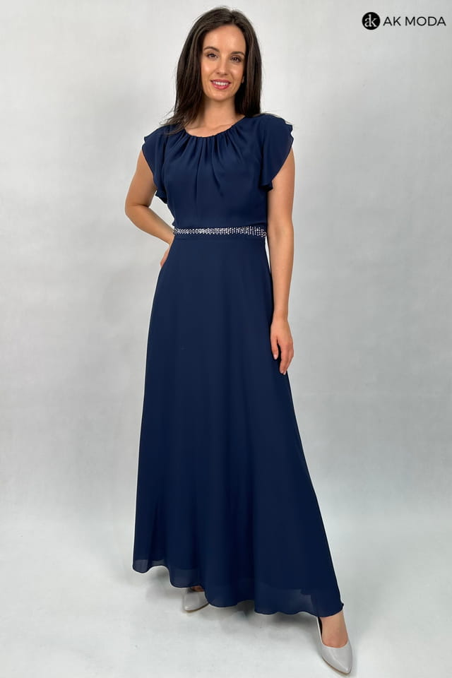 Długa, rozkloszowana sukienka w kolorze granatowym. W pasie ozdobne koraliki, przy dekolcie marszczenie, rekawki w formie falbanki.