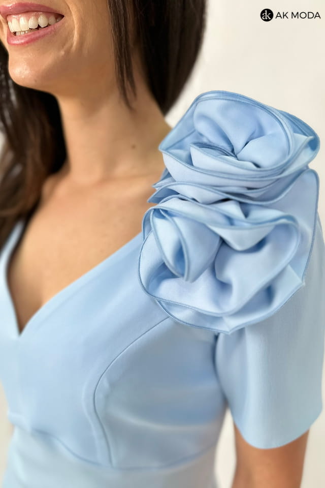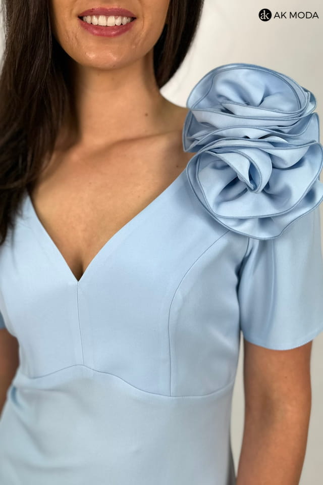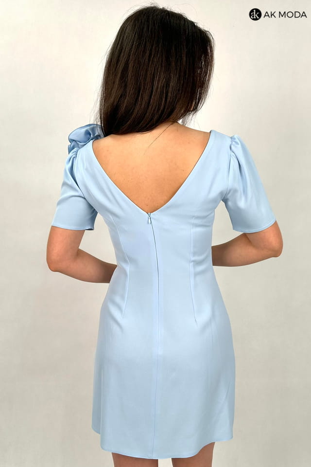 Krótka, dopasowana sukienka w kolorze błękitnym z krótkim rękawem. Dekolot w serek, odpinana ozdoba przy dekolcie.