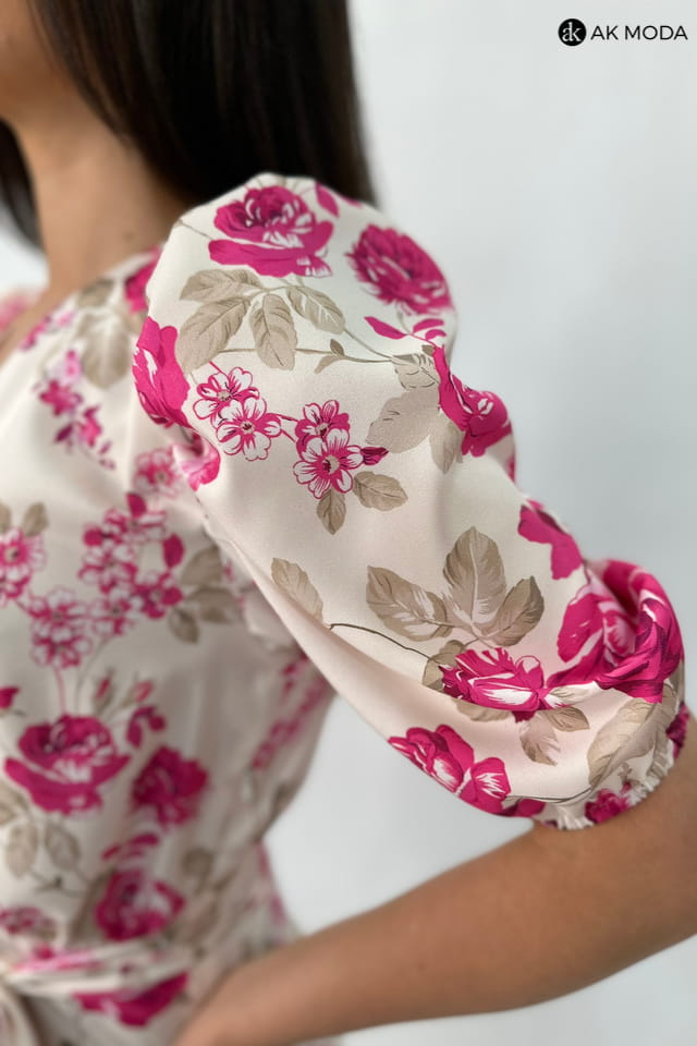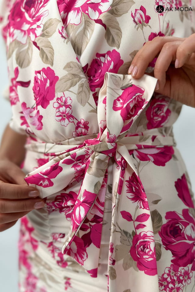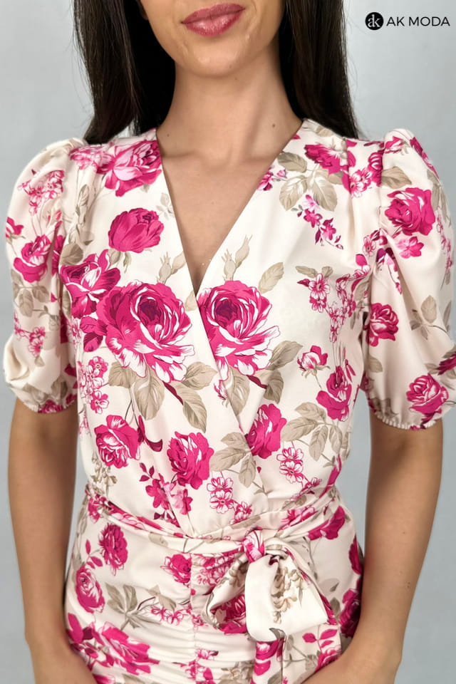Krótka, dopasowana sukienka w kolorze beżowym w różowe kwiaty. Krótkie bufiaste rękawy, dekolt kopertowy, w talii pasek.