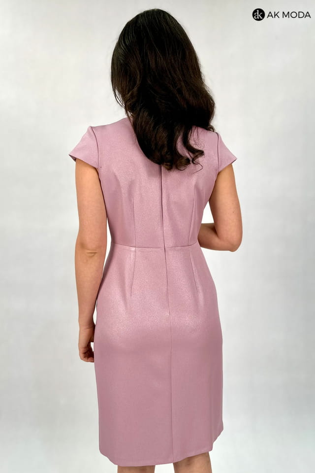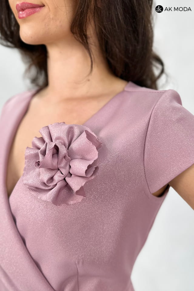 Krótka, dopasowana sukienka w kolorze fioletowym z błyszczącymi drobinkami. Fason odcinany w talii, dekolt kopertowy, odpinany ozdobny kwiat.