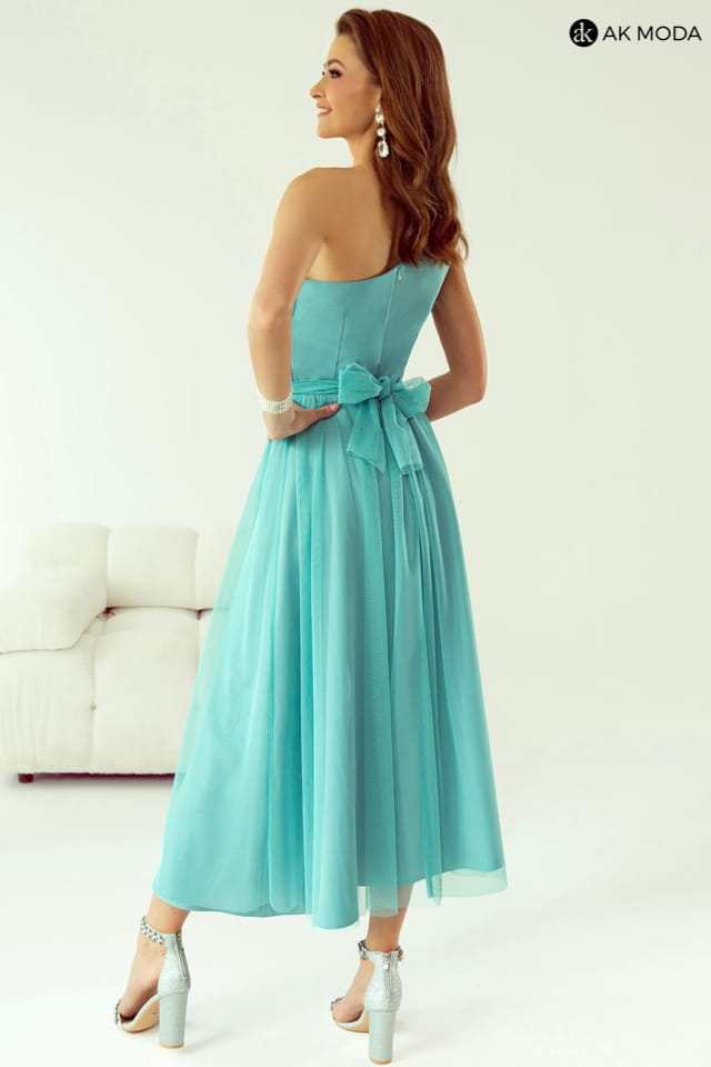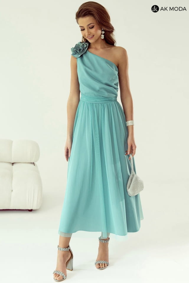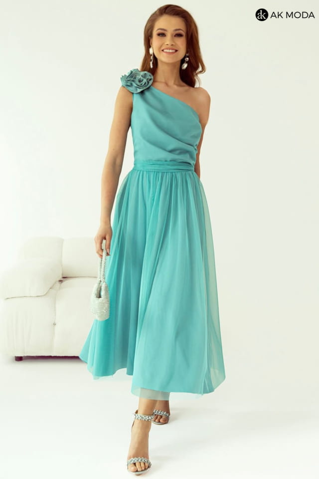 Rozkloszowana sukienka midi na jedno ramię w kolorze miętowym. Wierzchnia warstwa tiulowa, ozdoba odpinana.