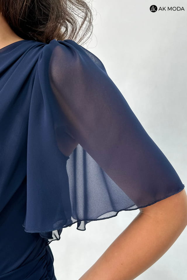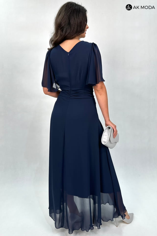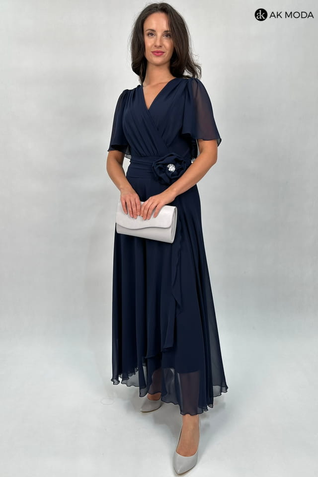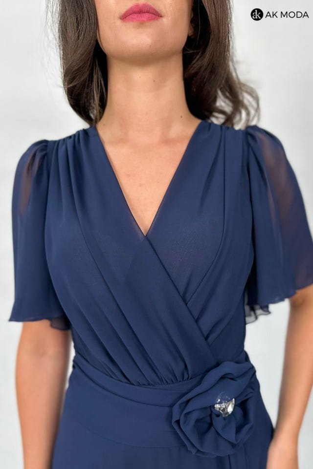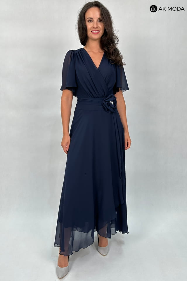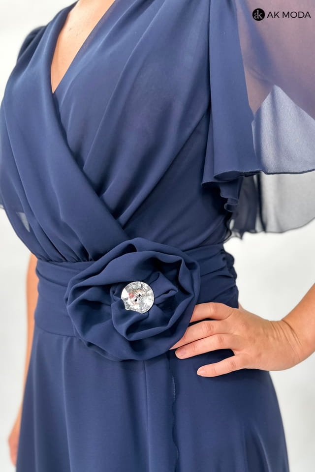 Długa, rozkloszowana sukienka w kolorze granatowym z ozdobnym kwiatem w talii. Dekolt kopertowy, krótkie, luźne rękawki.