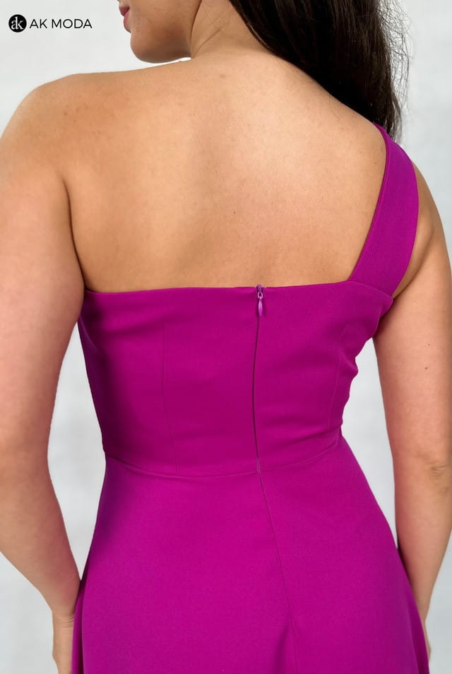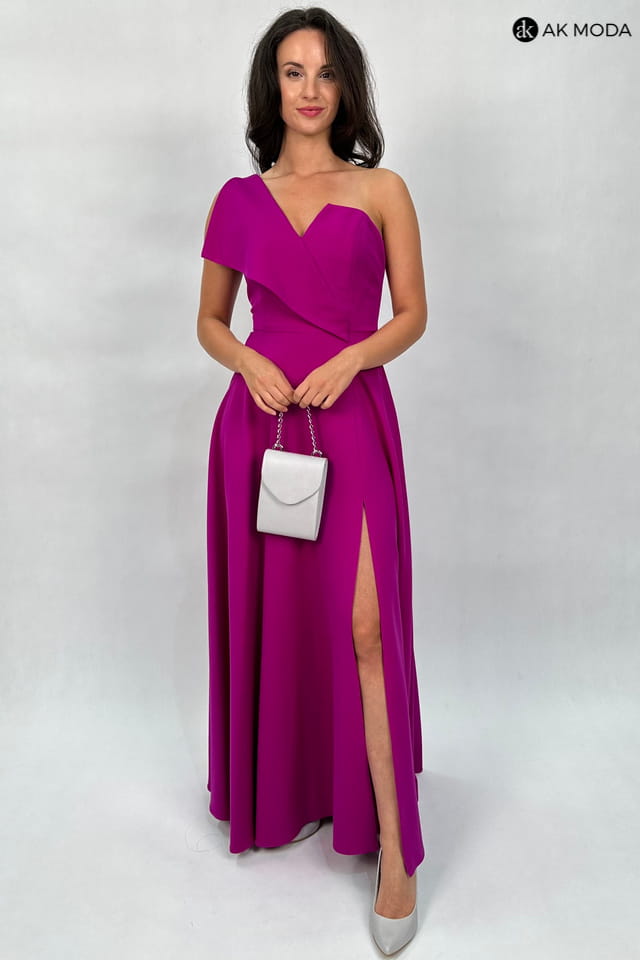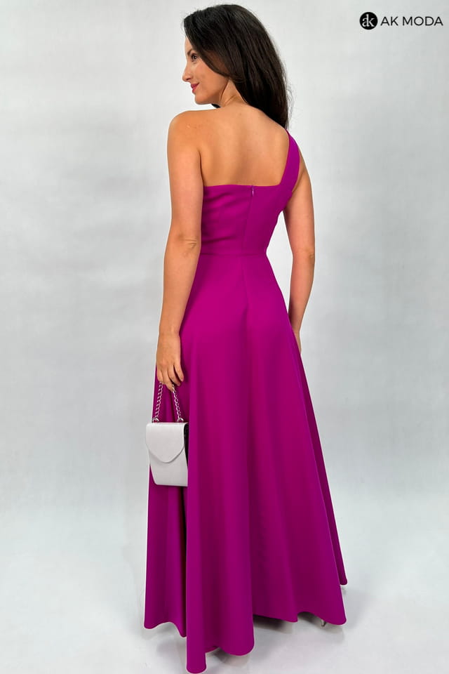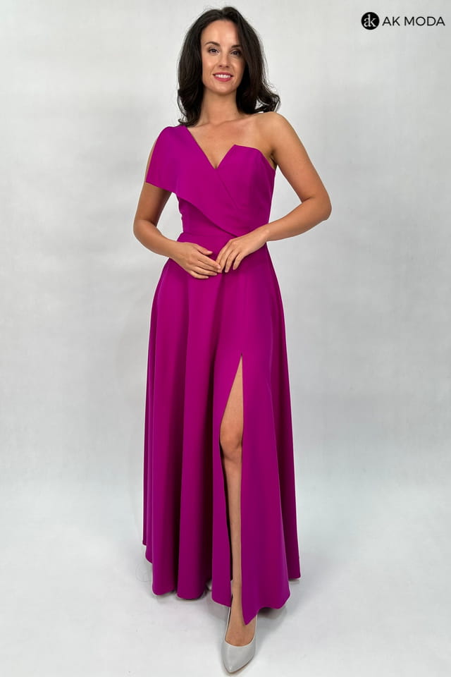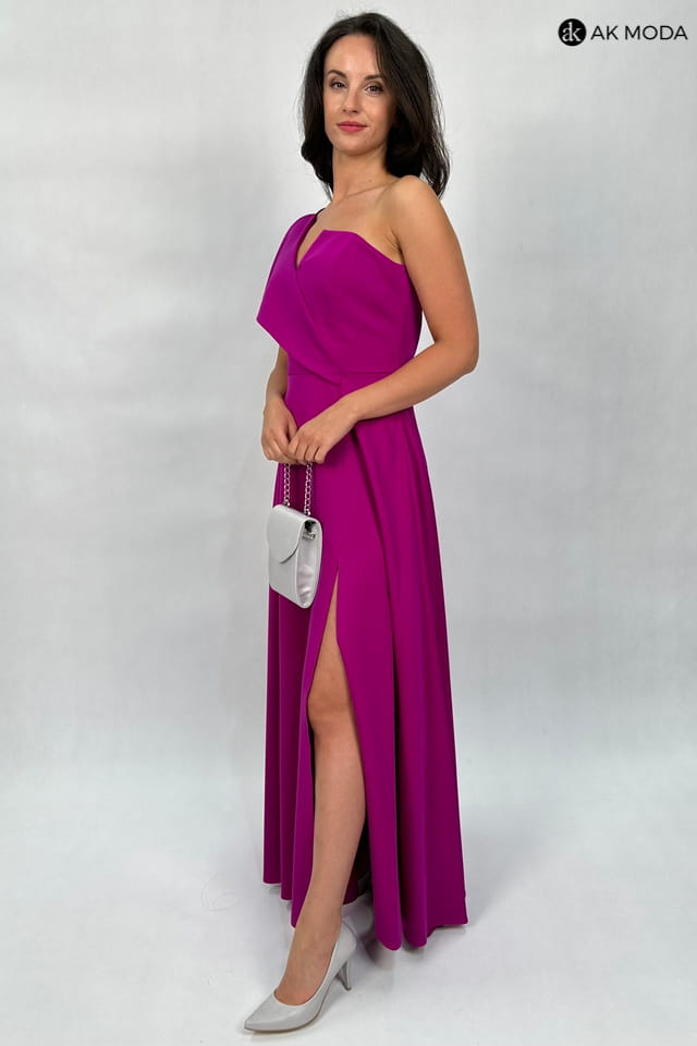 Elegancka długa sukienka w kolorze biskupim na jedno ramię. Dół rozkloszowany z rozcieciem z boku.
