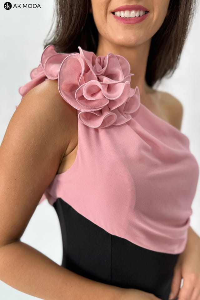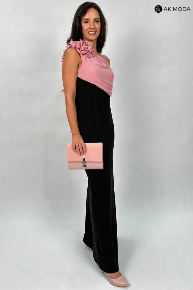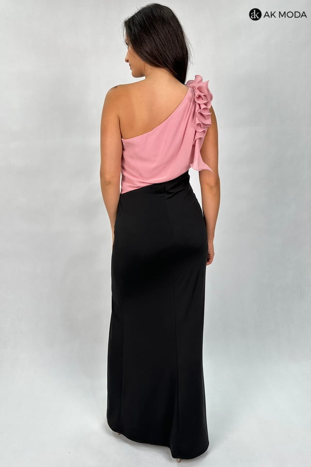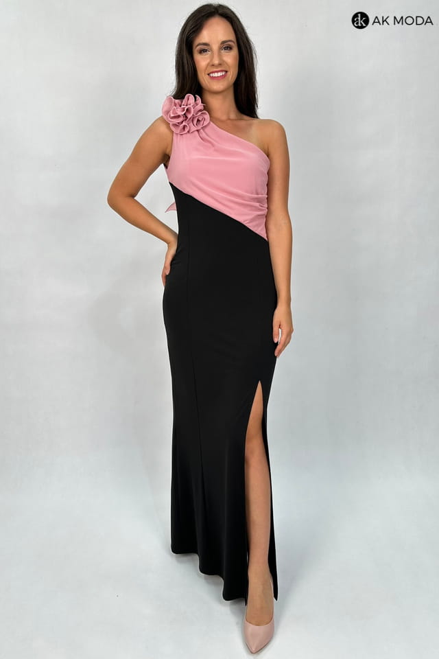 Długa, dopasowana sukienka na jedno ramię. Góra w kolorze różowym z ozdobnie upiętą falbanką na ramieniu, dół w kolorze czarnym z rozcięciem z boku.