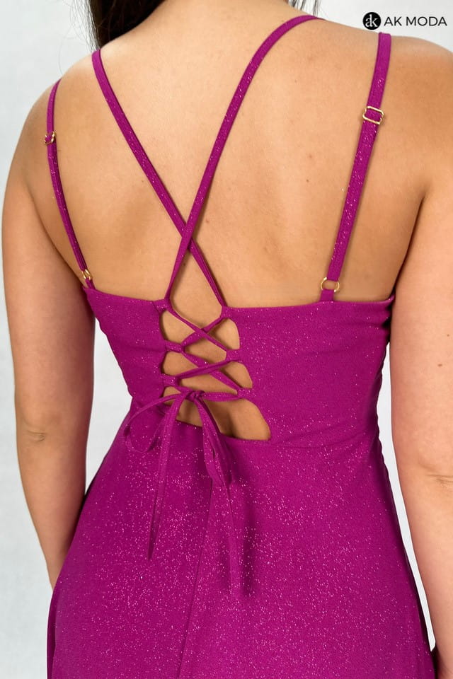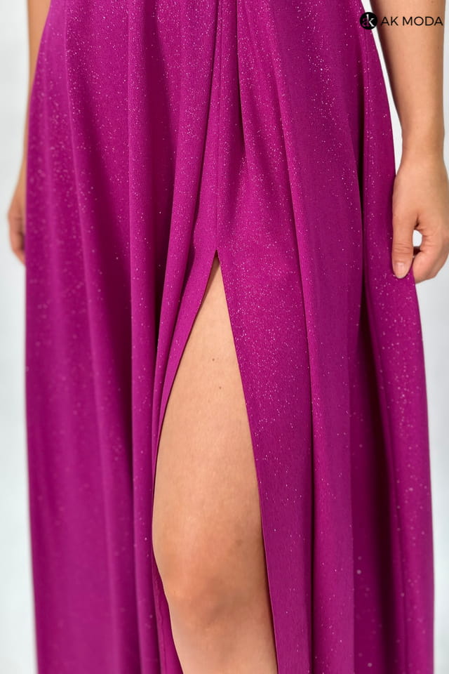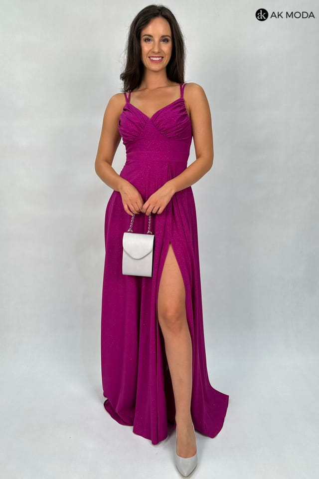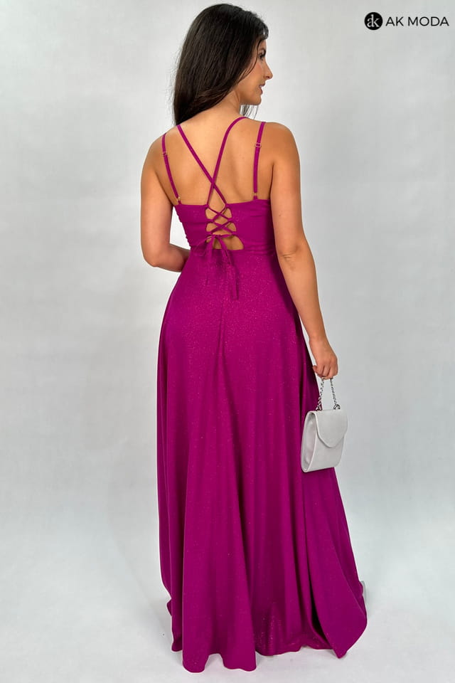 Długa rozkloszowana sukienka w kolorze fioletowym na cienkich regulowanych ramiączkach. Efektowne sznurowanie na plecach, na biuście marszczenia. Materiał brokatowy.