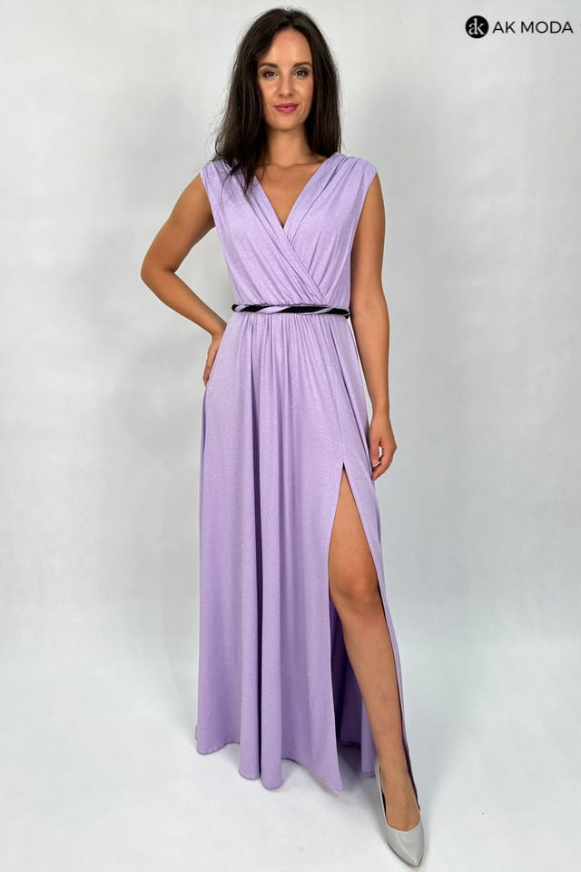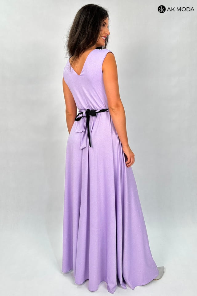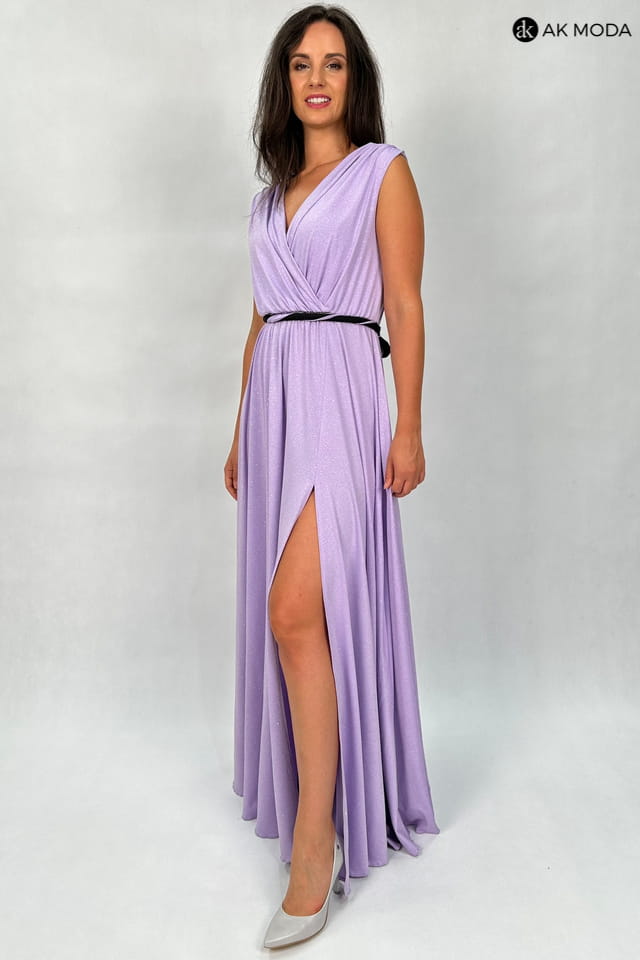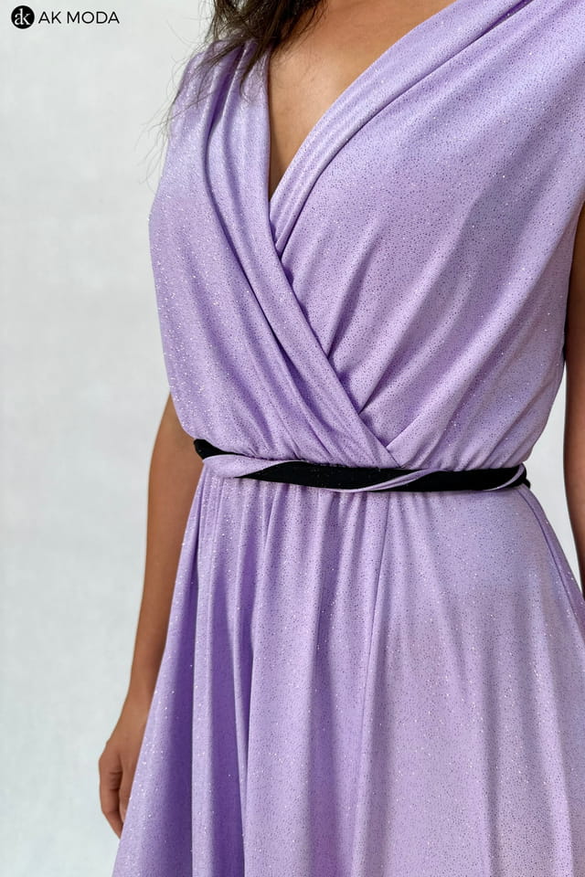 Długa rozkloszowana sukienka w kolorze fioletowym z drobinkami brokatu. Dekolt kopertowy, w pasie gumka. W komplecie dwa wiązane paski.