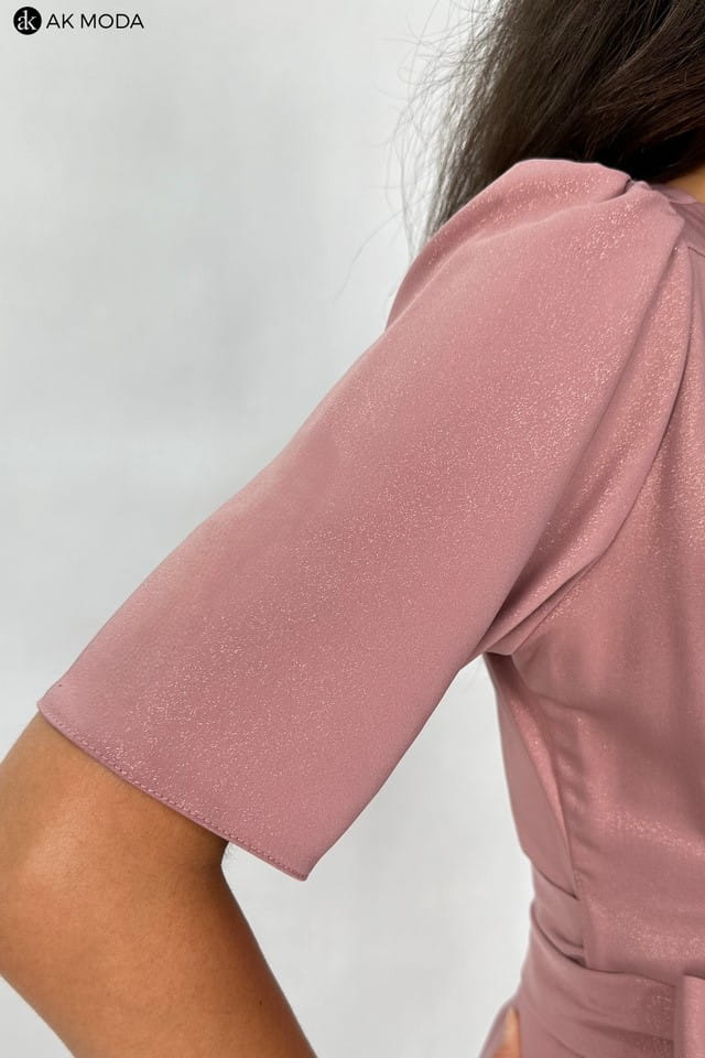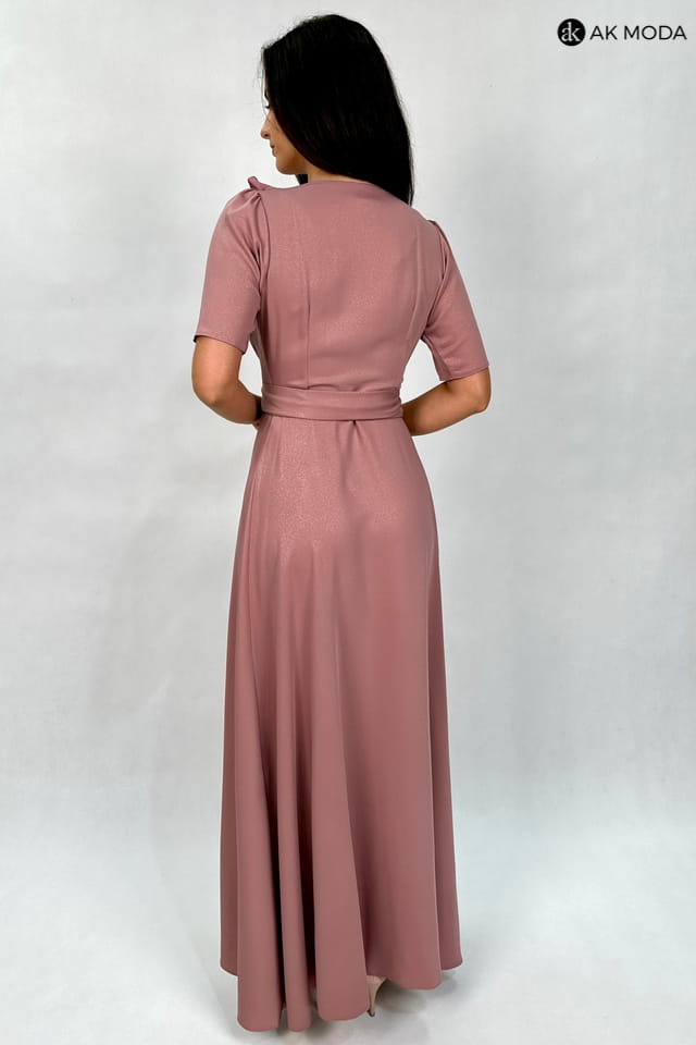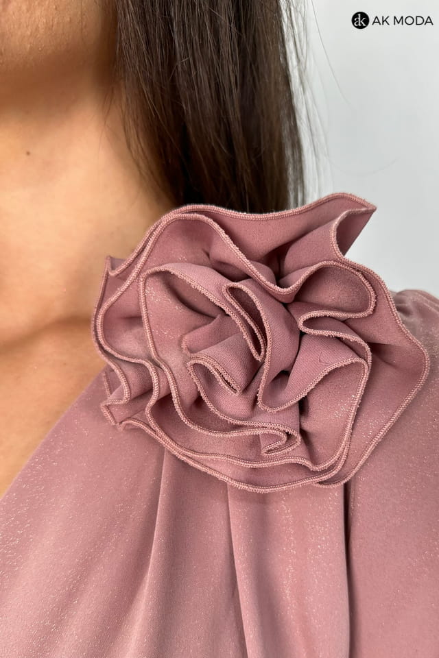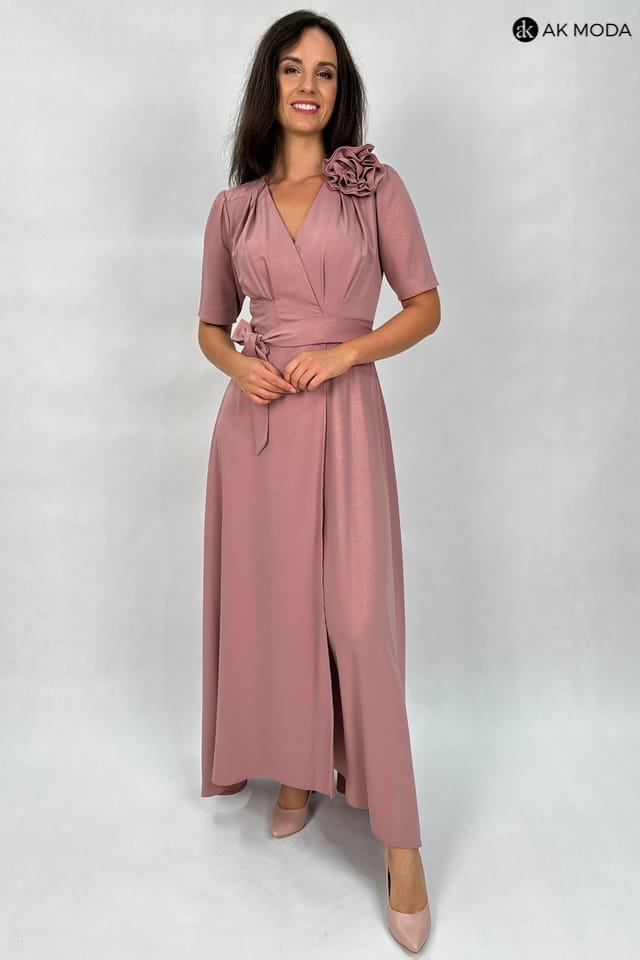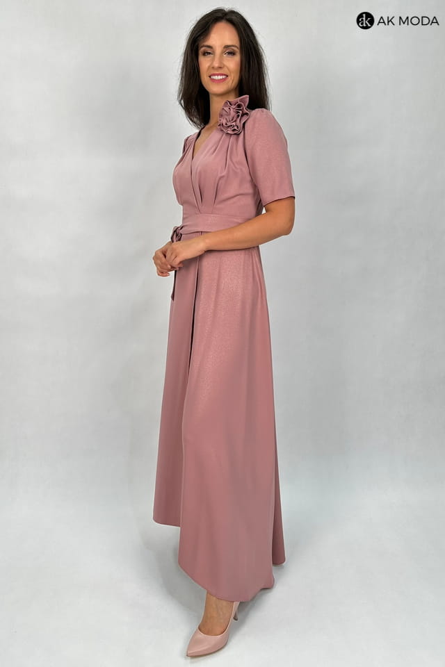 Długa, rozkloszowana sukienka w kolorze brudnego pudrowego różu, uszyta z delikatnie błyszczącego materiału. Fason kopertowy z lekko bufiastymi krótkimi rękawami, na ramieniu odpinany ozdobny kwiatek.