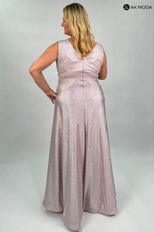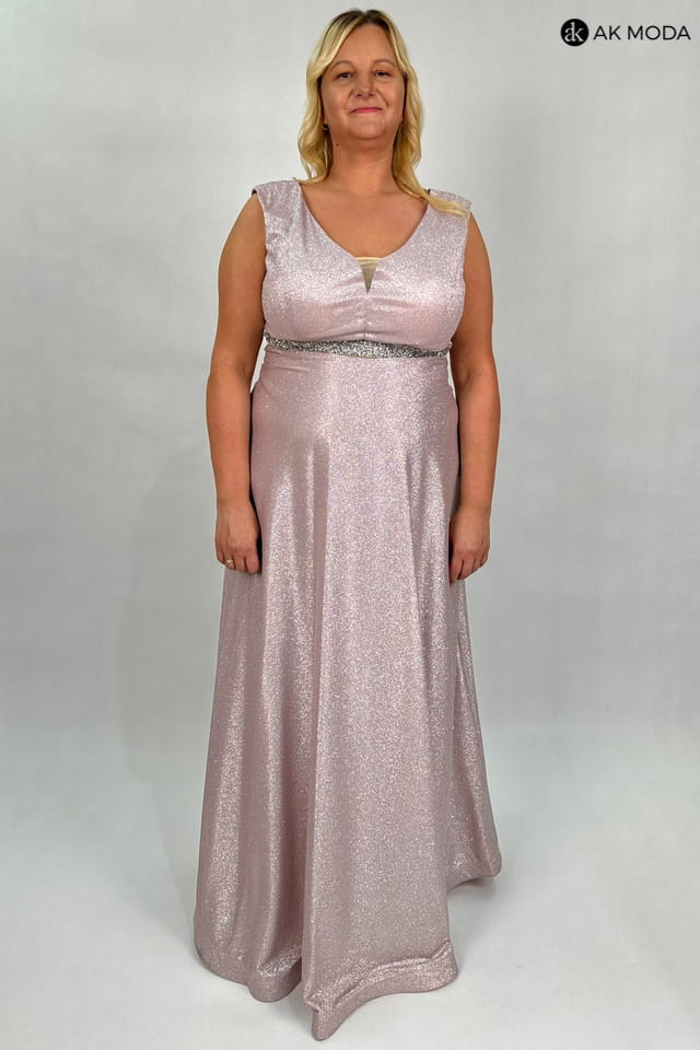 Rozkloszowana sukienka maxi w kolorze różowym z drobinkami brokatu. Dekolt w szpic z transparentną wstawką, w talii błyszczące kamyczki, dół sukienki usztywniony listwą. Sukienka posiada wszyte miseczki.