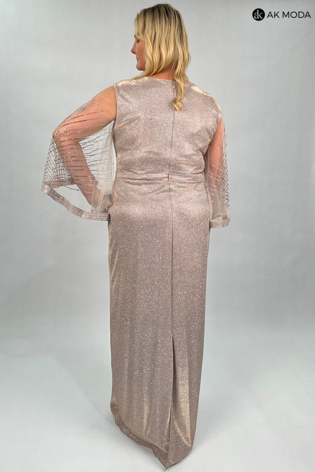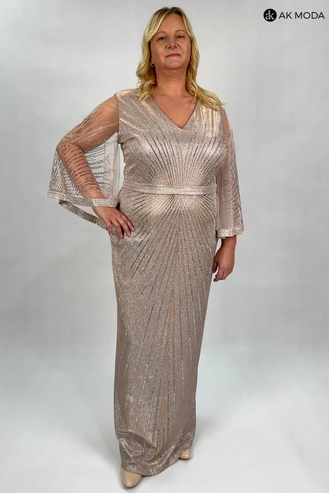 Prosta sukienka maxi w kolorze szampańskim. Dekolt w szpic, transparentny luźny rękaw 3/4 z cyrkoniami. Sukienka uszyta z brokatowego materiału, bogato zdobiona na całej długości. Model posiada wszyte miseczki.