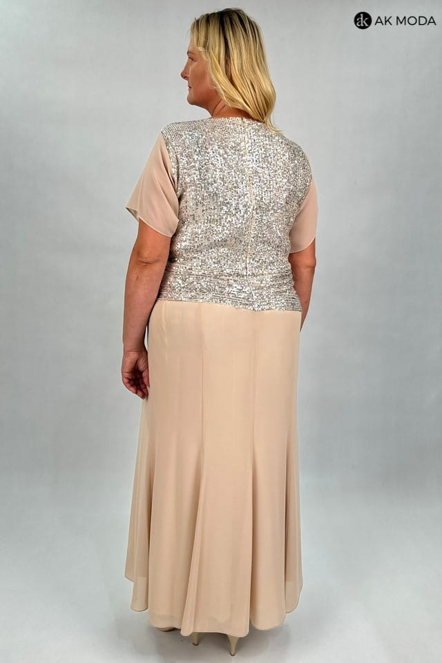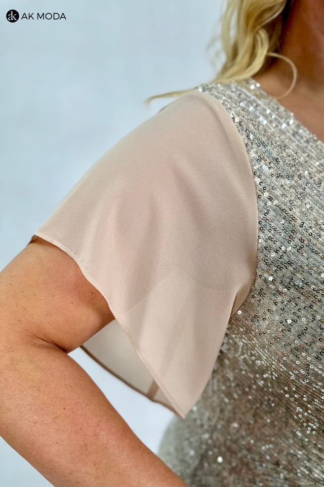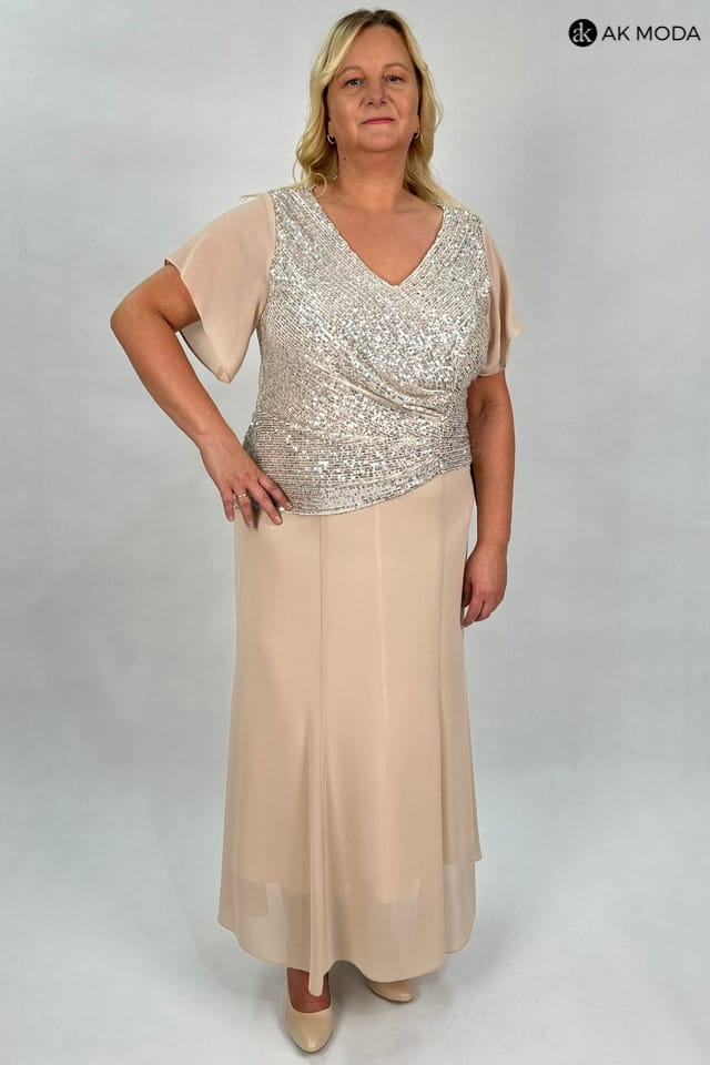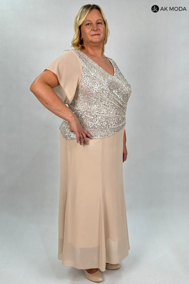 Rozkloszowana sukienka maxi w kolorze beżowym. Krótki transparentny rękaw, dekolt w szpic. Góra sukienki zdobiona cekinami, dół gładki.