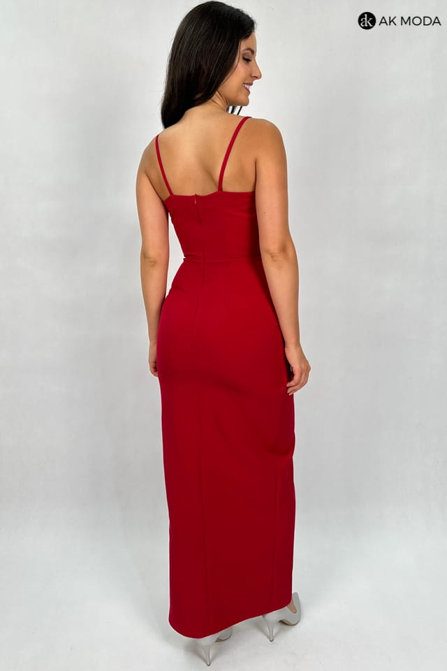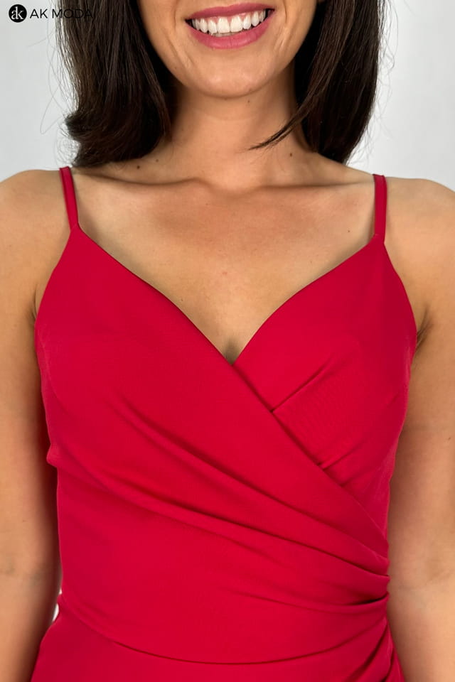 Prosta, długa sukienka na cienkich ramiączkach, w kolorze czerwonym. Dekolt kopertowy, w pasie marszczenie, rozcięcie z boku.